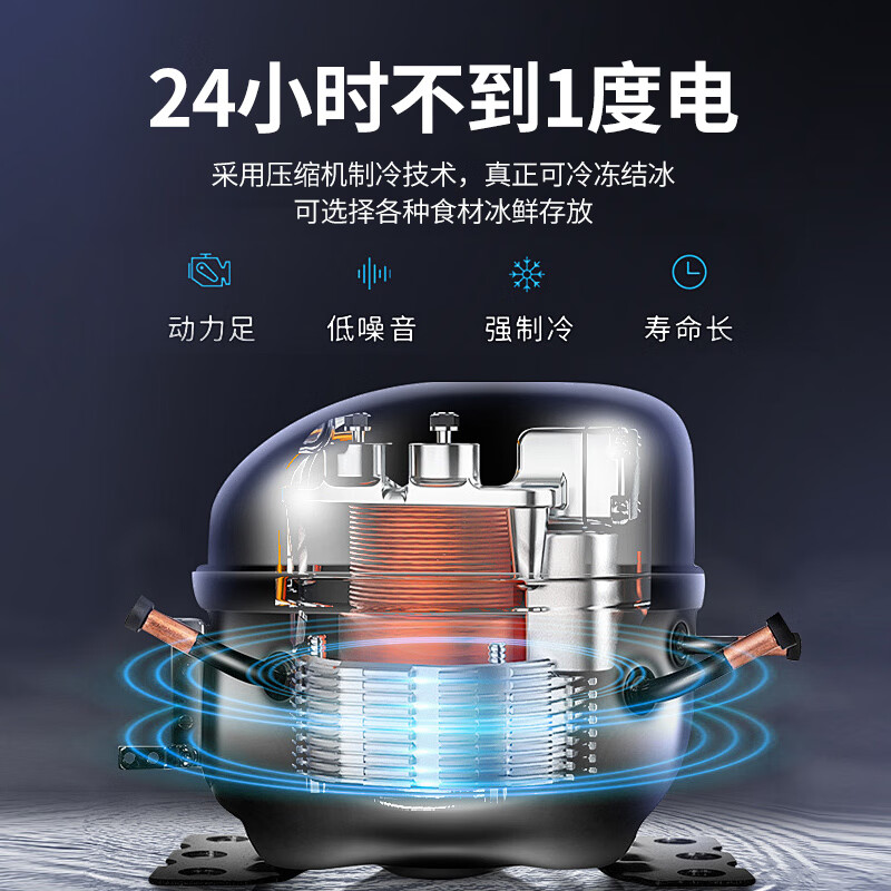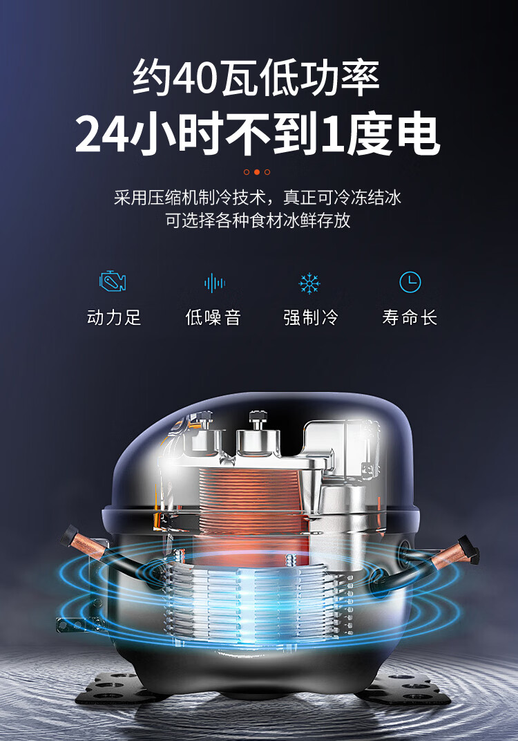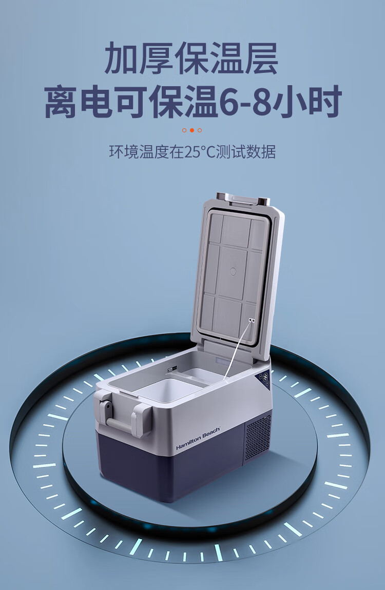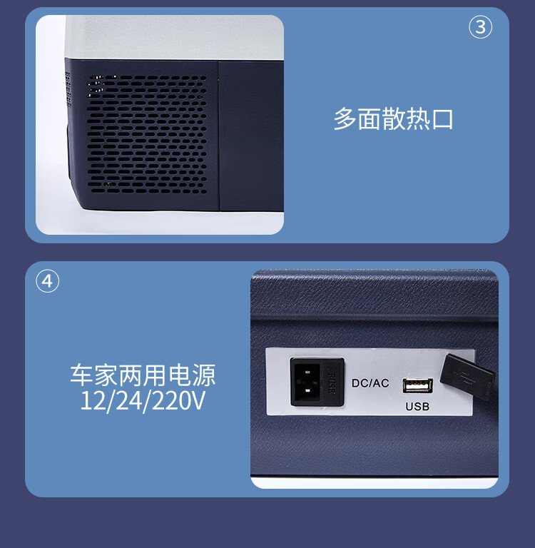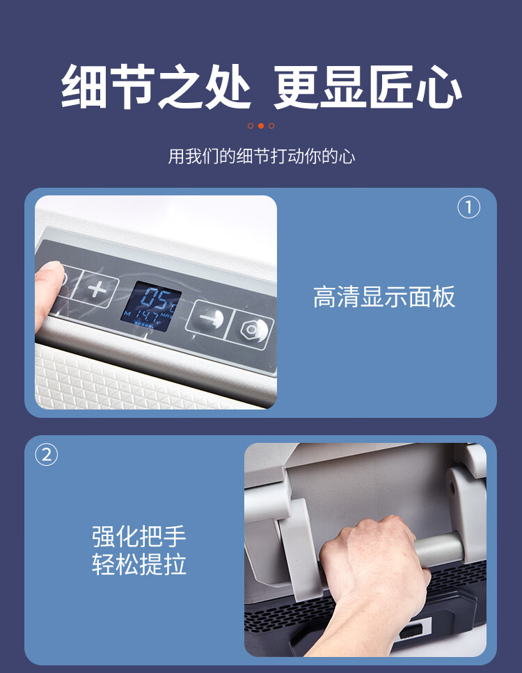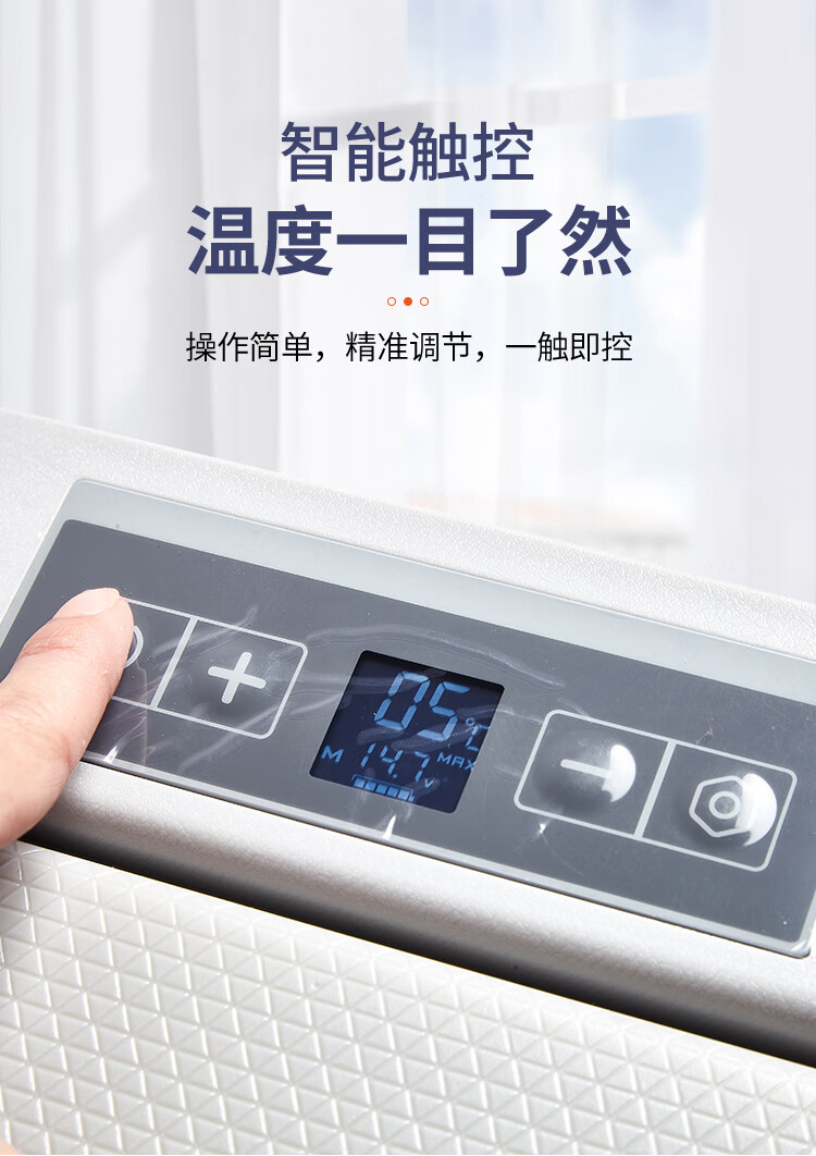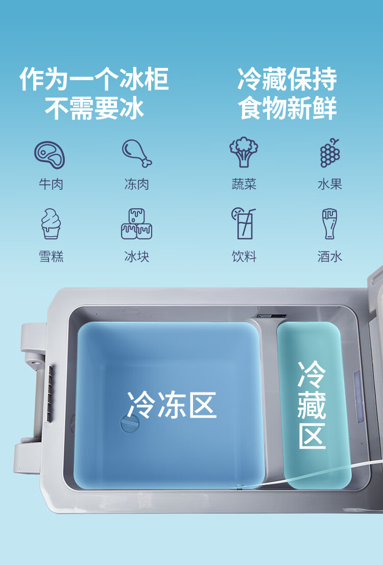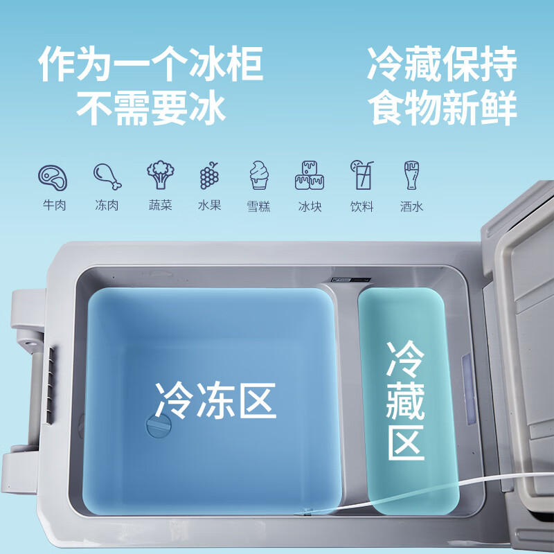加厚保温层,离电可保温6-8小时;车用12/24V电压支持多场景使用;冷藏冷冻分区收纳,品牌压缩机,快速制冷急冻;高清数显面板,智能触控,内嵌LED,无惧黑夜;低功率,24小时不到1度电