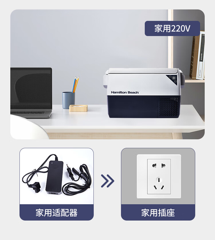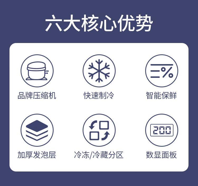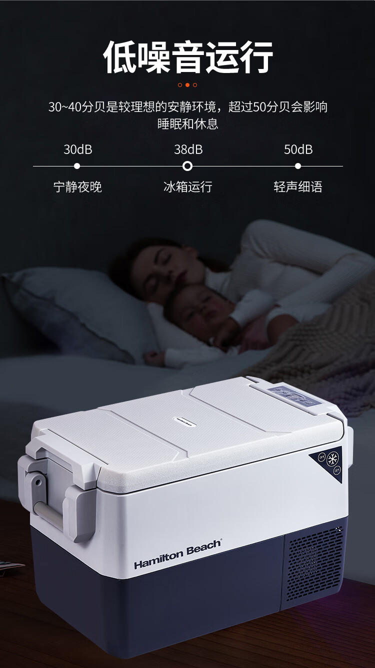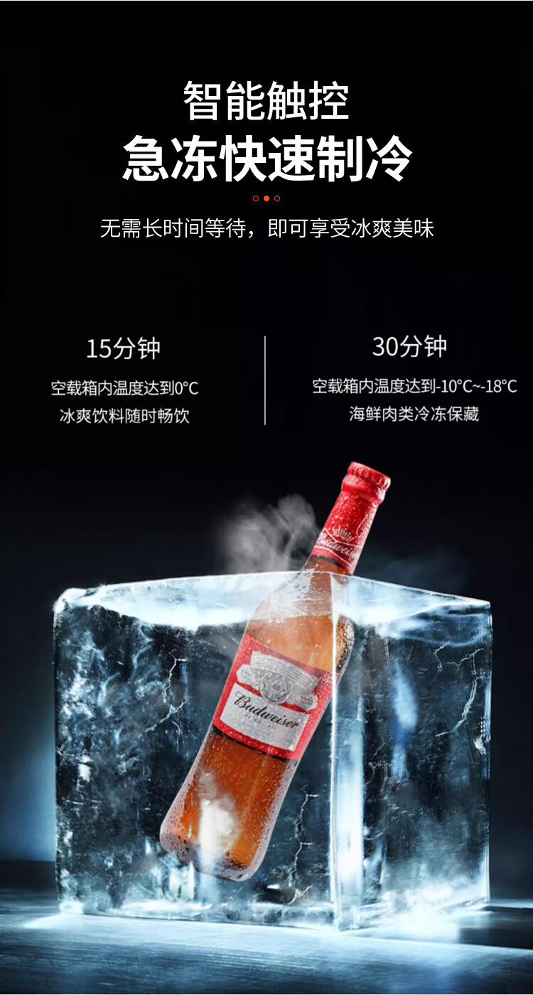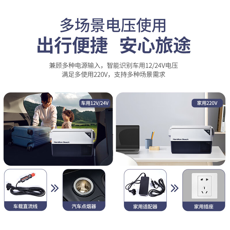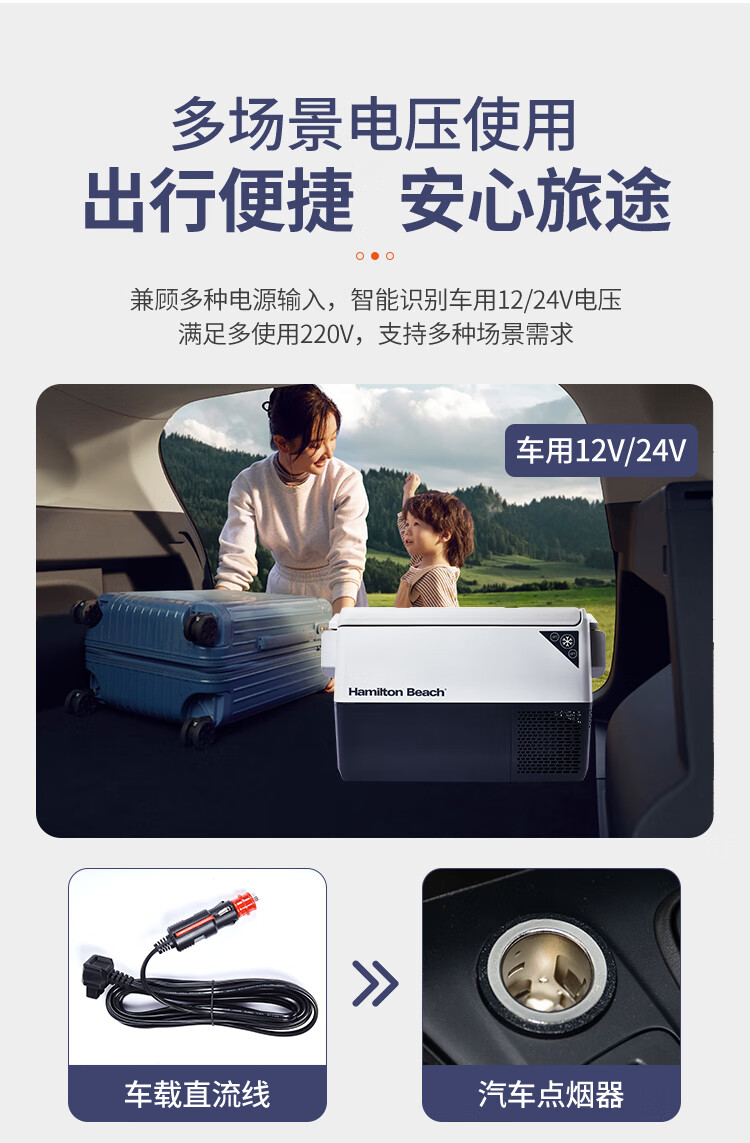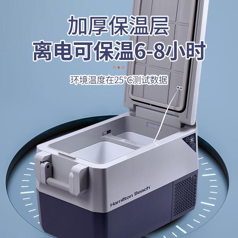 加厚保温层,离电可保温6-8小时;车用12/24V电压支持多场景使用;冷藏冷冻分区收纳,品牌压缩机,快速制冷急冻;高清数显面板,智能触控,内嵌LED,无惧黑夜;低功率,24小时不到1度电