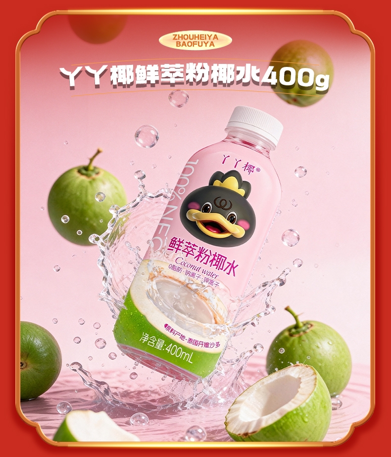 配置清单:周黑鸭手撕鸡脖(麻辣甜)40g 周黑鸭麻辣鸡丝60g 周黑鸭甜辣鸭锁骨62g 周小伴麻辣豆皮60g 丫丫椰鲜萃粉椰水400g