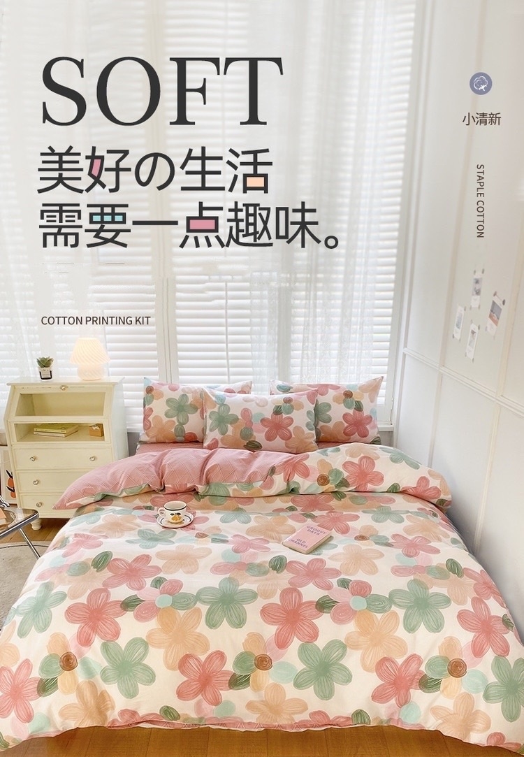 亲赴舒适,四季可用;活性印染,不退色不缩水;ab版小清新搭配,使床品更高级