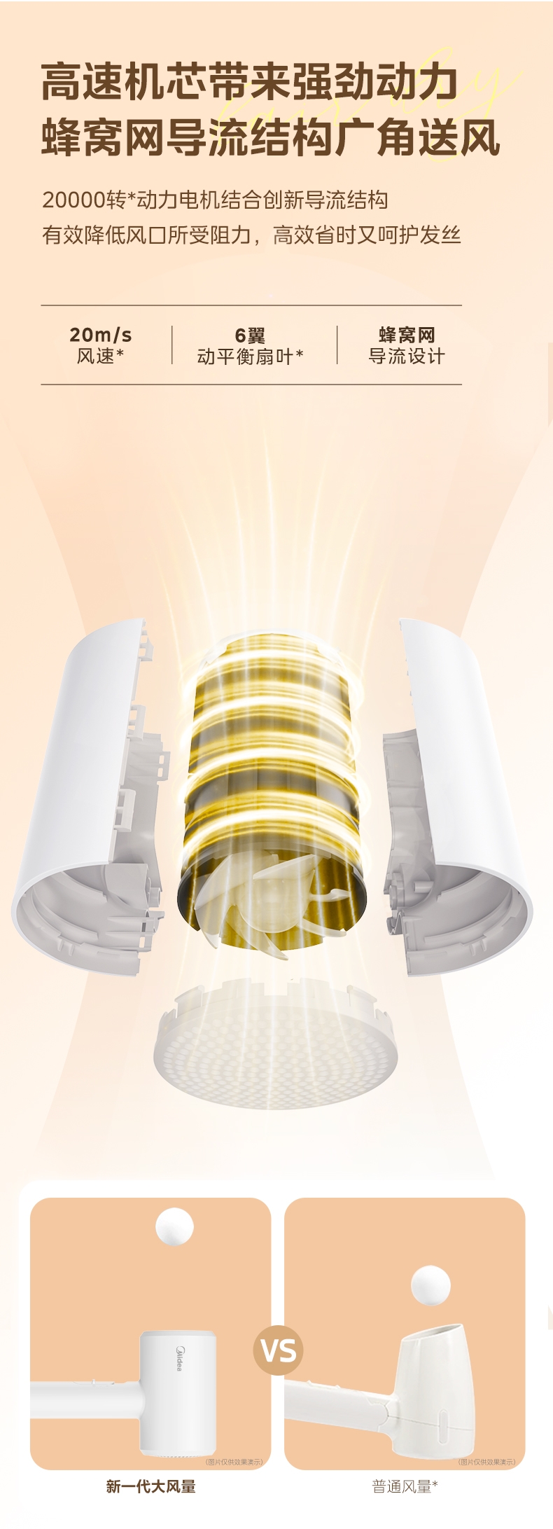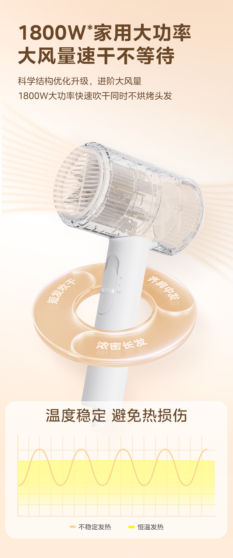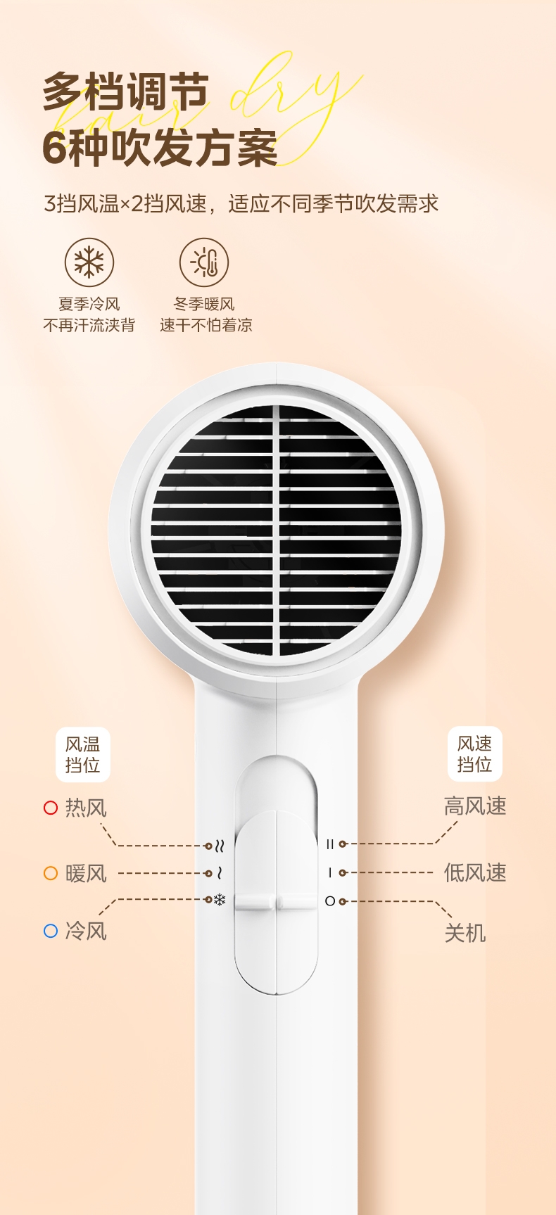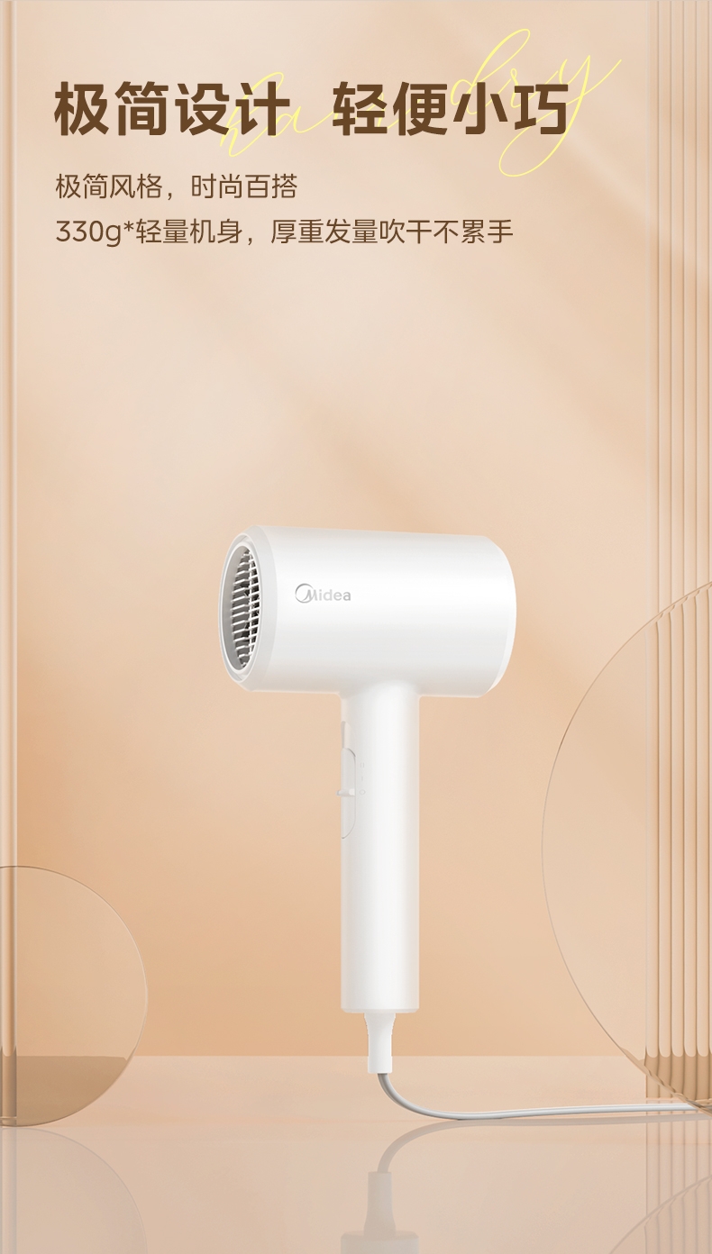 极简风格,时尚百搭330g*轻量机身,厚重发量吹干;20000转*动力,高效省时又呵护发丝;6种吹发方案,3挡风温x2挡风速