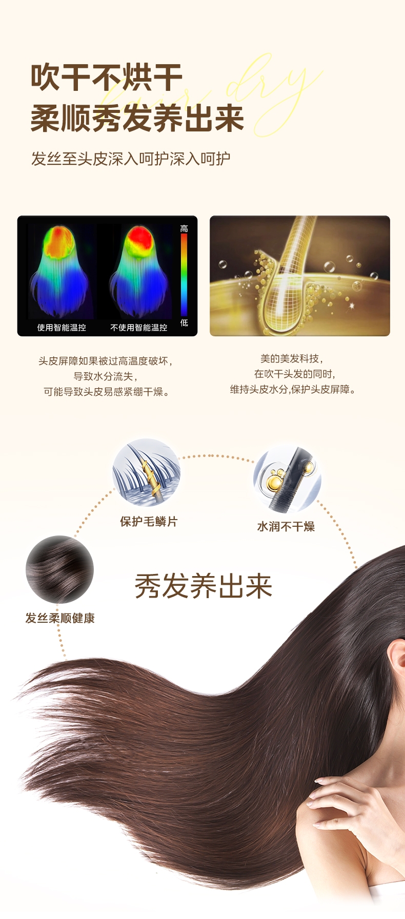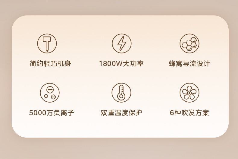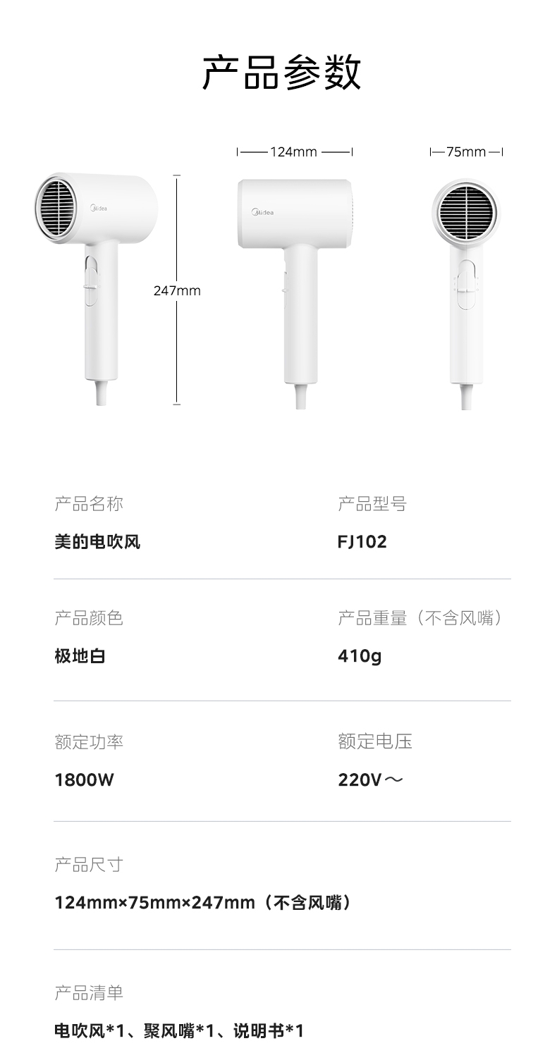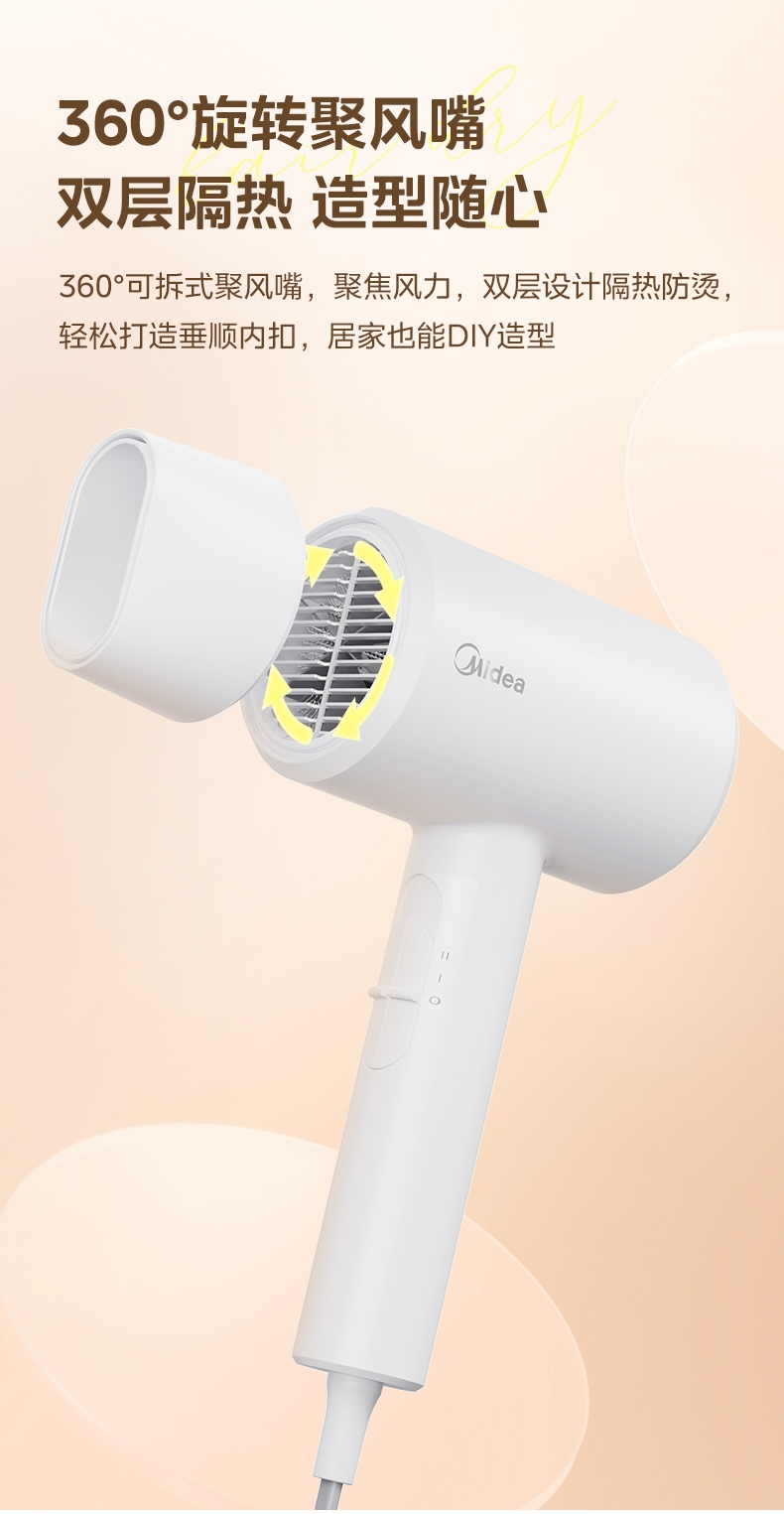 极简风格,时尚百搭330g*轻量机身,厚重发量吹干;20000转*动力,高效省时又呵护发丝;6种吹发方案,3挡风温x2挡风速