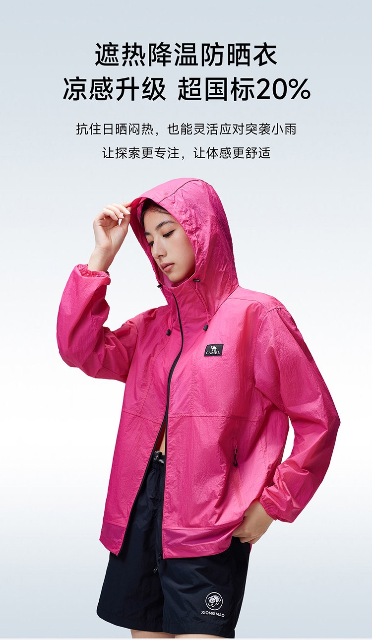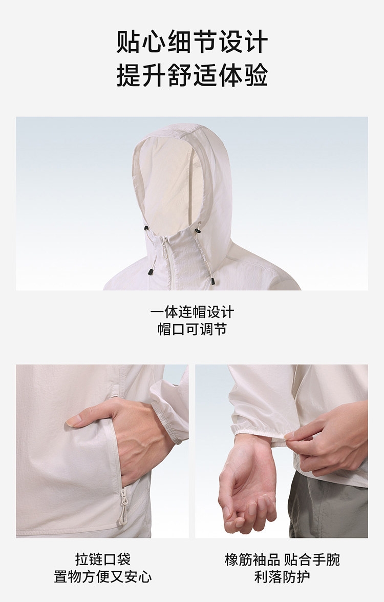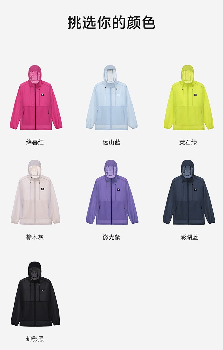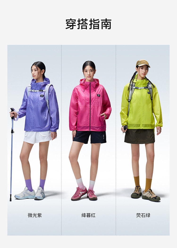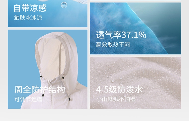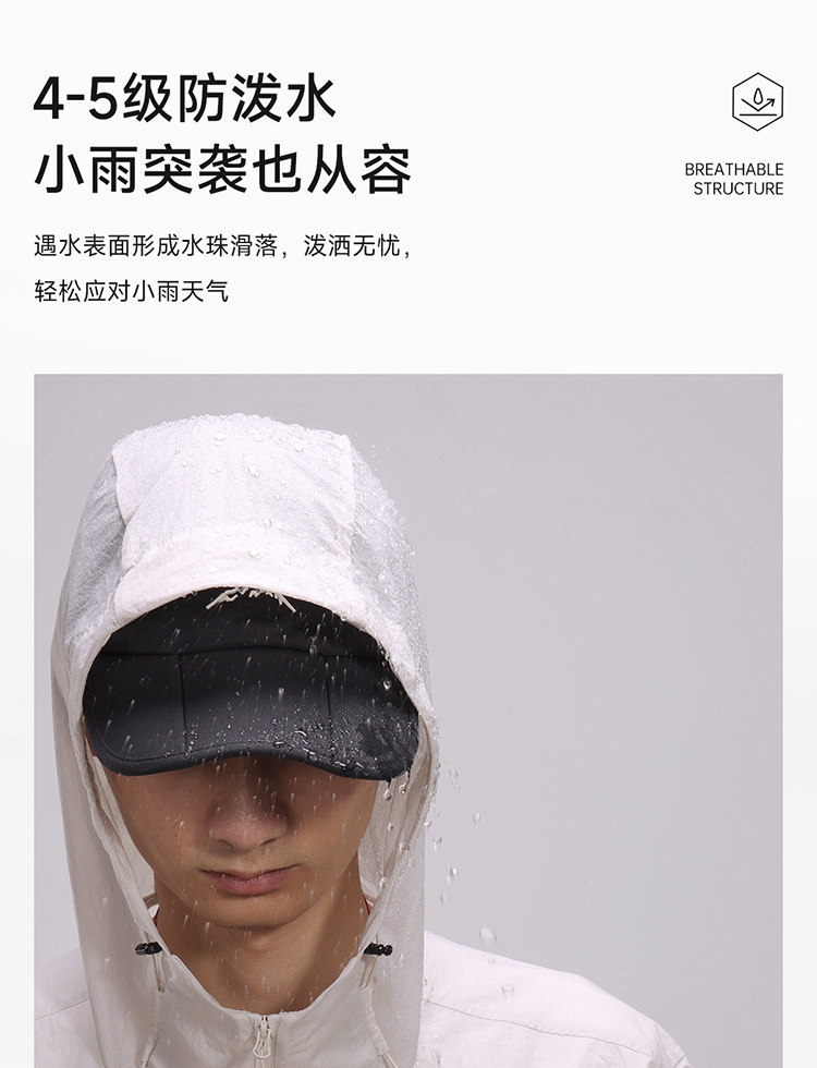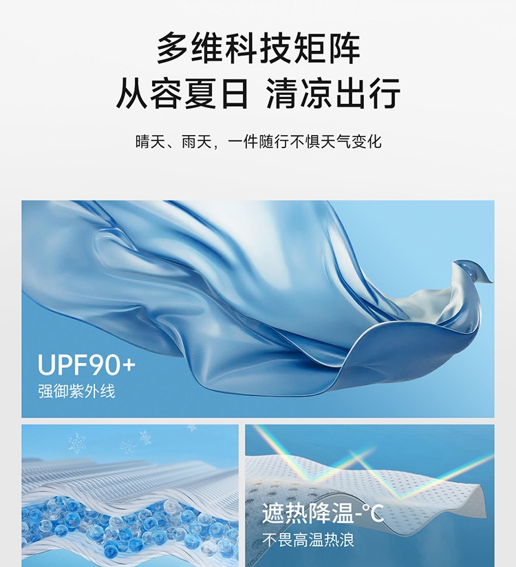 多维科技矩阵从容夏日 清凉出行;面料经防晒科技处理,具备长效抵御紫外线性能;4-5级防泼水,小雨突袭也从容