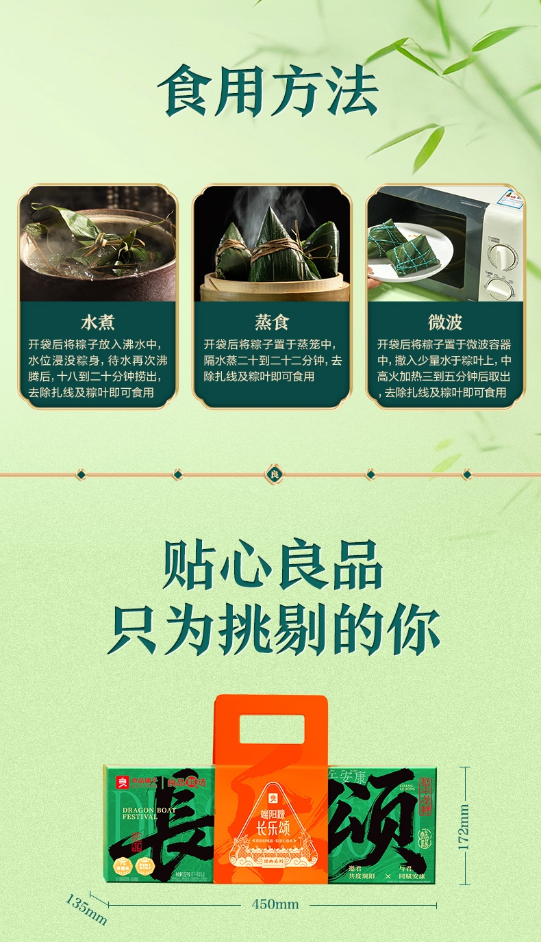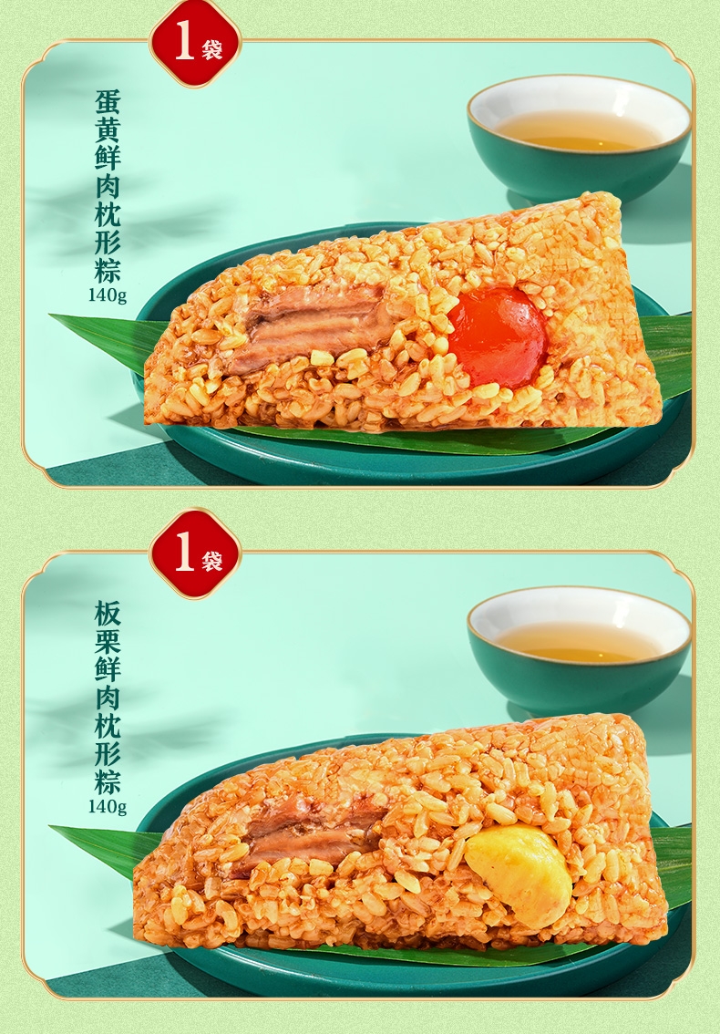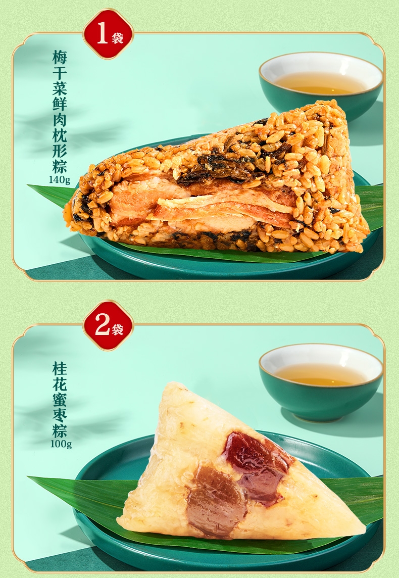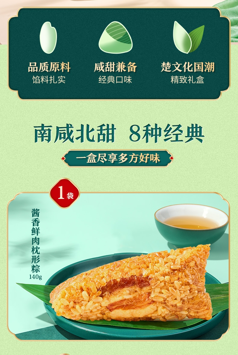 传承老味;突破传统三角粽形态,形似饱满小枕头;扁平长条的形状,拿取更顺手,食用时不易散落,吃相优