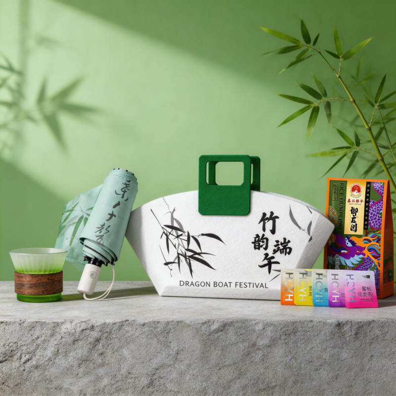 礼盒配置:竹韵手提毛毡包*1、竹节渐变茶杯*1 花茶包*5、竹韵自动雨伞*1 御庄园粽子*1