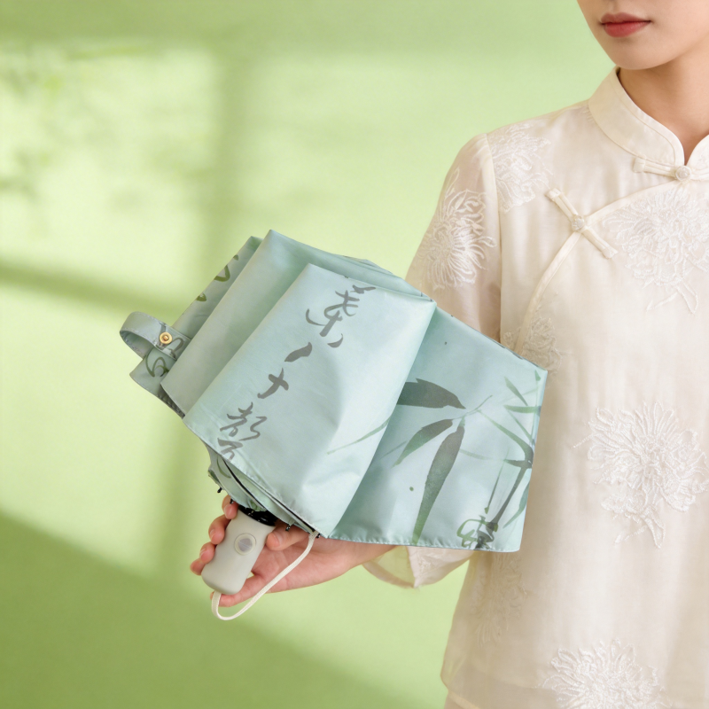 竹韵自动雨伞:三折自动 材质: 黑胶 尺寸:28公分