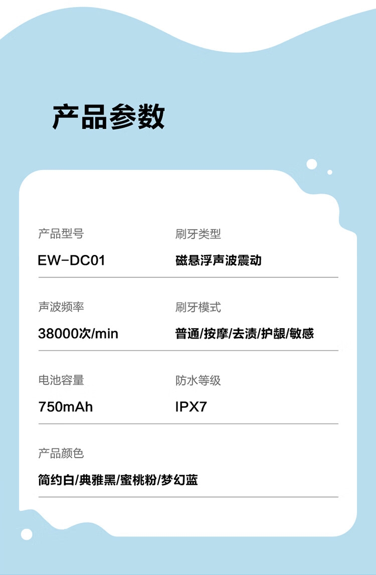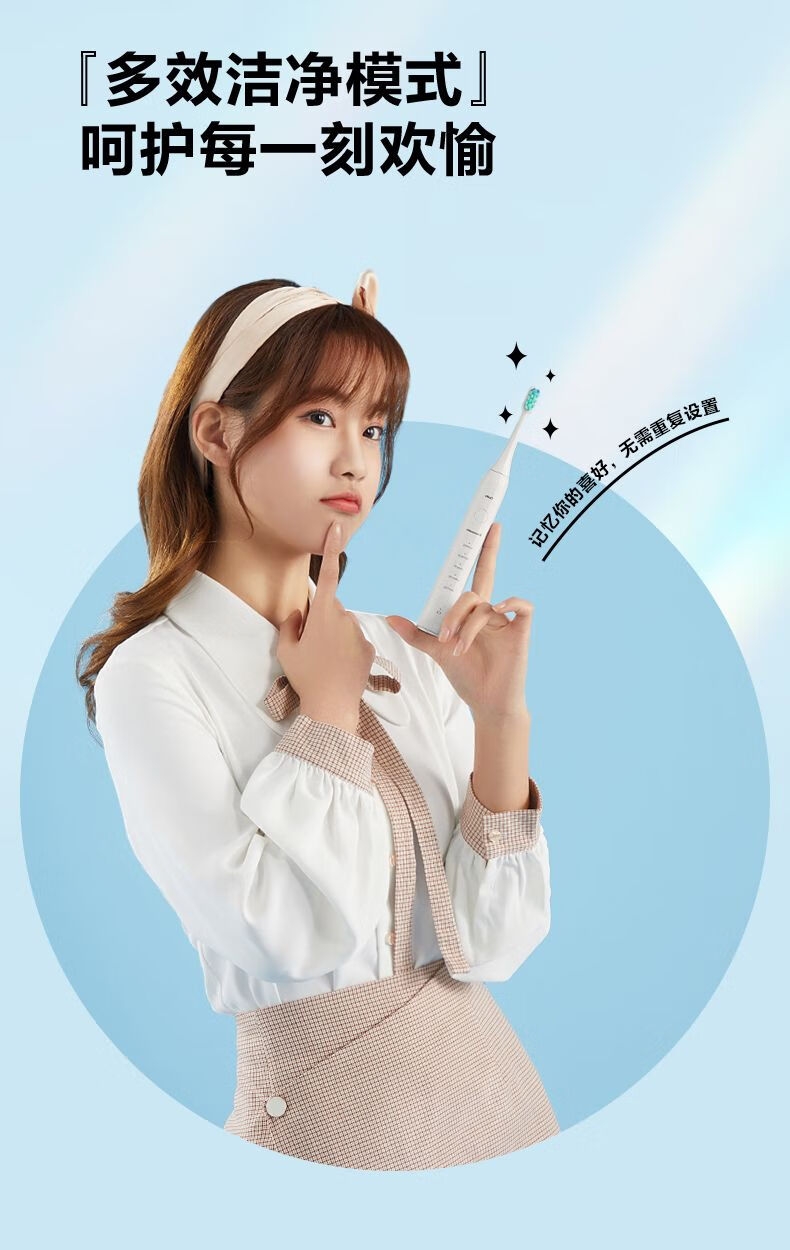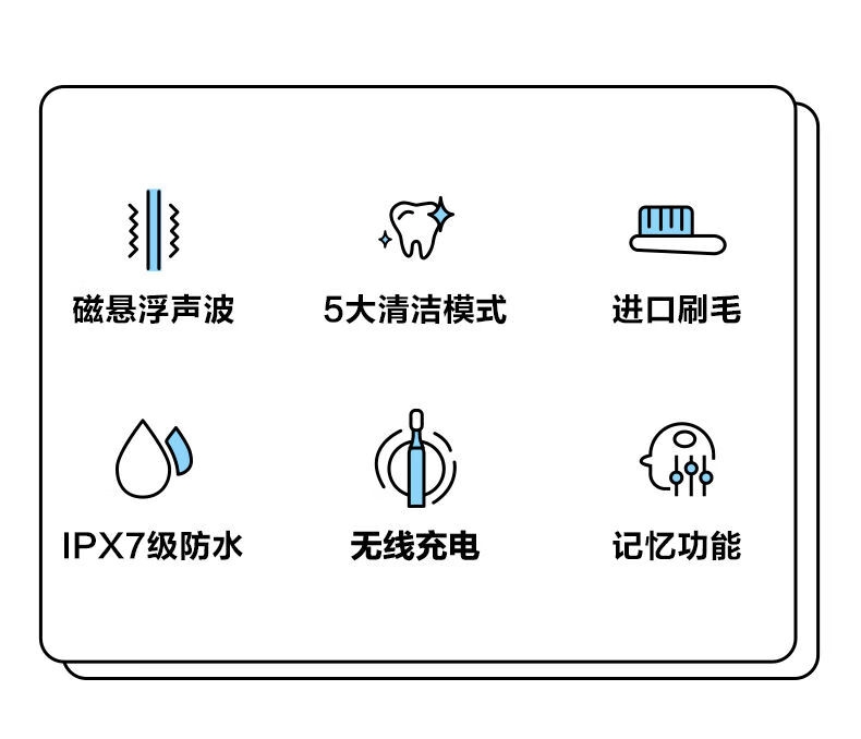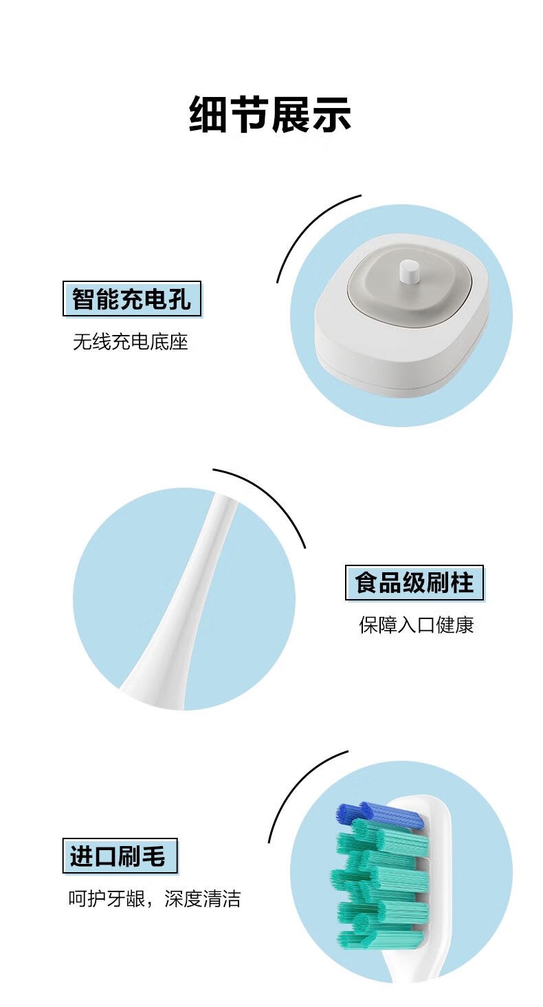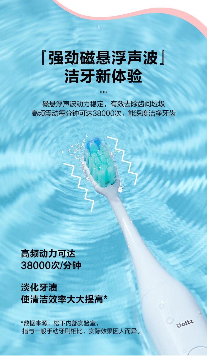 磁悬浮声波技术,清洁同时不伤牙,约38000转/分;5种洁齿模式,轻松应对各种问题;充满一次可用30天+,方向出差旅行