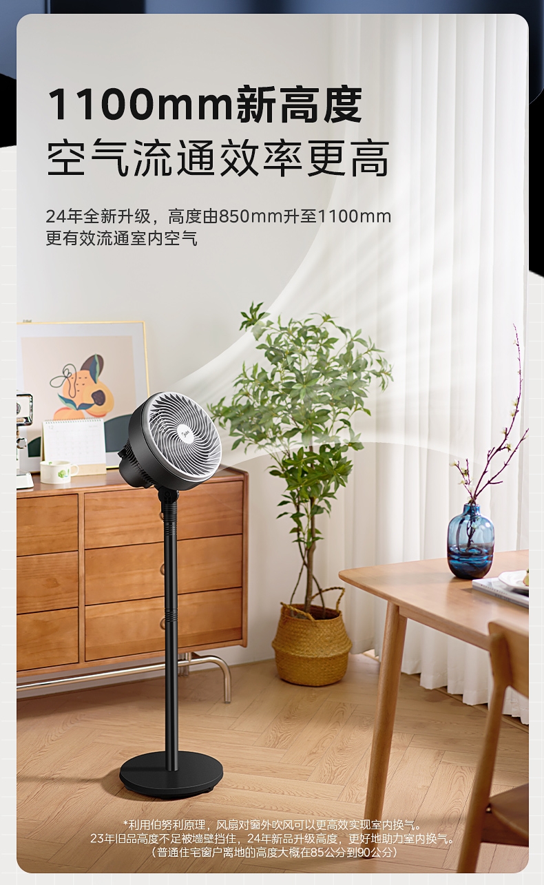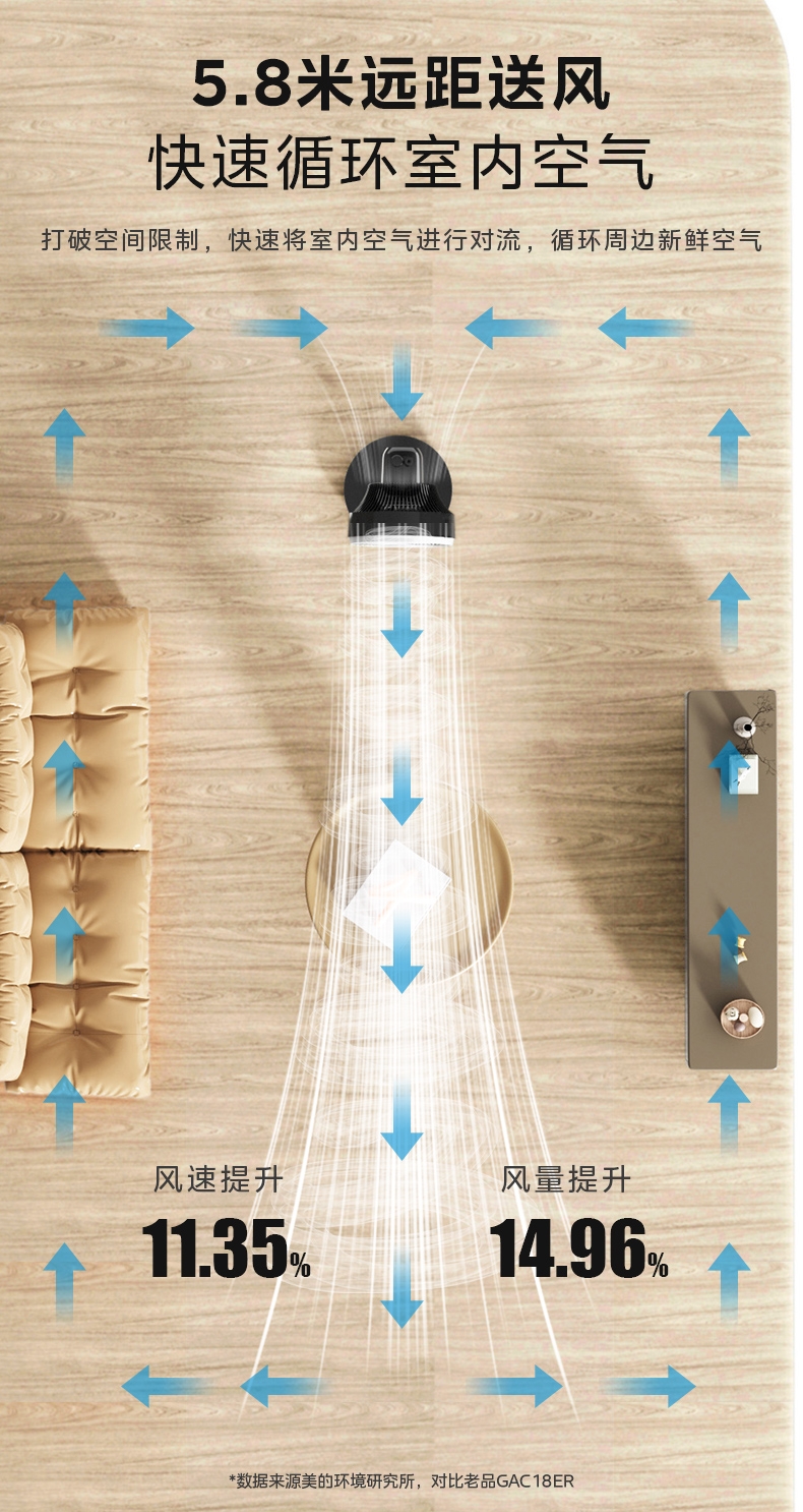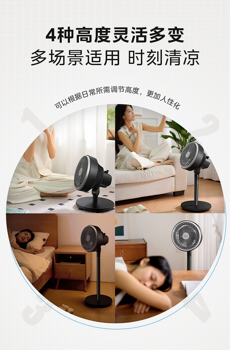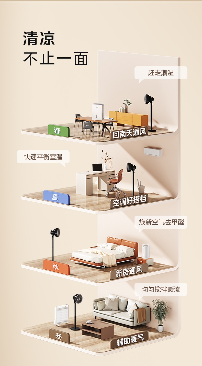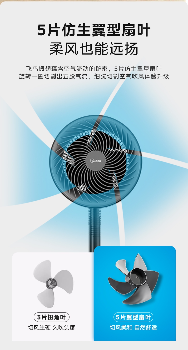 创新五叶扇叶,劲风亦柔;;广域循环送风,左右85°自动摇头,上下72°俯仰;;灵活多变,台地两用时刻清凉;
