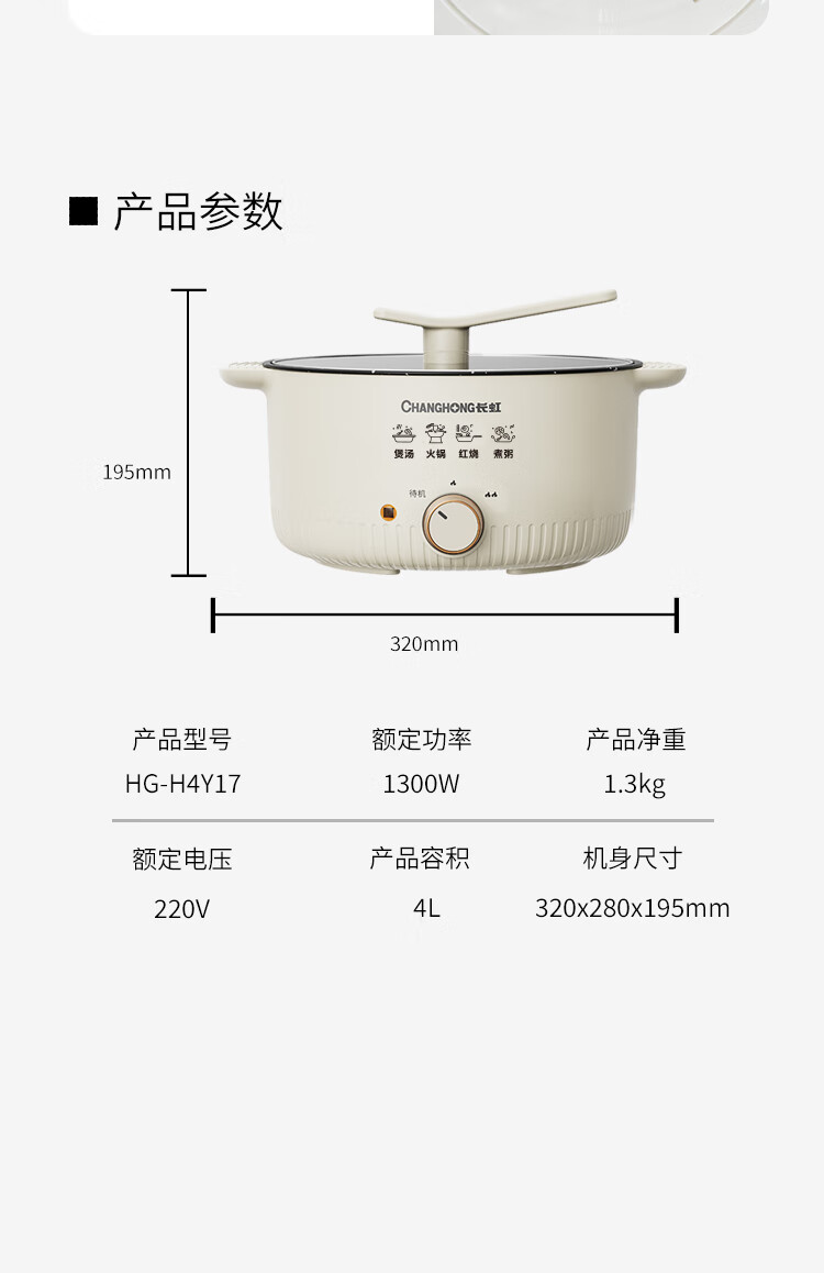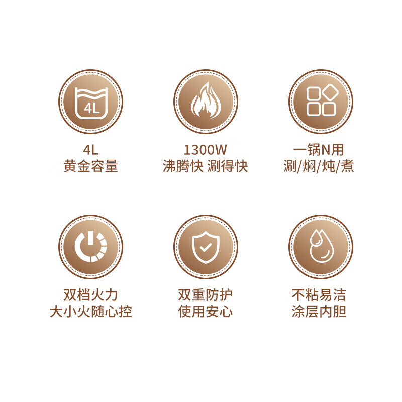 一锅多用,煎/炒/焖/煮/炖/涮;4L容量,可1-4人使用;1300W两档火力可调;不粘锅涂层,易清洁不粘锅;
