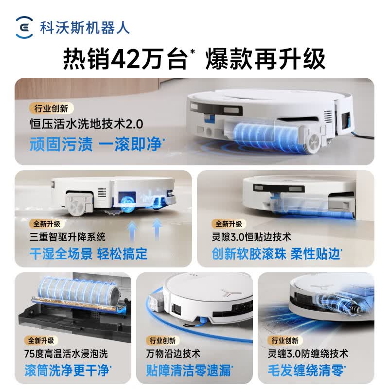 高密度尼龙丝滚筒,高效瓦解顽垢,不伤地板;三重智能升降,干湿场景全搞定;24800Pa超强吸力