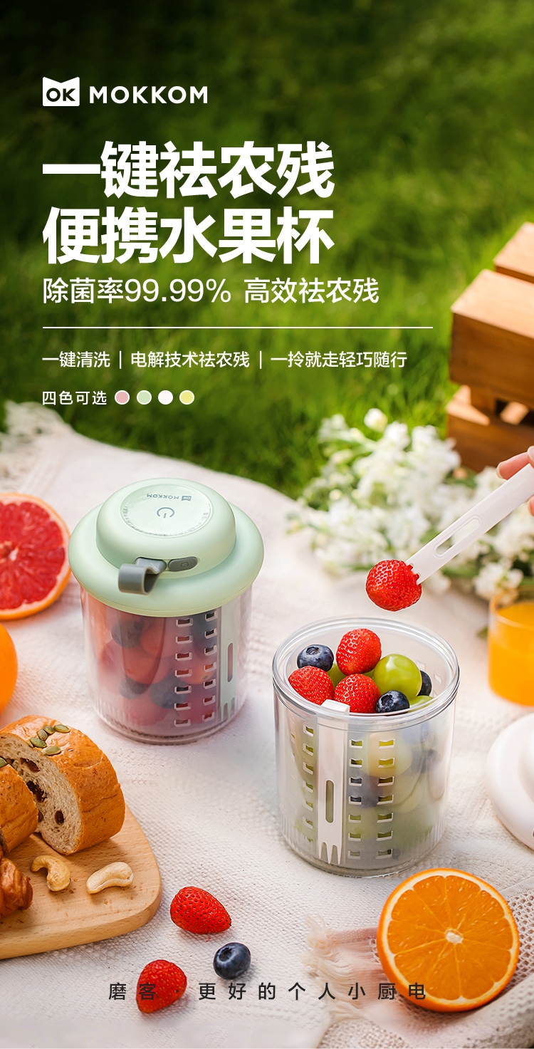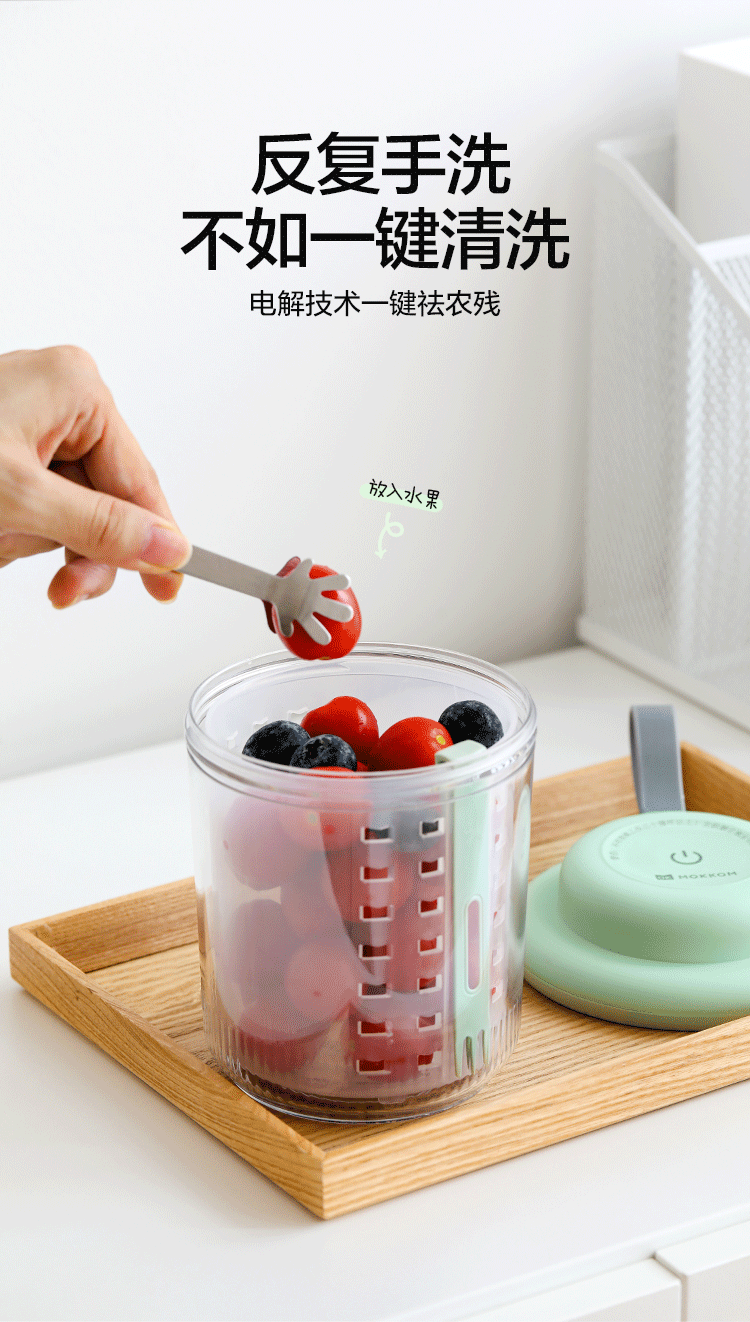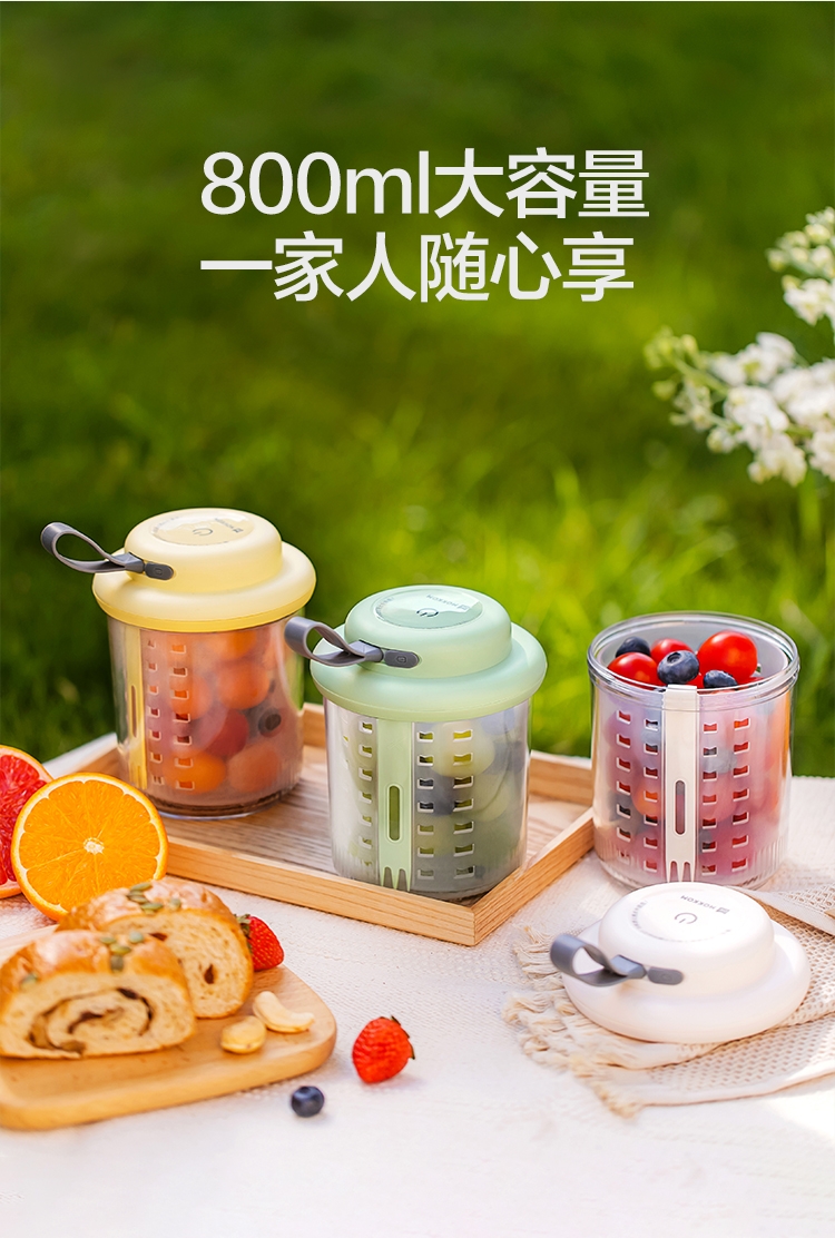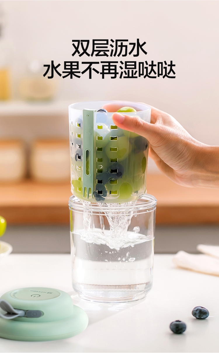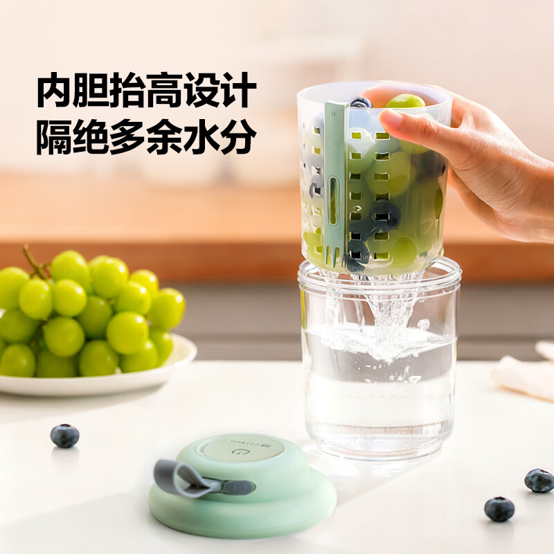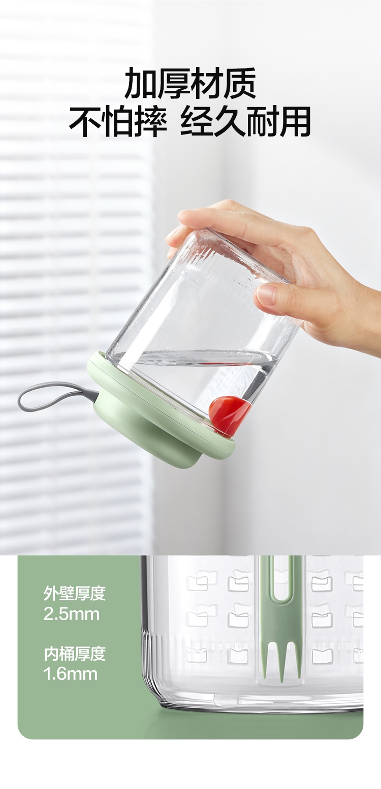 电解技术,一键祛农残;迷你小巧。800mL大容量;双层沥水,密封防漏。