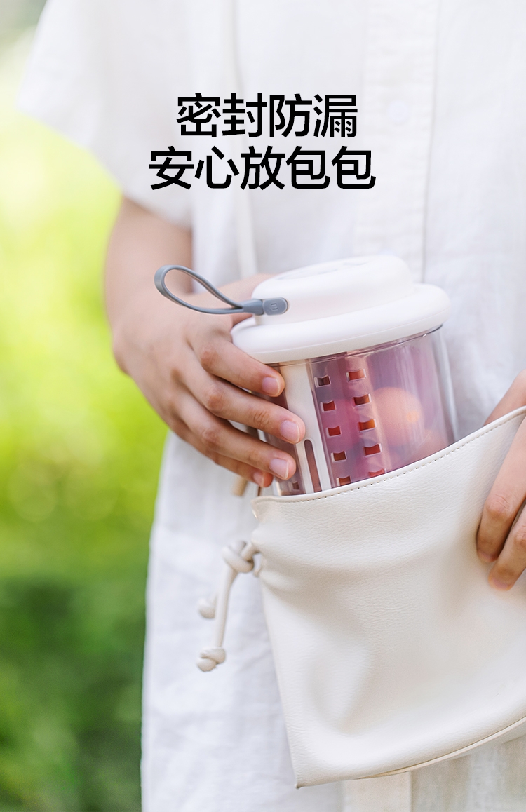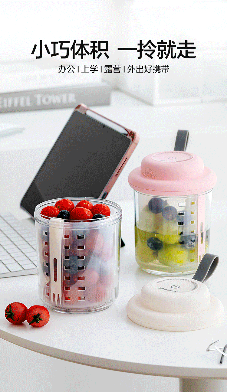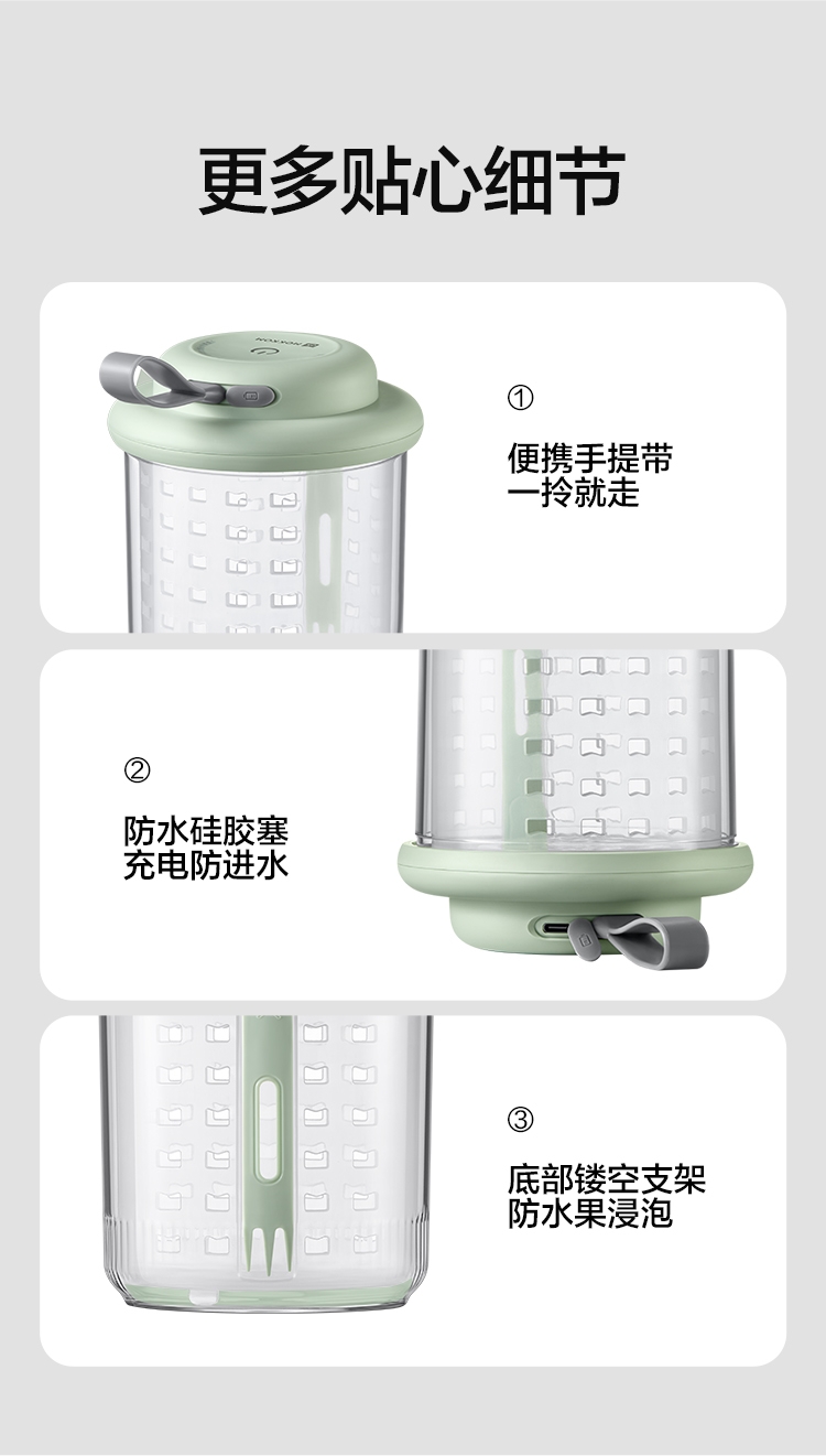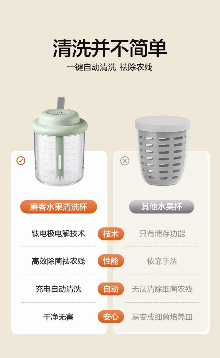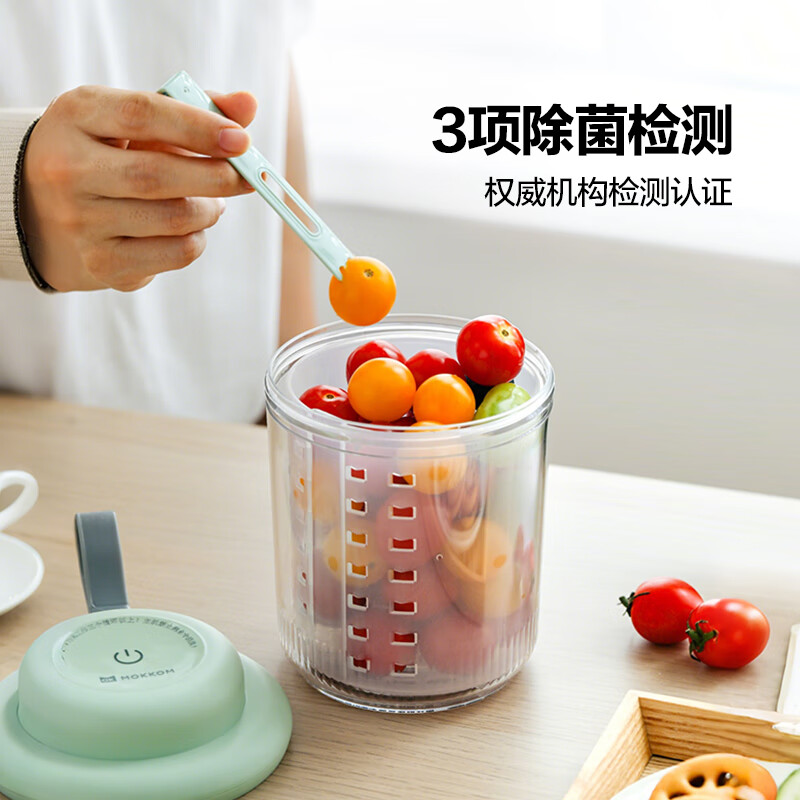 电解技术,一键祛农残;迷你小巧。800mL大容量;双层沥水,密封防漏。