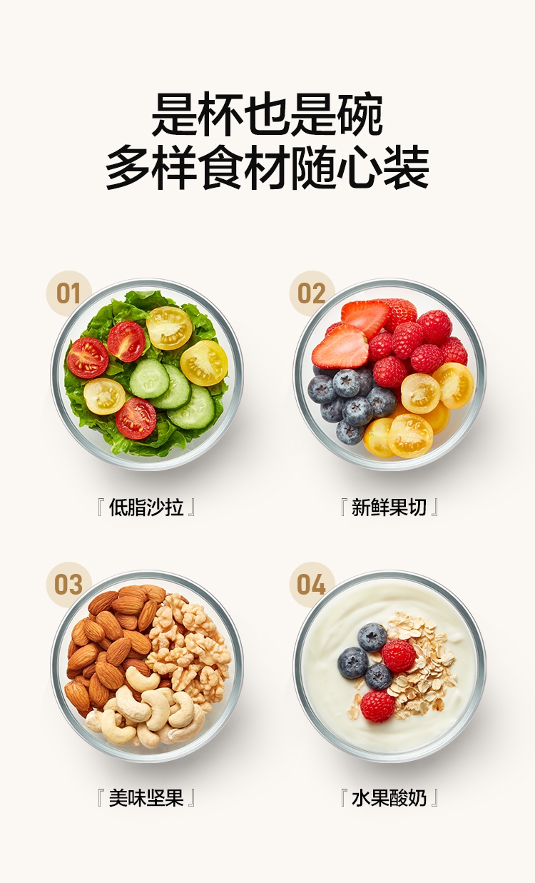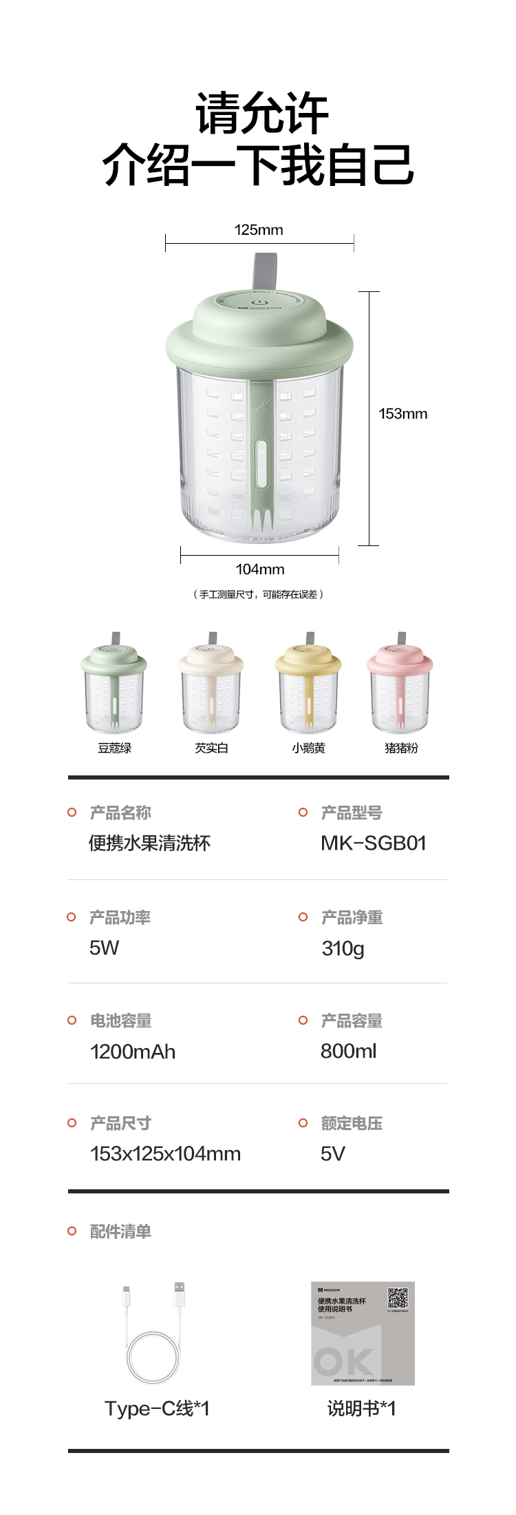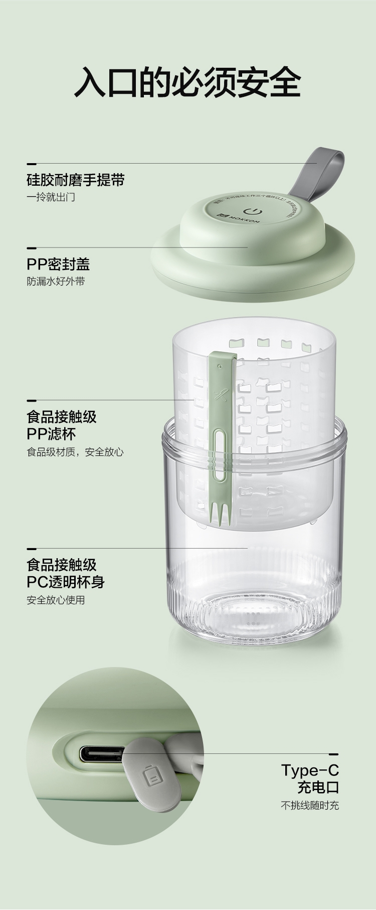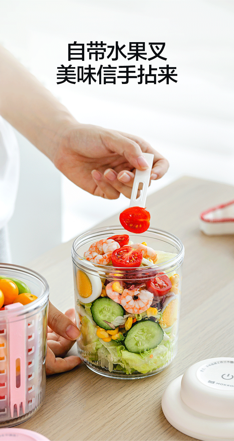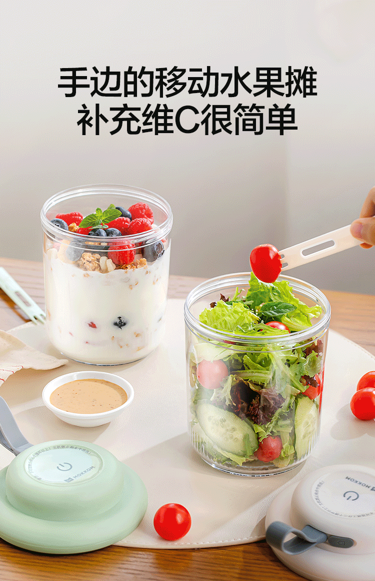 电解技术,一键祛农残;迷你小巧。800mL大容量;双层沥水,密封防漏。