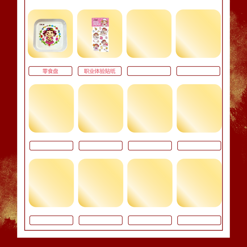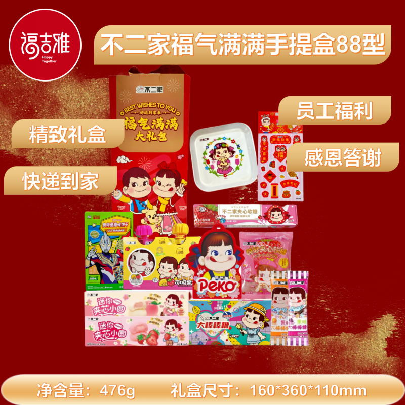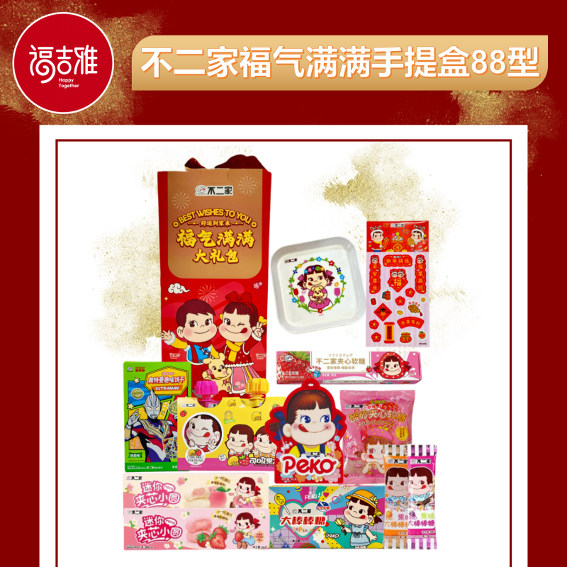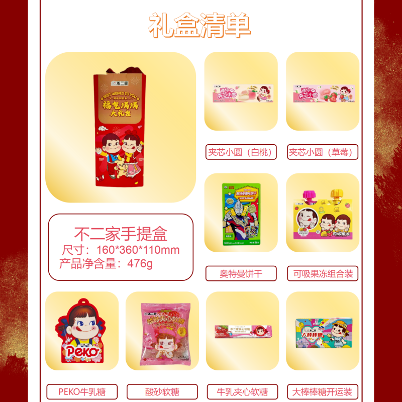 配置清单:不二家迷你夹芯小圆(白桃味) 66g 不二家迷你夹芯小圆(草莓味) 66g 不二家&奥特曼联名款趣味饼干(蔬菜味) 36g 不二家可吸果冻组合装 156g 不二家酸砂软糖 52g 不二家peko牛乳糖 40g 不二家草莓牛奶夹心糖 40g 不二家大棒棒糖开运装 20g 赠品1:不二家零食盘 赠品2:不二家IP贴纸 包装:不二家福气满满手提礼盒