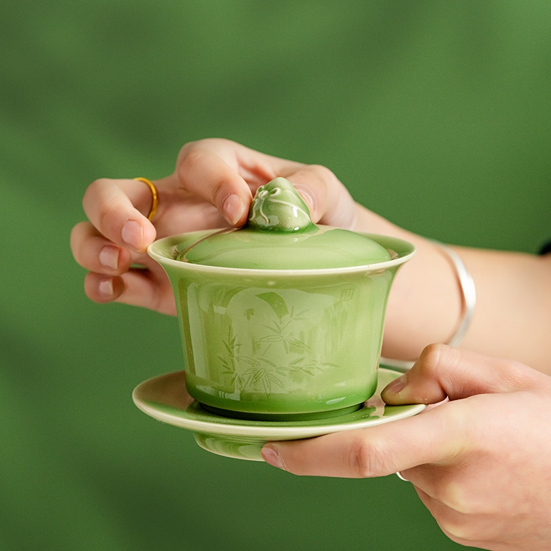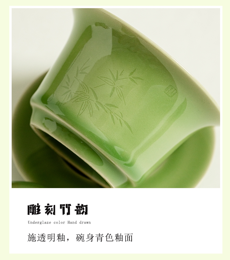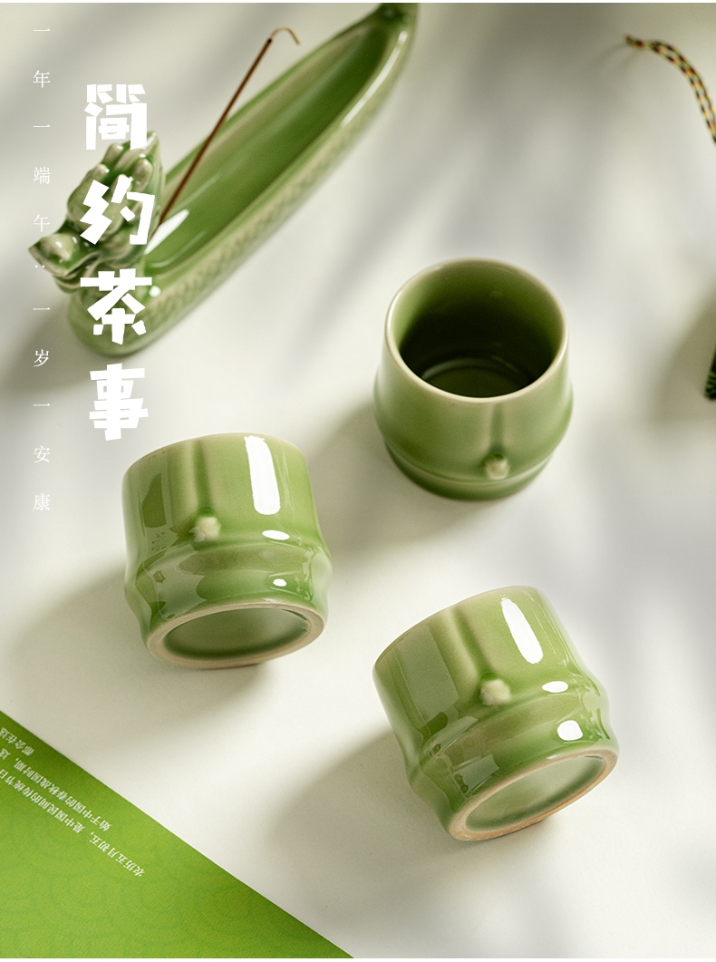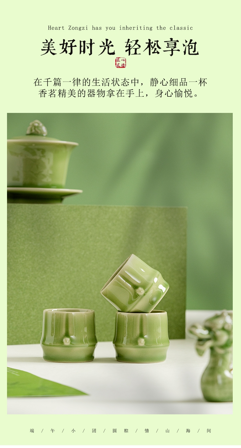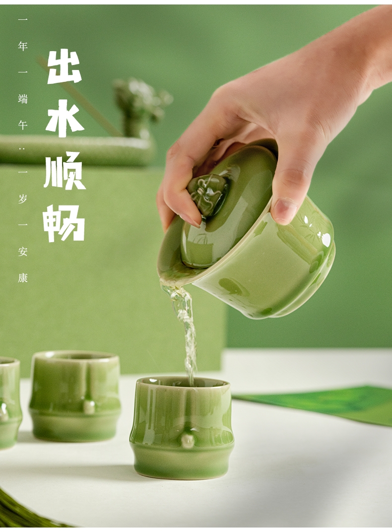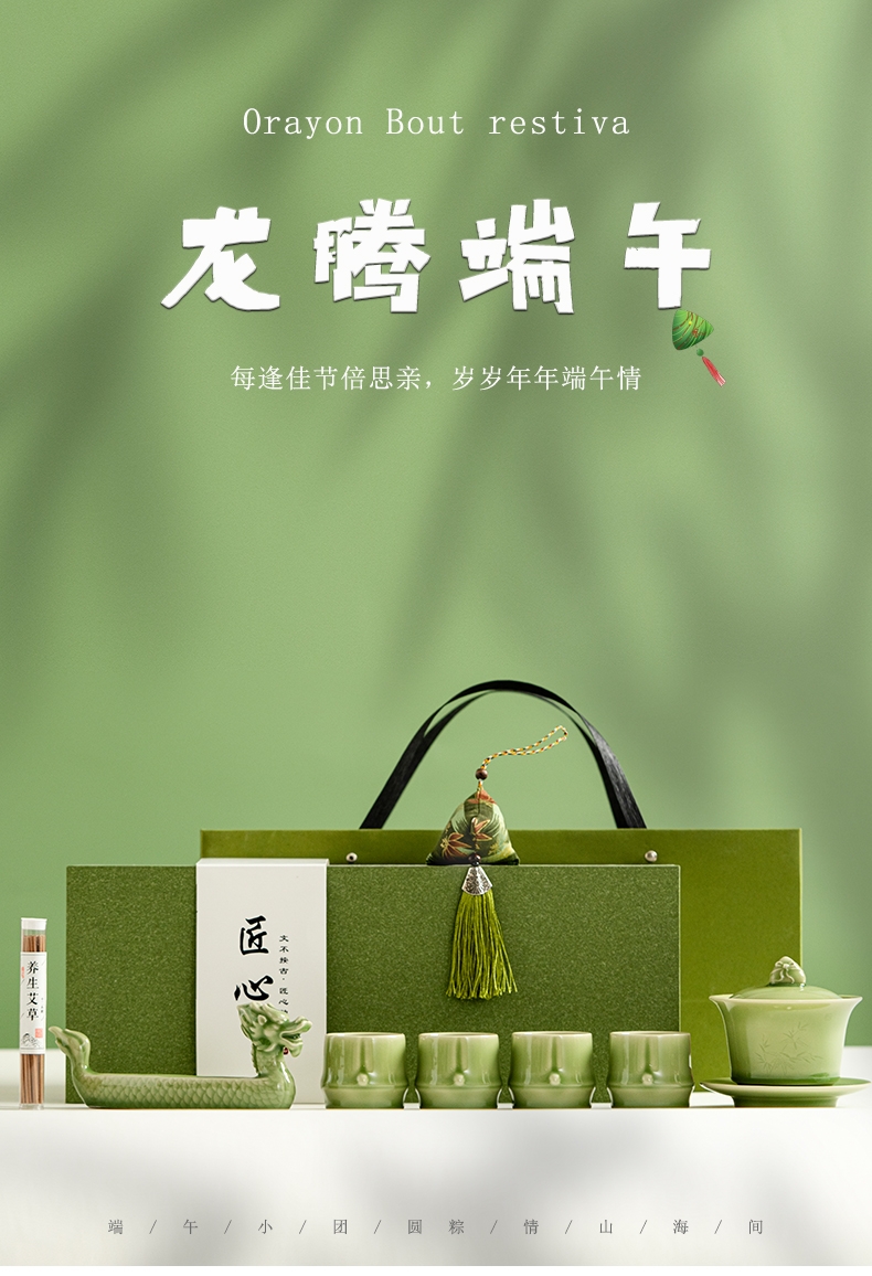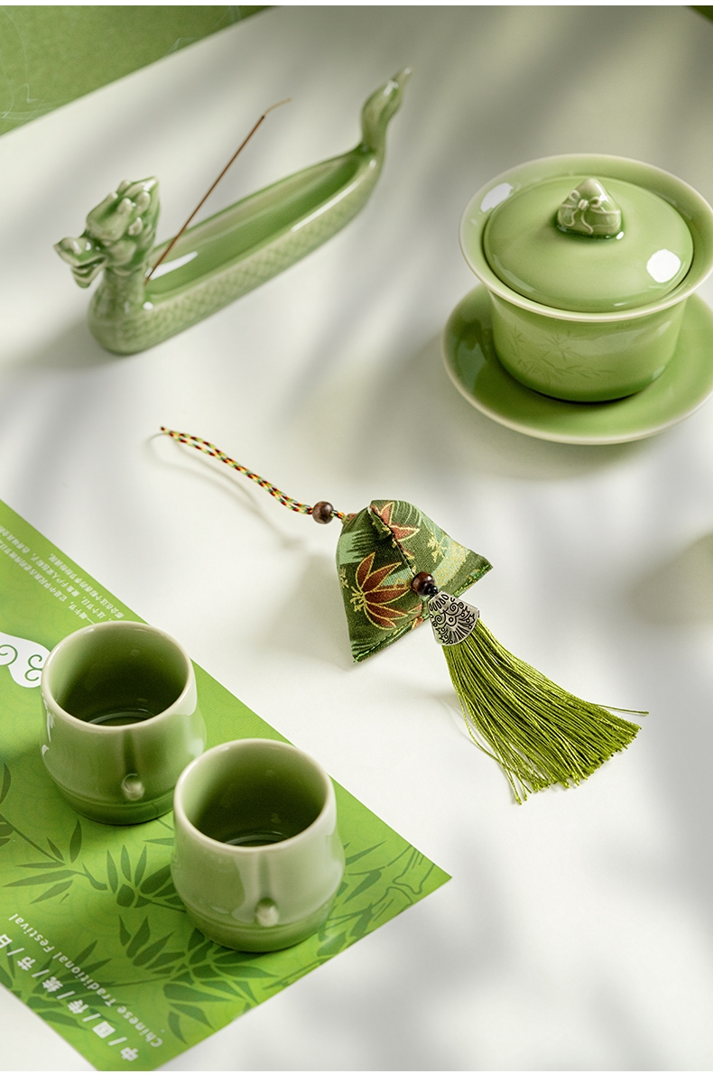原矿瓷土,高温烧制,匠人手作,尽显用心。;高纯度原矿釉水,蕴润柔和,如脂似玉,肥厚莹润。;搭配端午元素龙舟香插,呼应端午文化,更显用心。;茶具选用高尚气节的“竹”元素,集安康和高升之意。