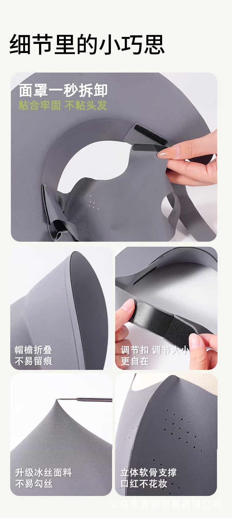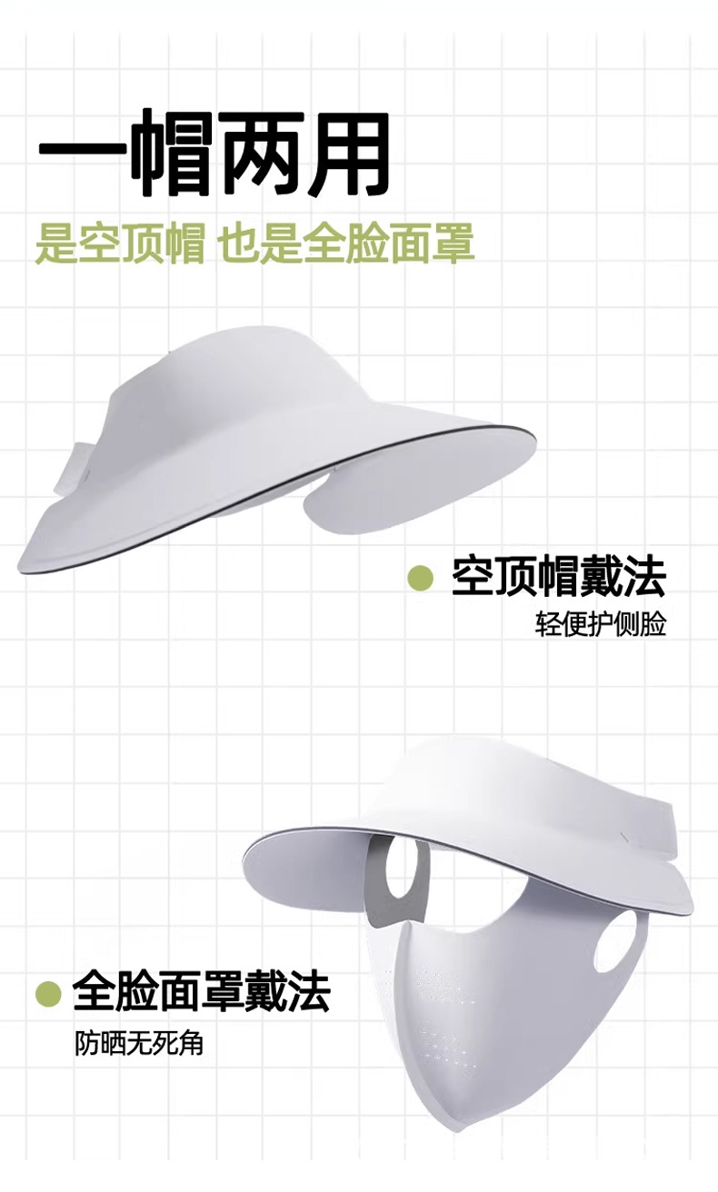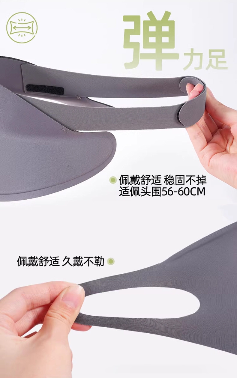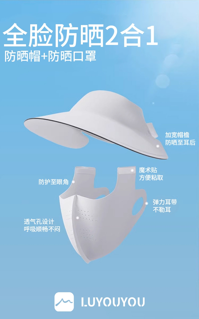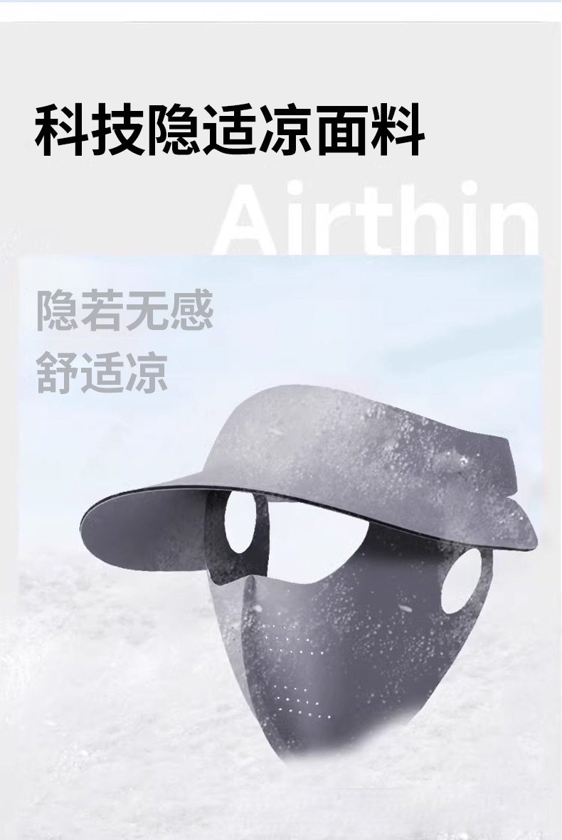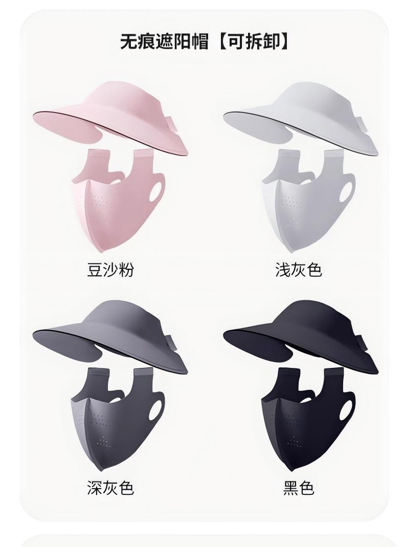 可拆卸防晒口罩套装,防晒更全面 采用锦纶科技凉感面;无痕裁剪,佩戴服帖,柔软亲肤;遮阳帽可调节魔术贴设计,适合多种头围