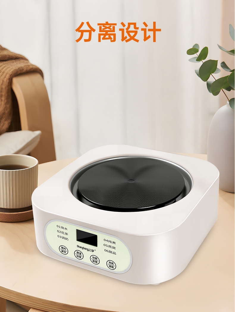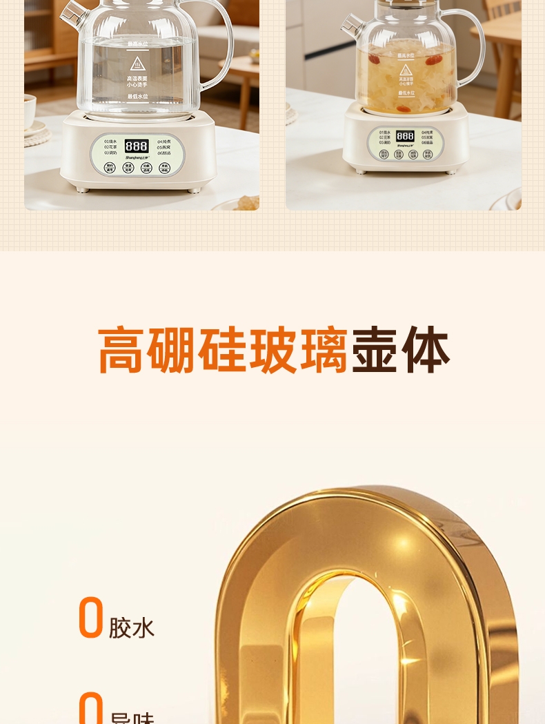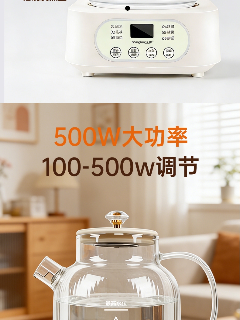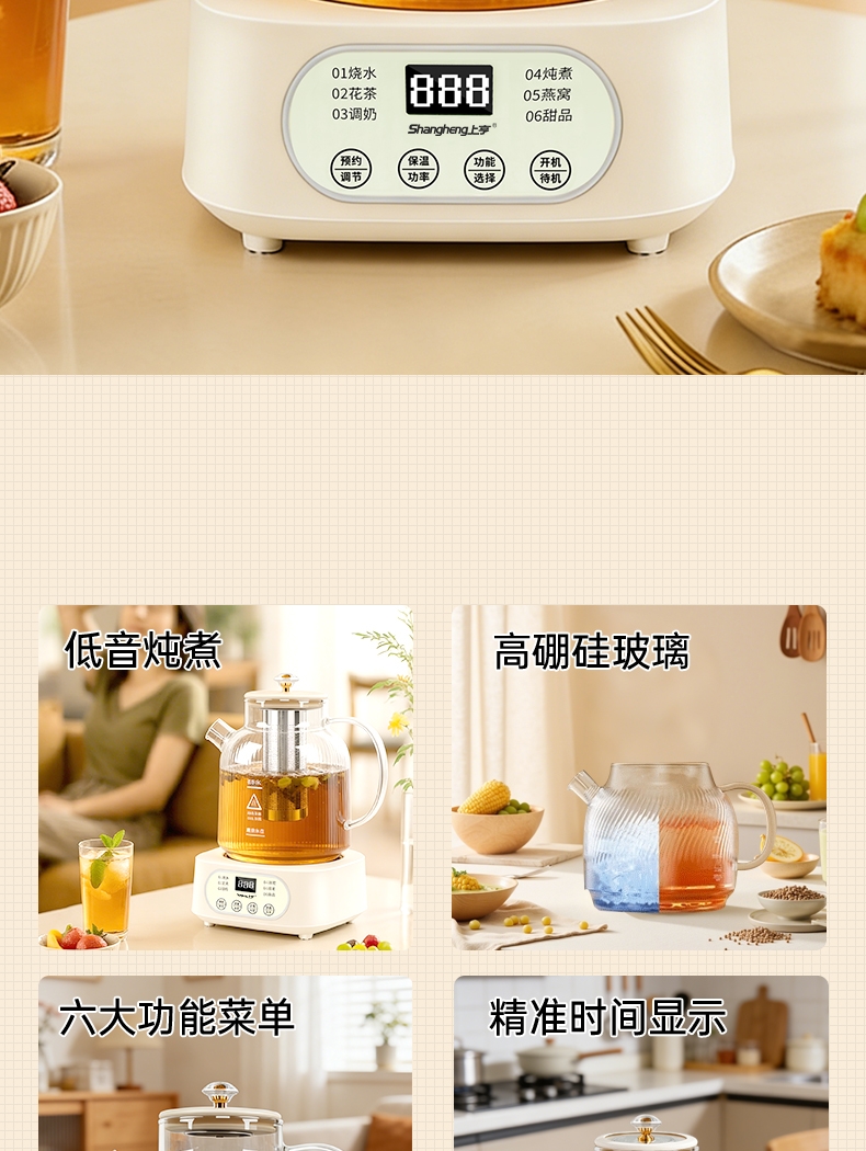 24hr智能预约功能;全玻璃一体高硼硅玻璃壶;发热盘整圈发热