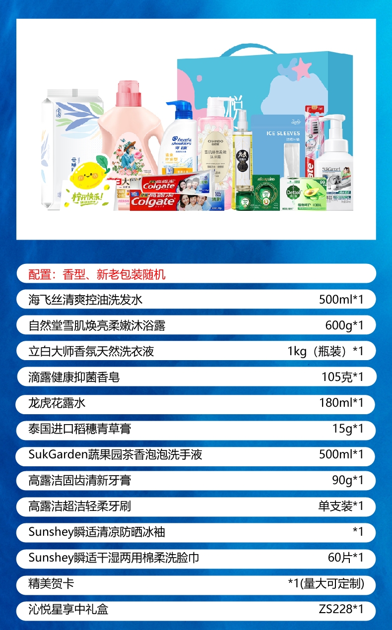 配置清单:配置明细:香型随机 海飞丝清爽控油洗发水500ml*1 自然堂雪肌焕亮柔嫩沐浴露600g*1 立白大师香氛天然洗衣液1kg(瓶装)*1 滴露健康抑菌香皂105克*1 龙虎黄柏花露水180ml*1 泰国进口稻穗青草膏15g*1 SukGarden蔬果园茶香泡泡洗手液500ml*1 高露洁固齿清新牙膏90g*1 高露洁超洁轻柔牙刷单支装*1 夏日清凉冰袖*1 Sunshey瞬适干湿两用棉柔洗脸巾60片*1 精美贺卡*1(量大可定制) 沁悦星享中礼盒ZS228*1
