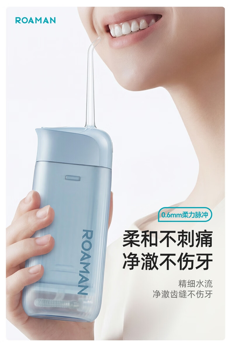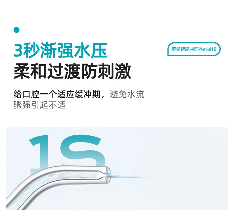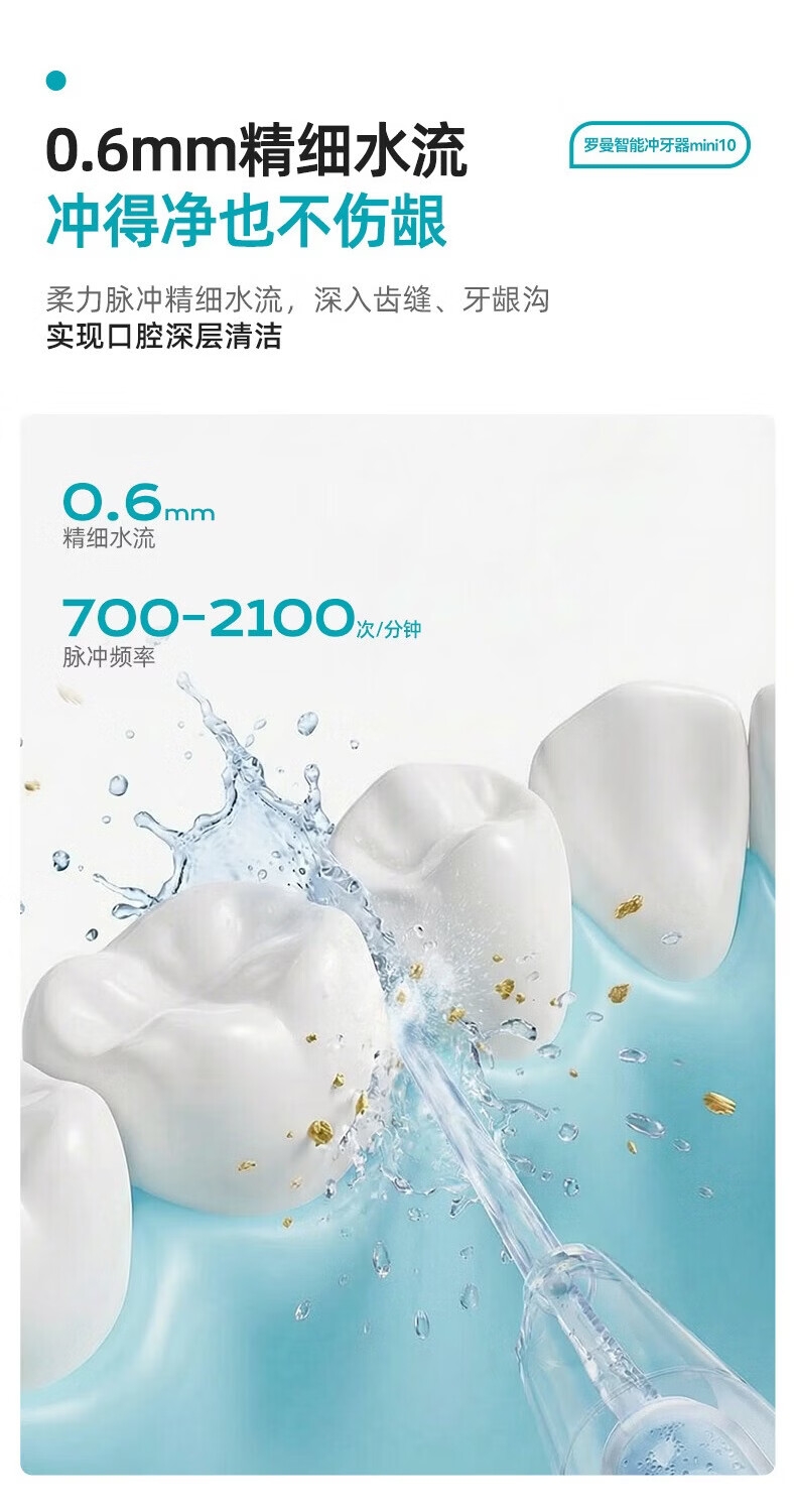 温和不刺痛,净洁不伤牙;0.6MM精细水流,冲得净不伤牙龈;比手机更小巧