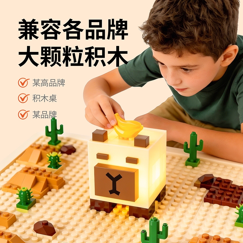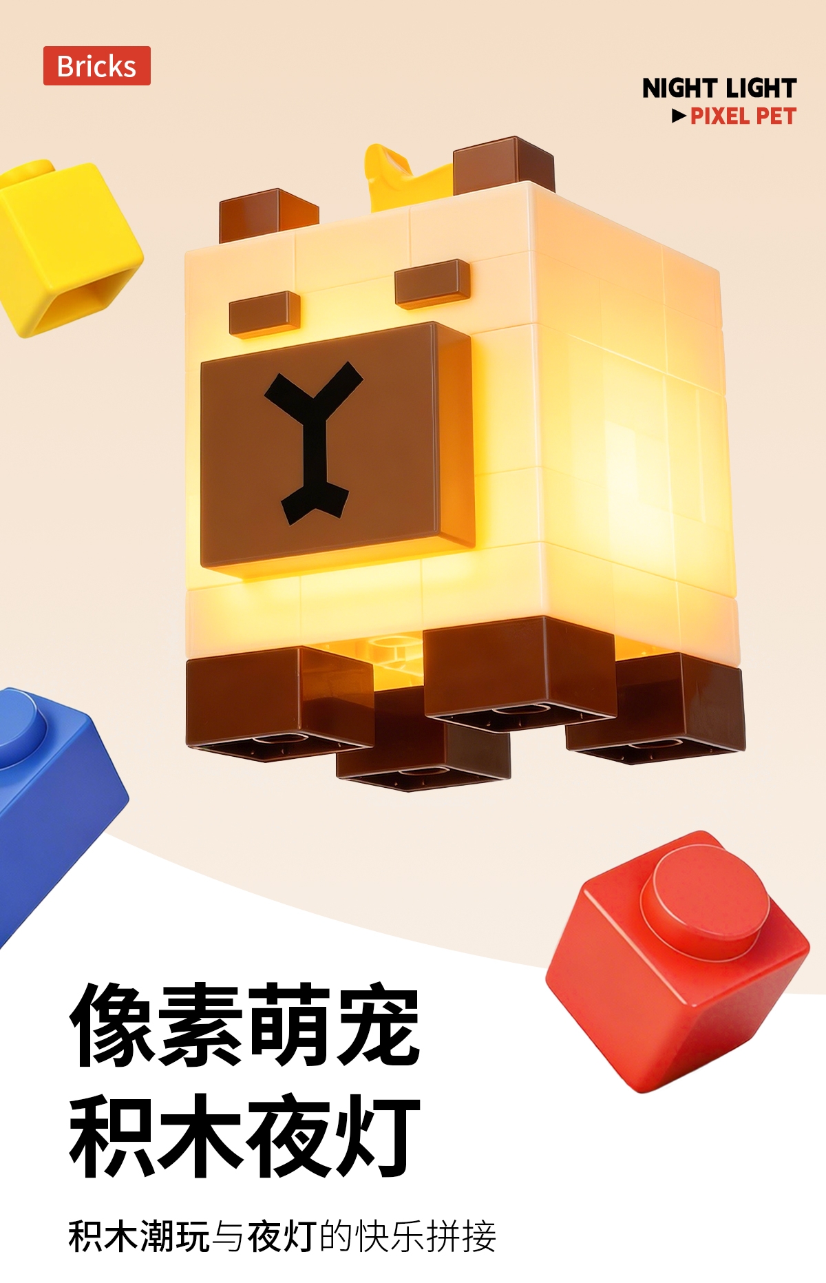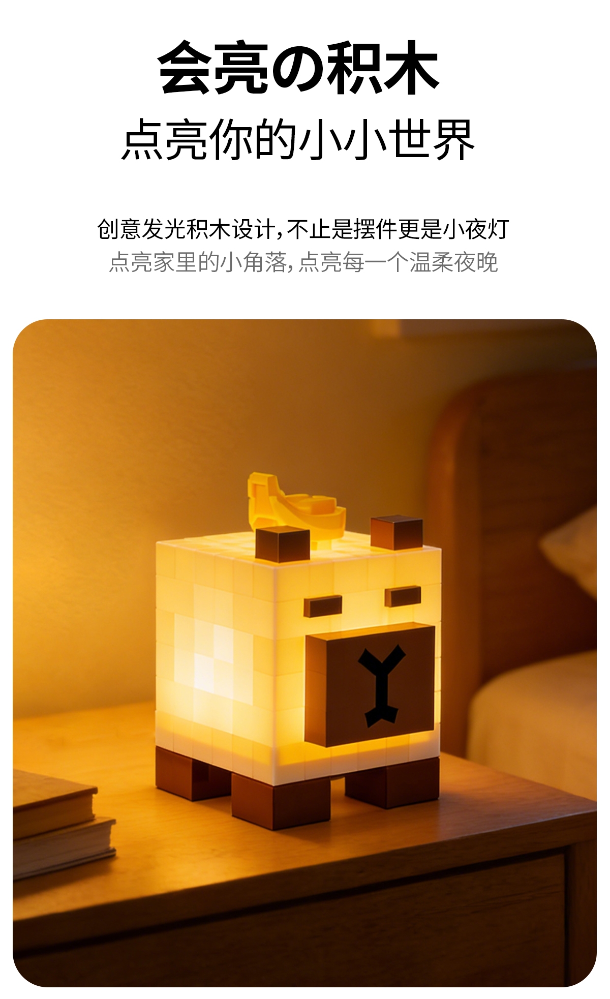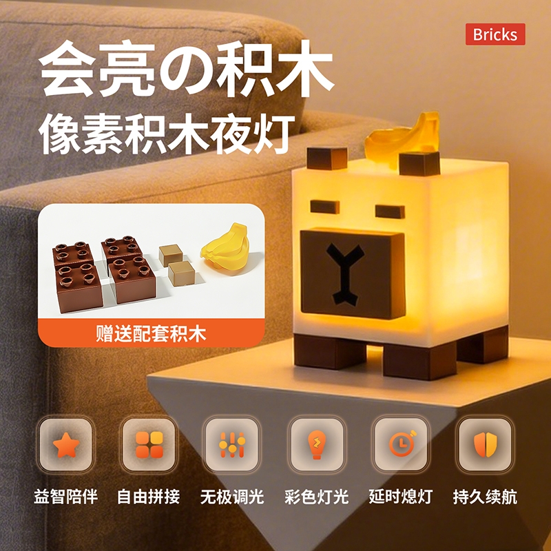 拼插玩乐点亮童趣,柔和灯光守护安睡;柔光护眼,无极调光,营造专属治愈角落;既能当夜灯照明,又能当积木玩
