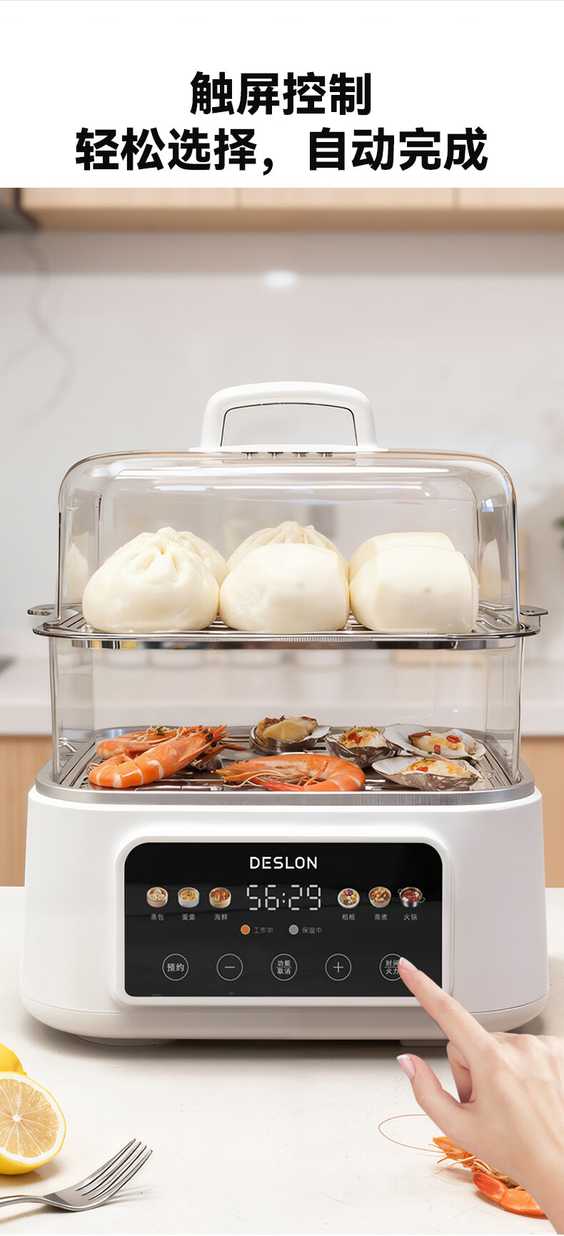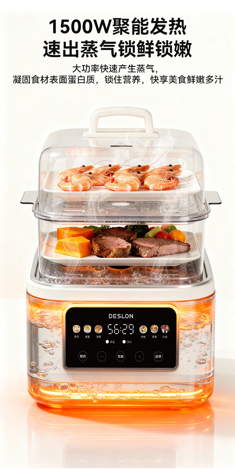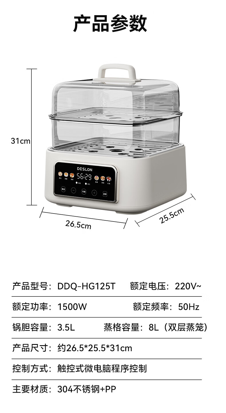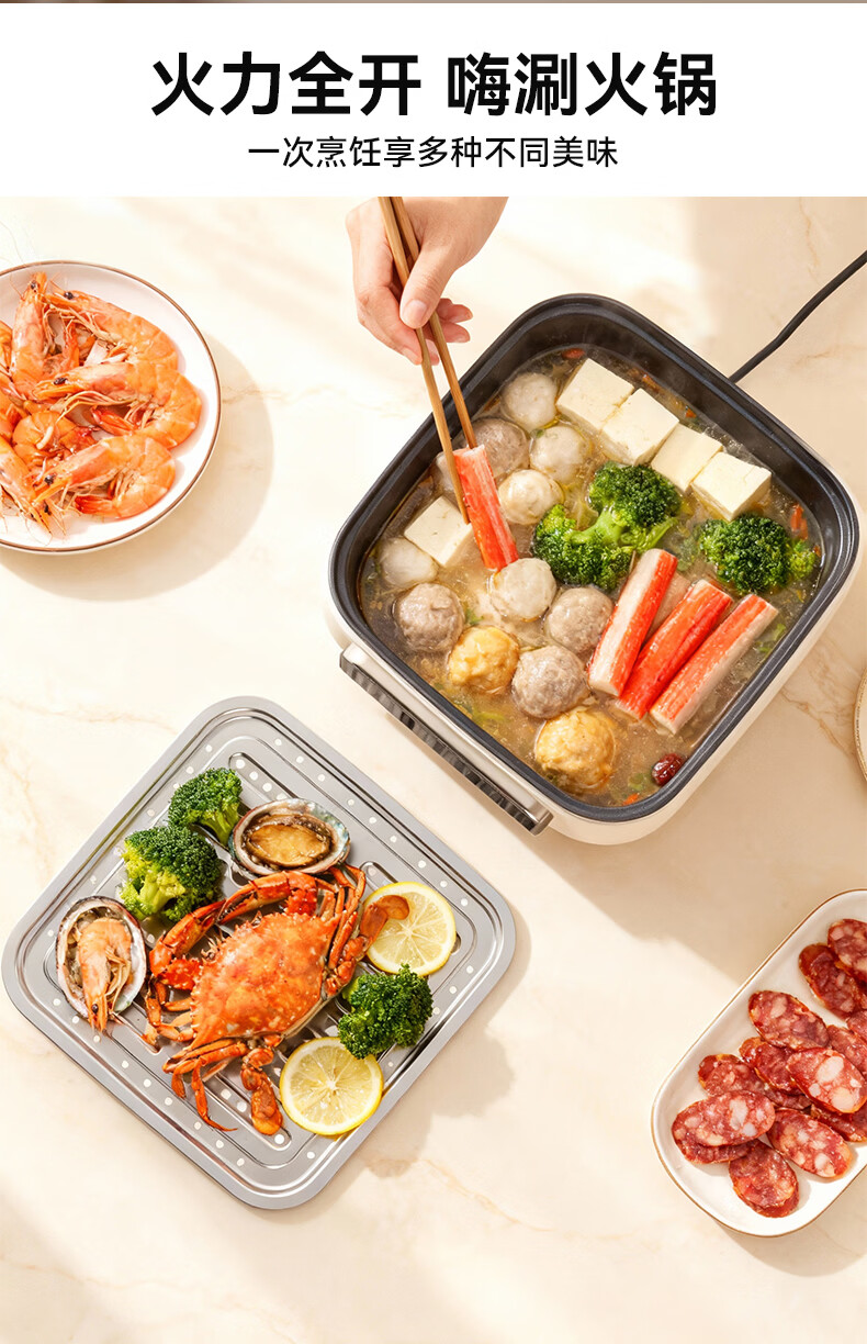 可视化PC蒸格配合304不锈钢锅胆,蒸煮两用;双层蒸格搭配使用,满足多人使用;火锅容量3.5L,1500W大功率加热,快速沸腾
