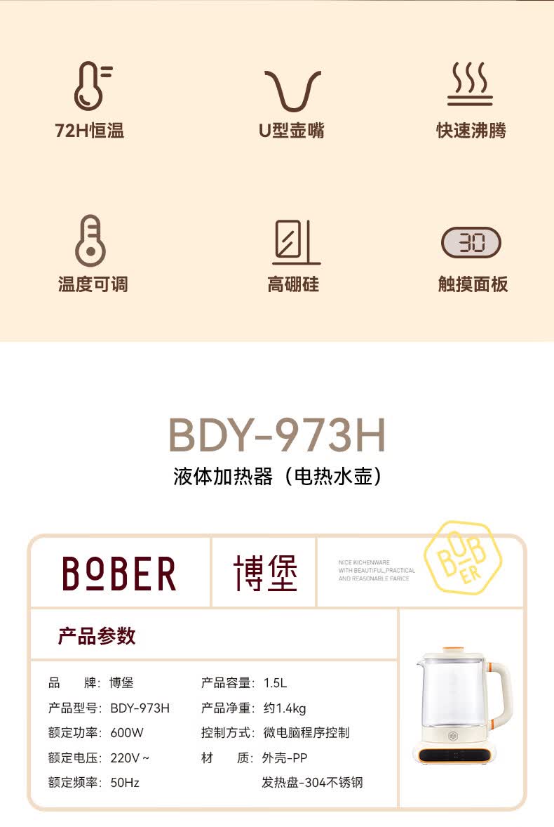 材质:304发热盘.304壶盖.高硼硅玻璃.pp塑料