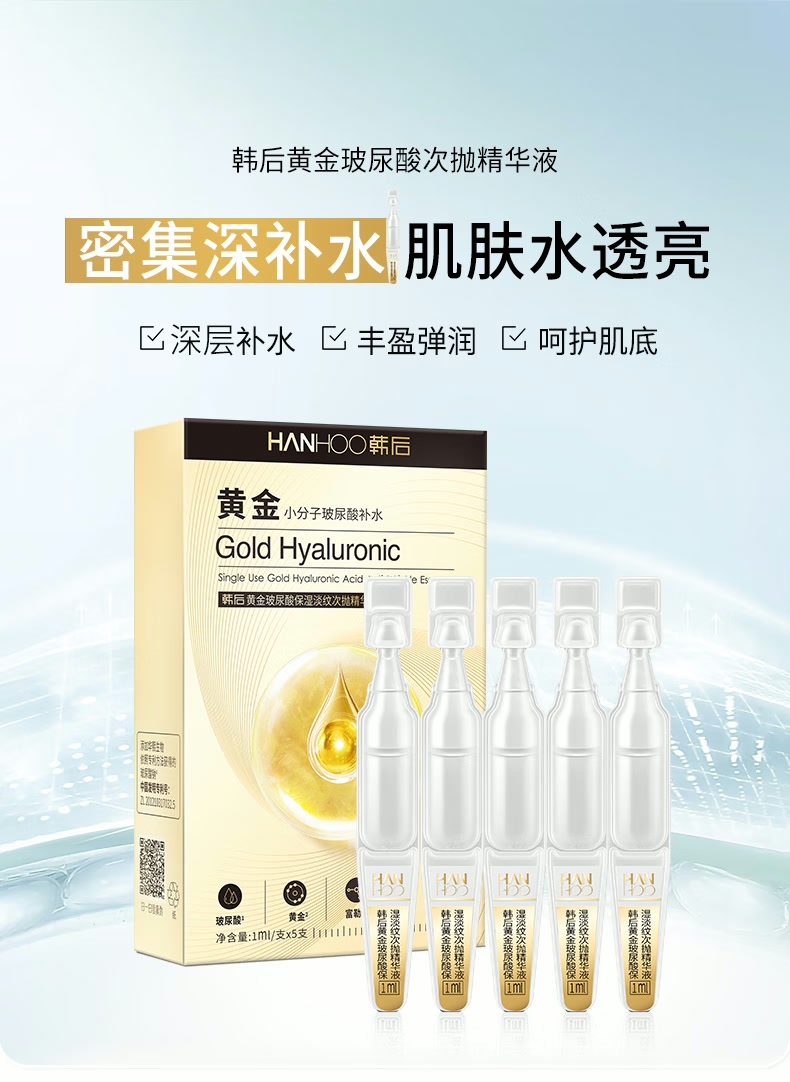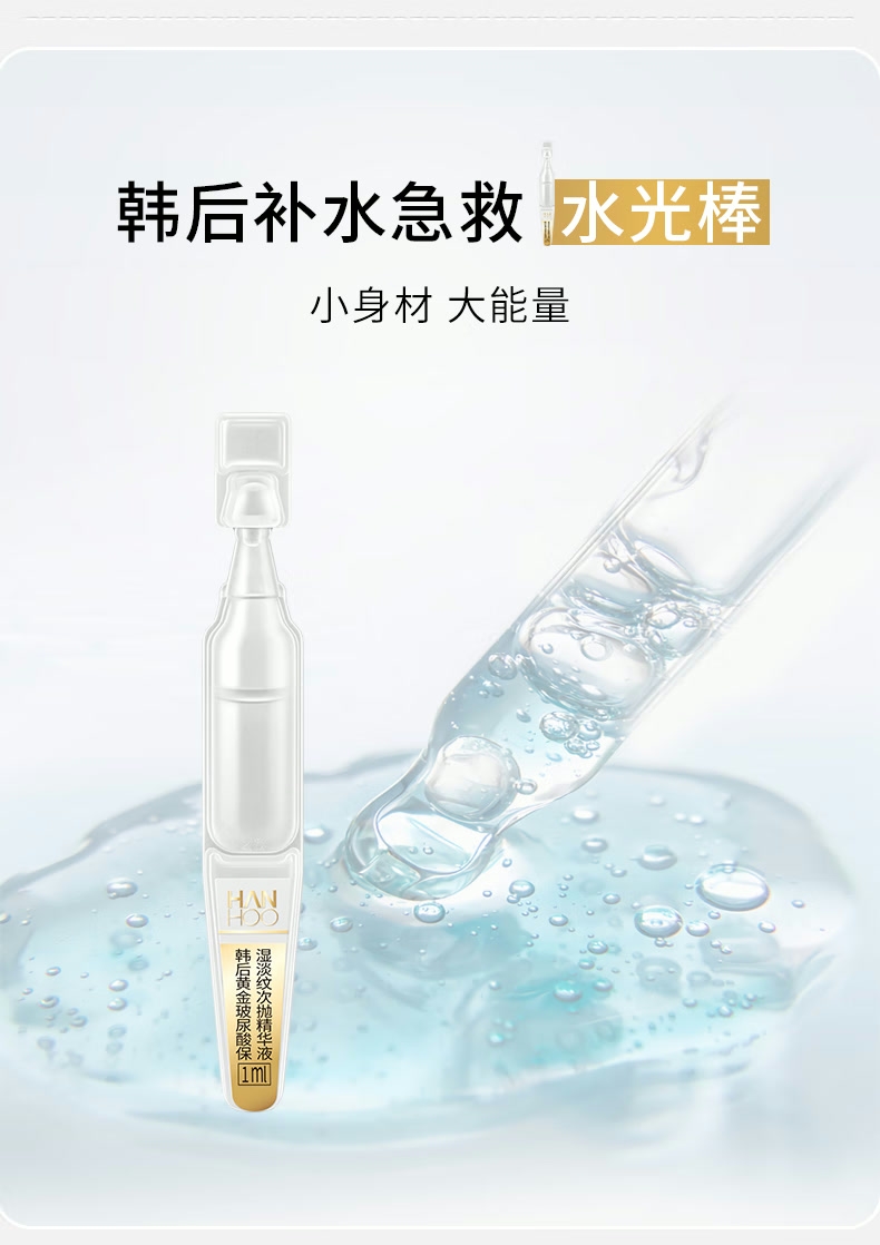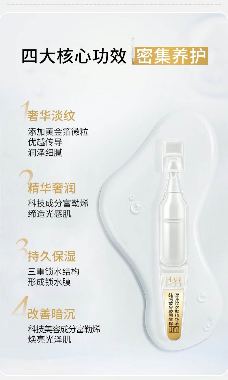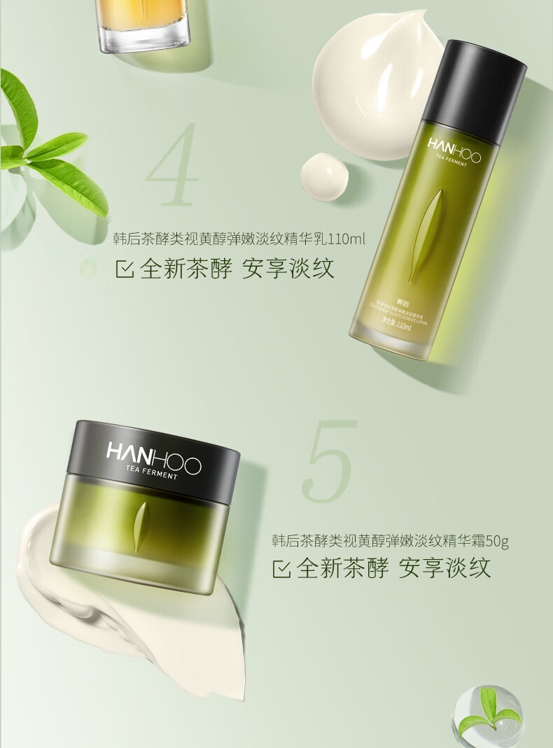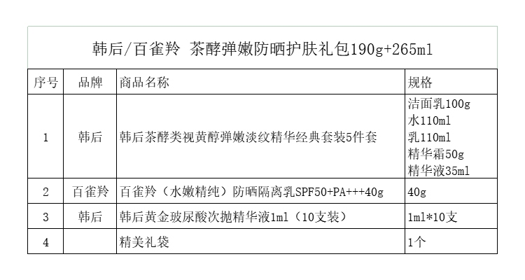 配置清单:韩后茶酵类视黄醇弹嫩淡纹精华经典套装5件套 百雀羚(水嫩精纯)防晒隔离乳SPF50+PA+++40g 韩后黄金玻尿酸次抛精华液1ml(10支装) 精美礼袋