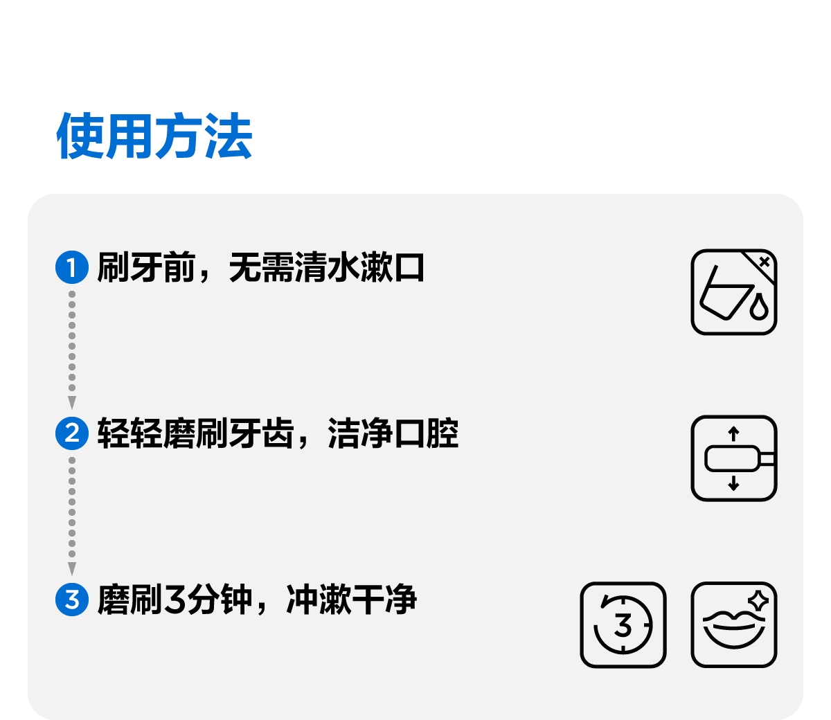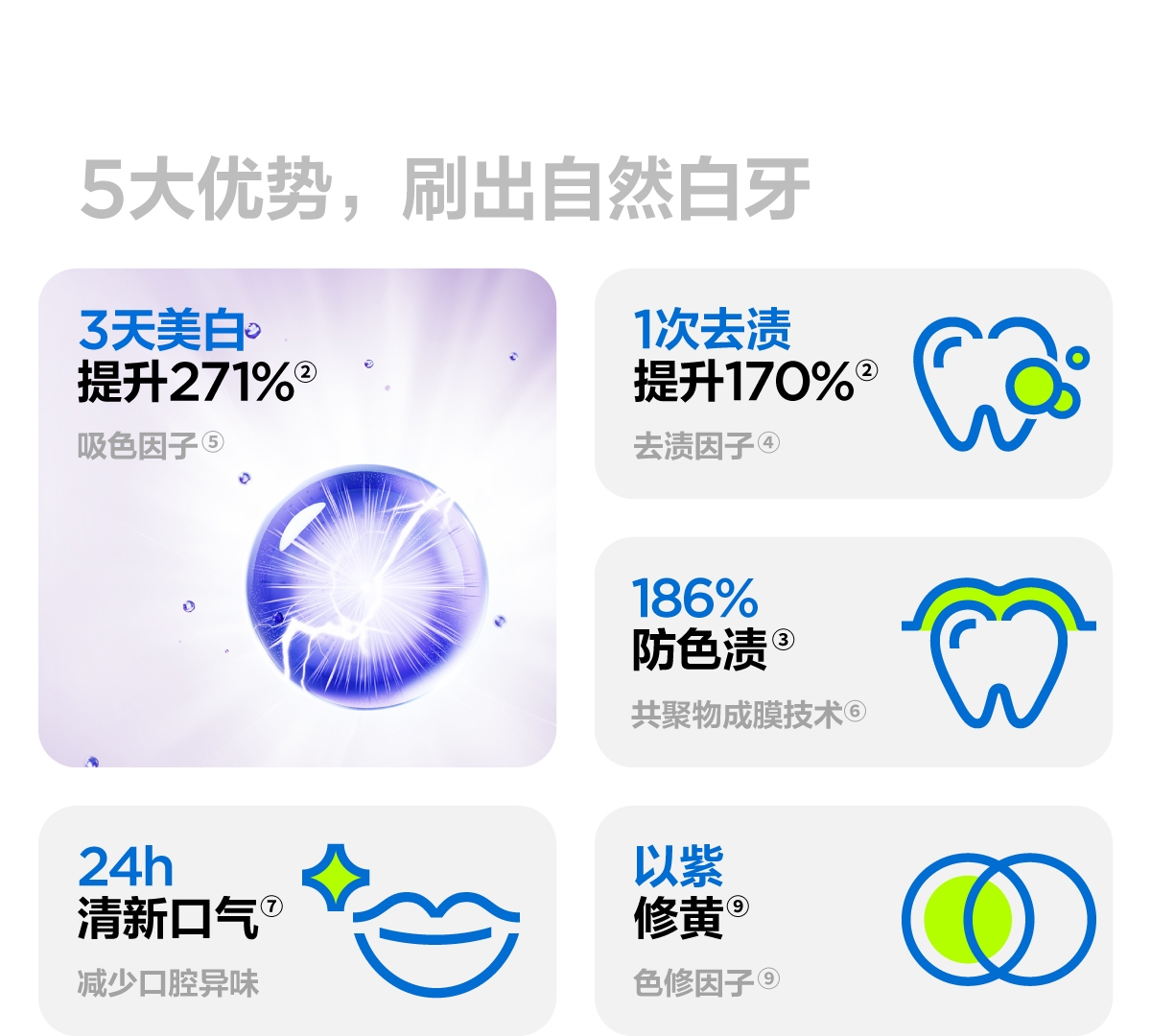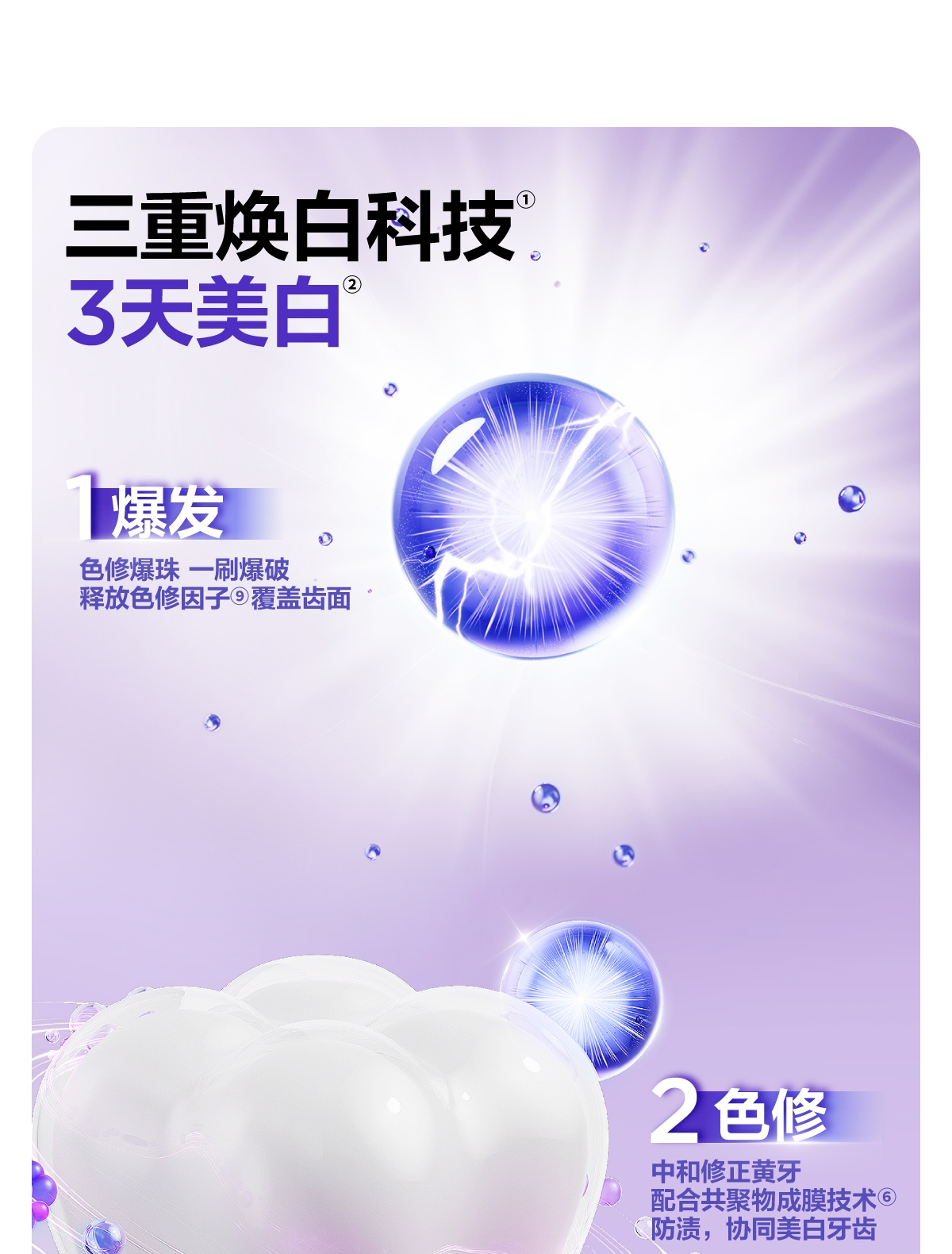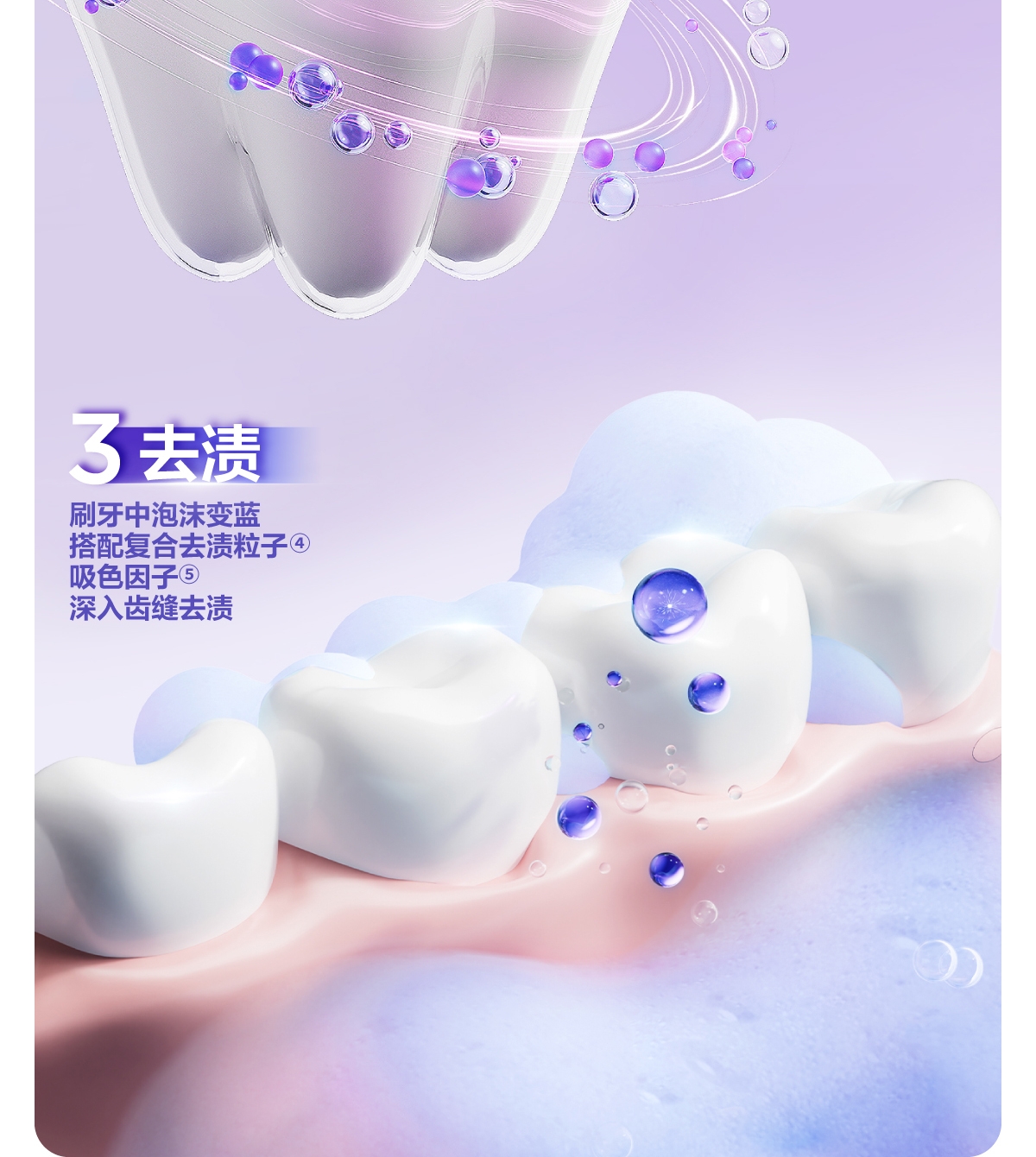 专研色修去渍,快速分解茶咖啡渍,提亮牙色;形成防护膜,防色渍附着,长效锁白不返黄;益生菌清新口气,温和护龈,敏感牙适用