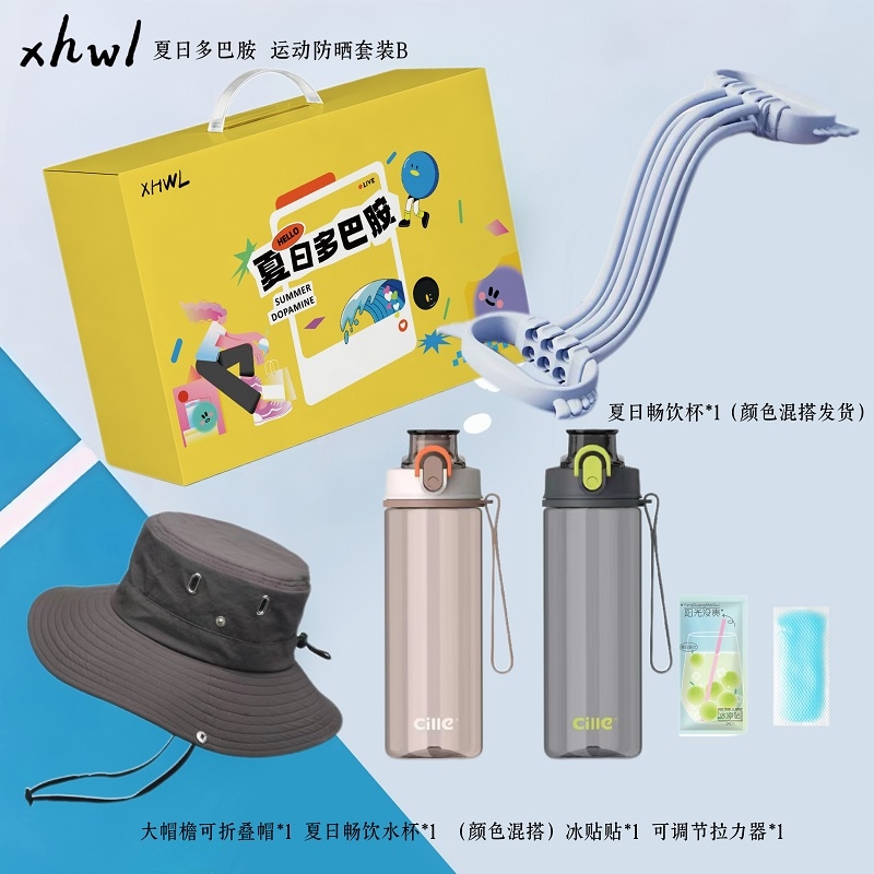 配置清单:可调节拉力器*1 夏日畅饮杯*1 大帽檐防晒帽*1 冰凉贴*1 礼盒*1