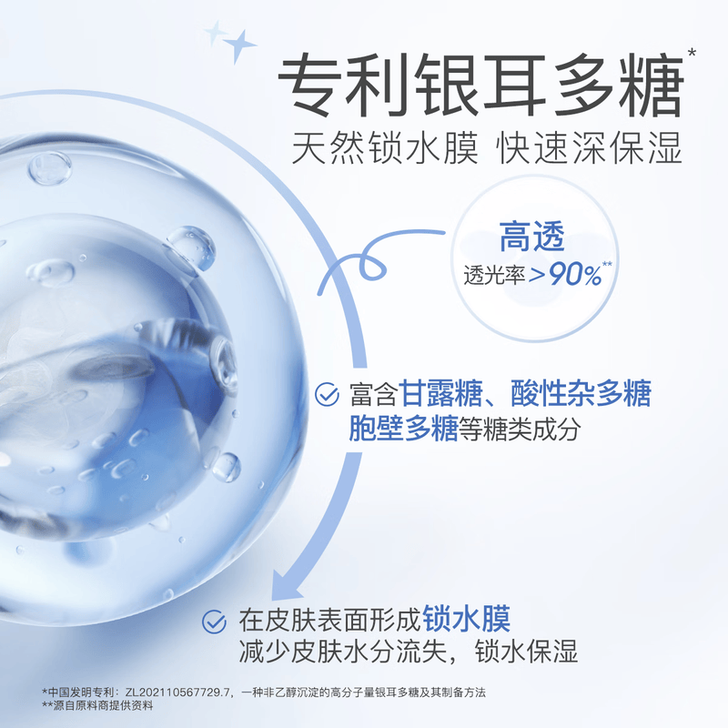 添加专利银耳多糖3 植萃成分快速锁水;保湿锁水 柔润嫩肤;富含甘露糖、酸性杂多糖胞壁多糖等糖类成分