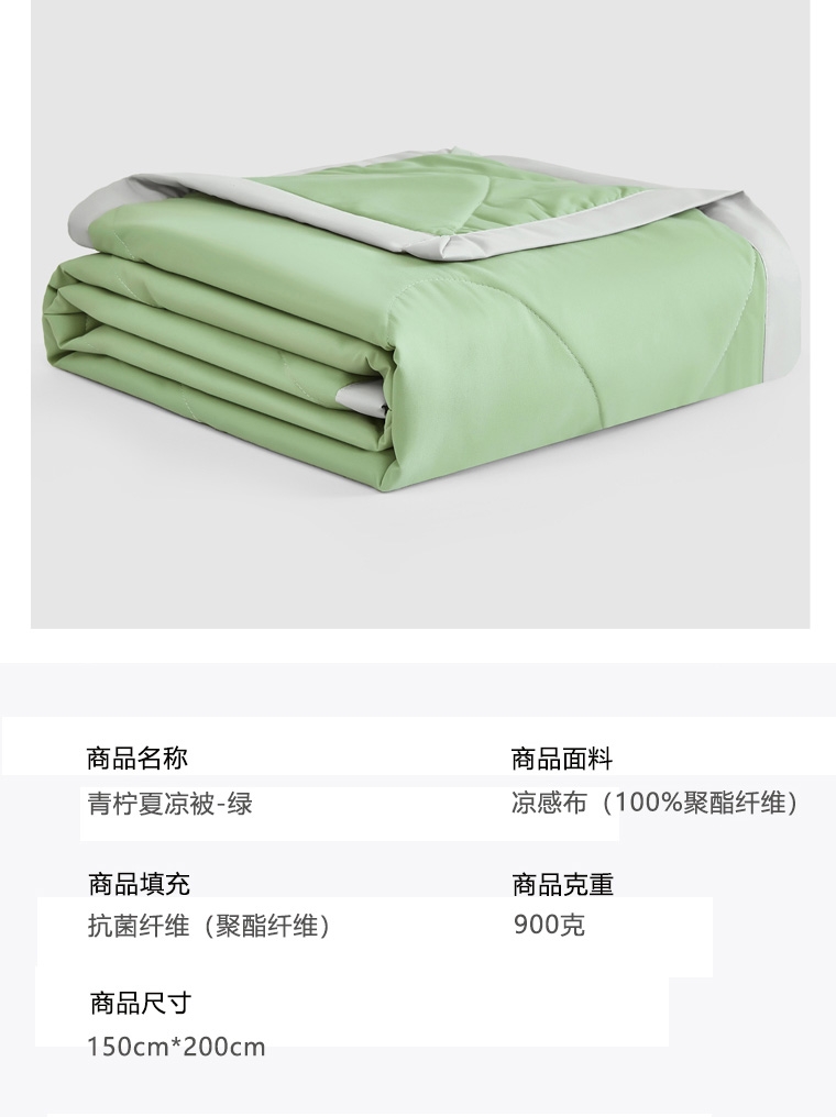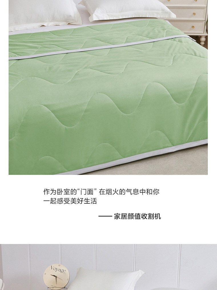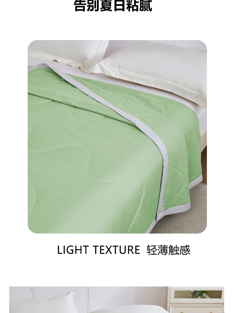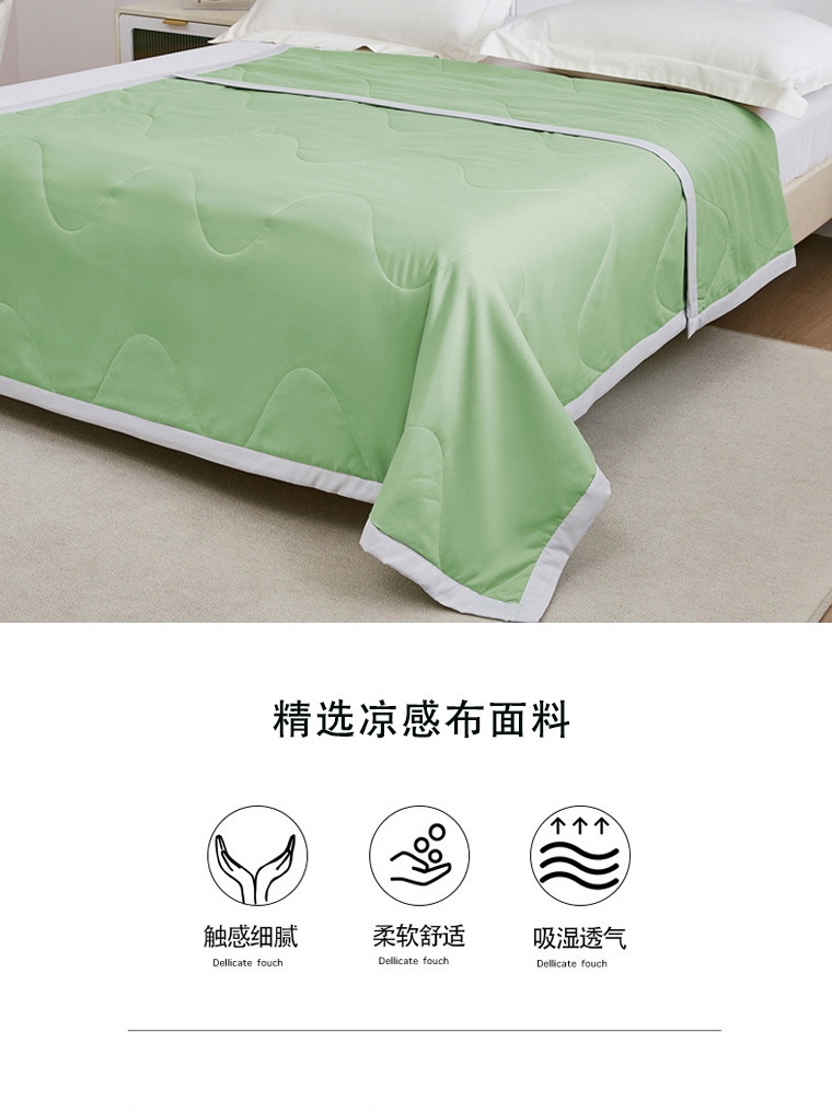 选用凉感布面料,手感舒适凉爽,透气贴身,如冰激凌;超细抗菌纤维,手感犹如羽绒般柔软细腻,轻盈蓬松,抗;采用精致小包边工艺与简约绗缝工艺结合,整款被芯既美