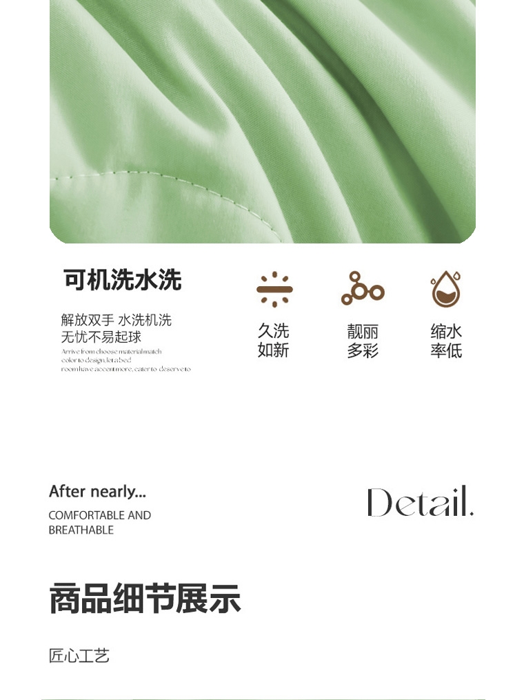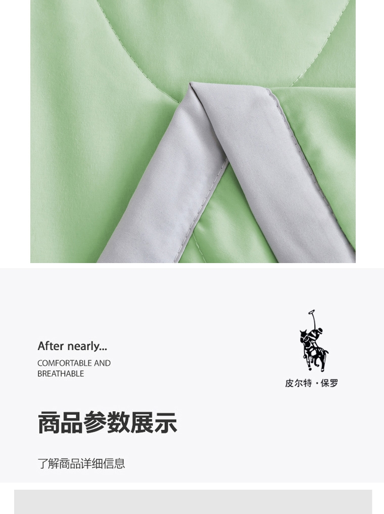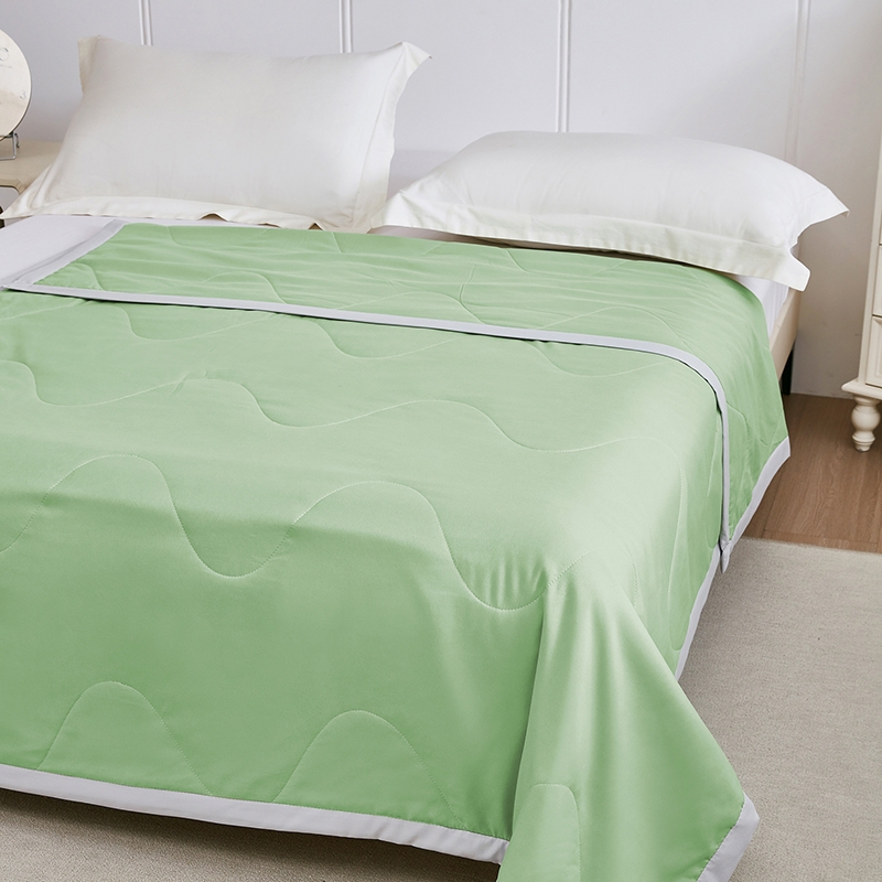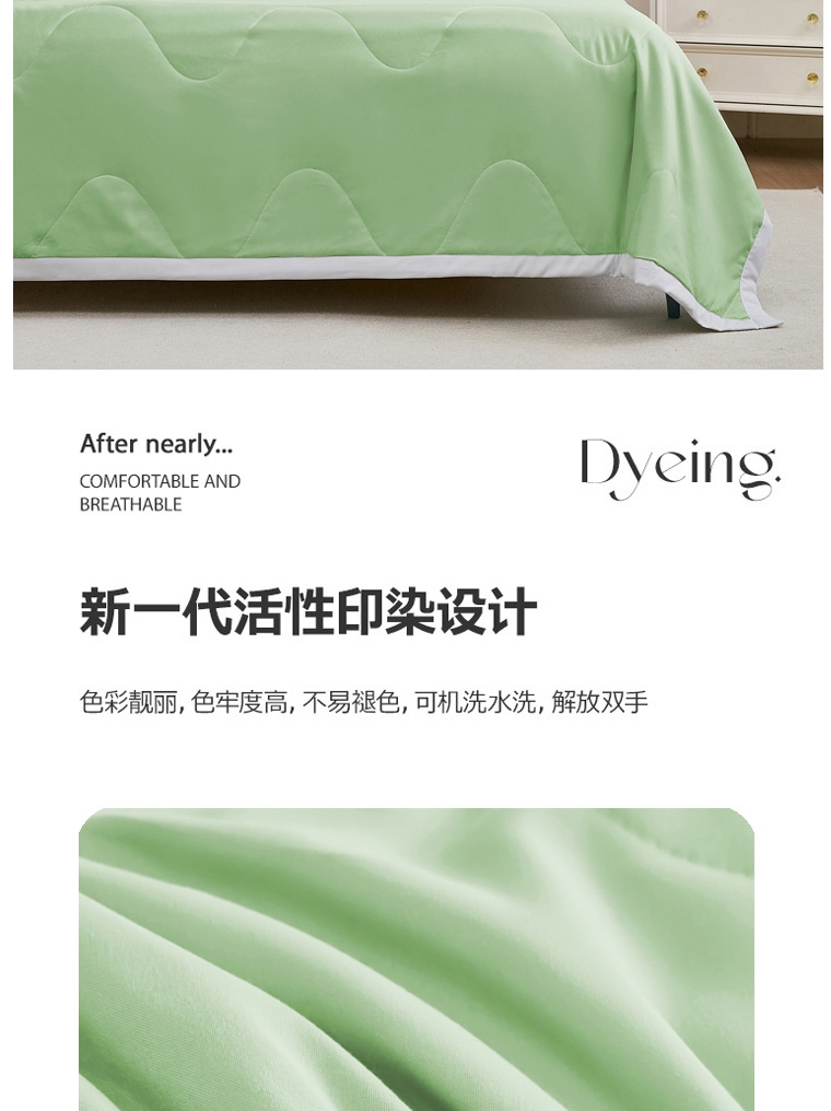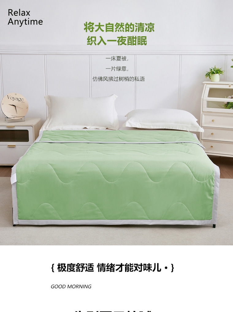 选用凉感布面料,手感舒适凉爽,透气贴身,如冰激凌;超细抗菌纤维,手感犹如羽绒般柔软细腻,轻盈蓬松,抗;采用精致小包边工艺与简约绗缝工艺结合,整款被芯既美