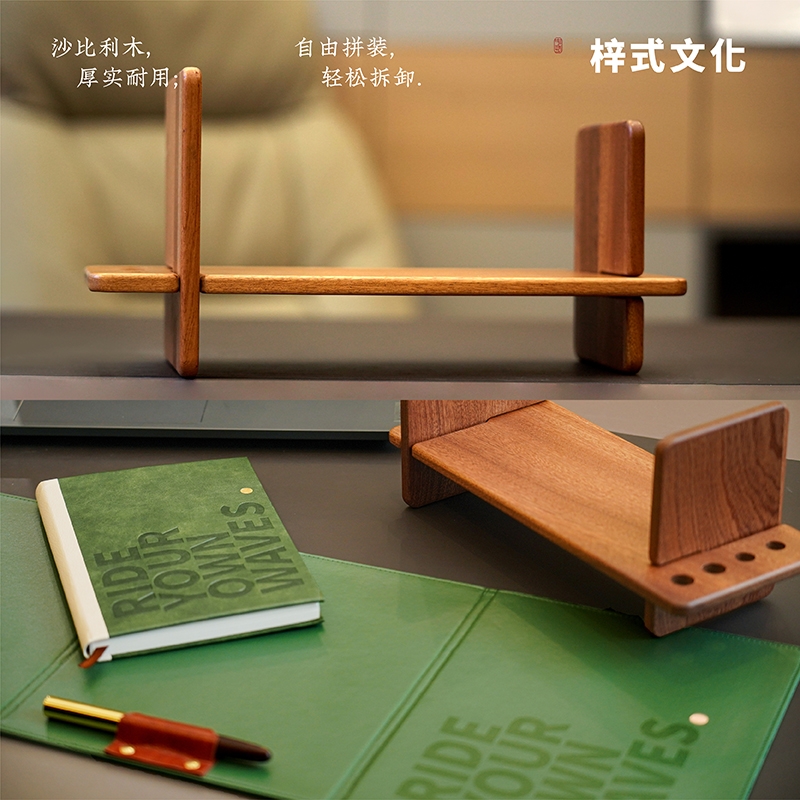 实木书立,稳固承托;折叠设计,高效随行;精选红檀木材质,握持舒适,质感温润;礼盒以“松绿”为主调,沉稳中富有生命力