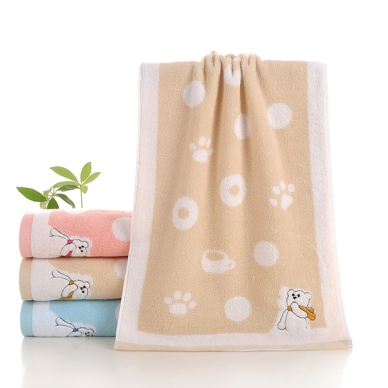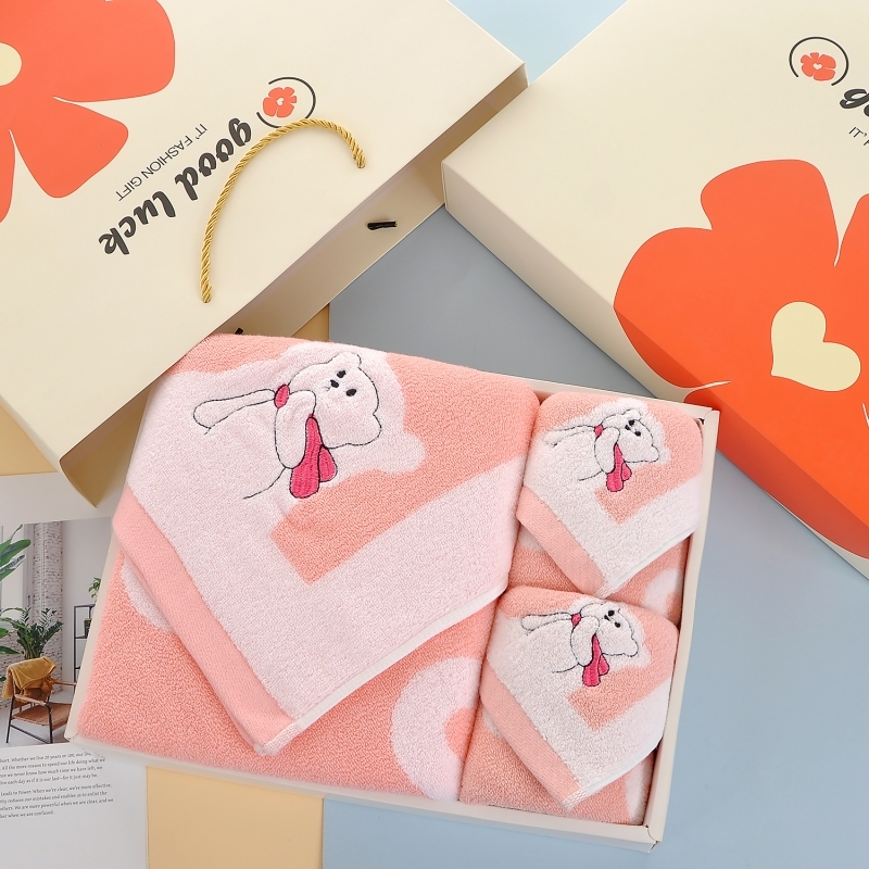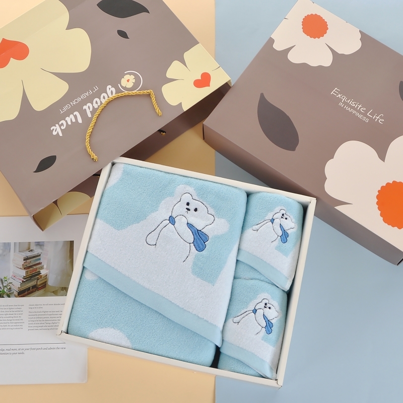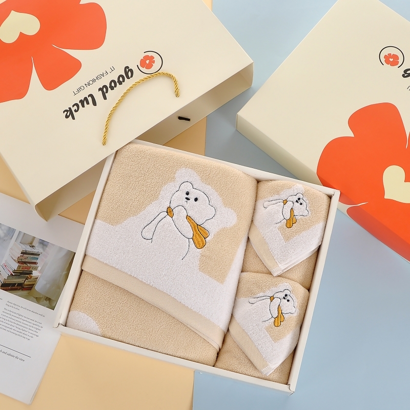 奥来纯 纯棉色织萌熊毛巾浴巾三件套礼盒