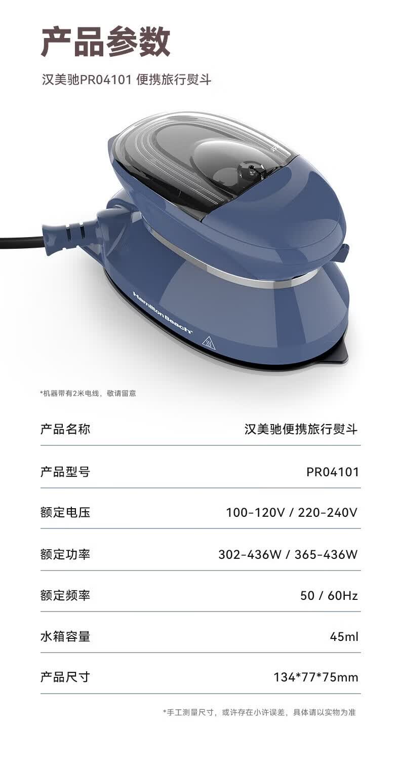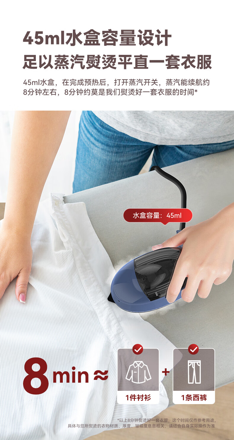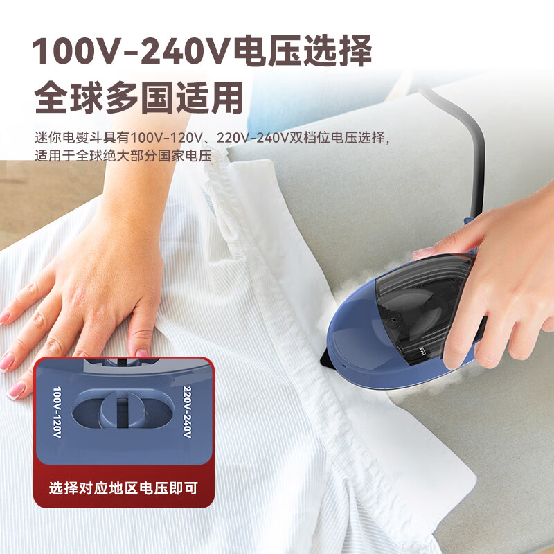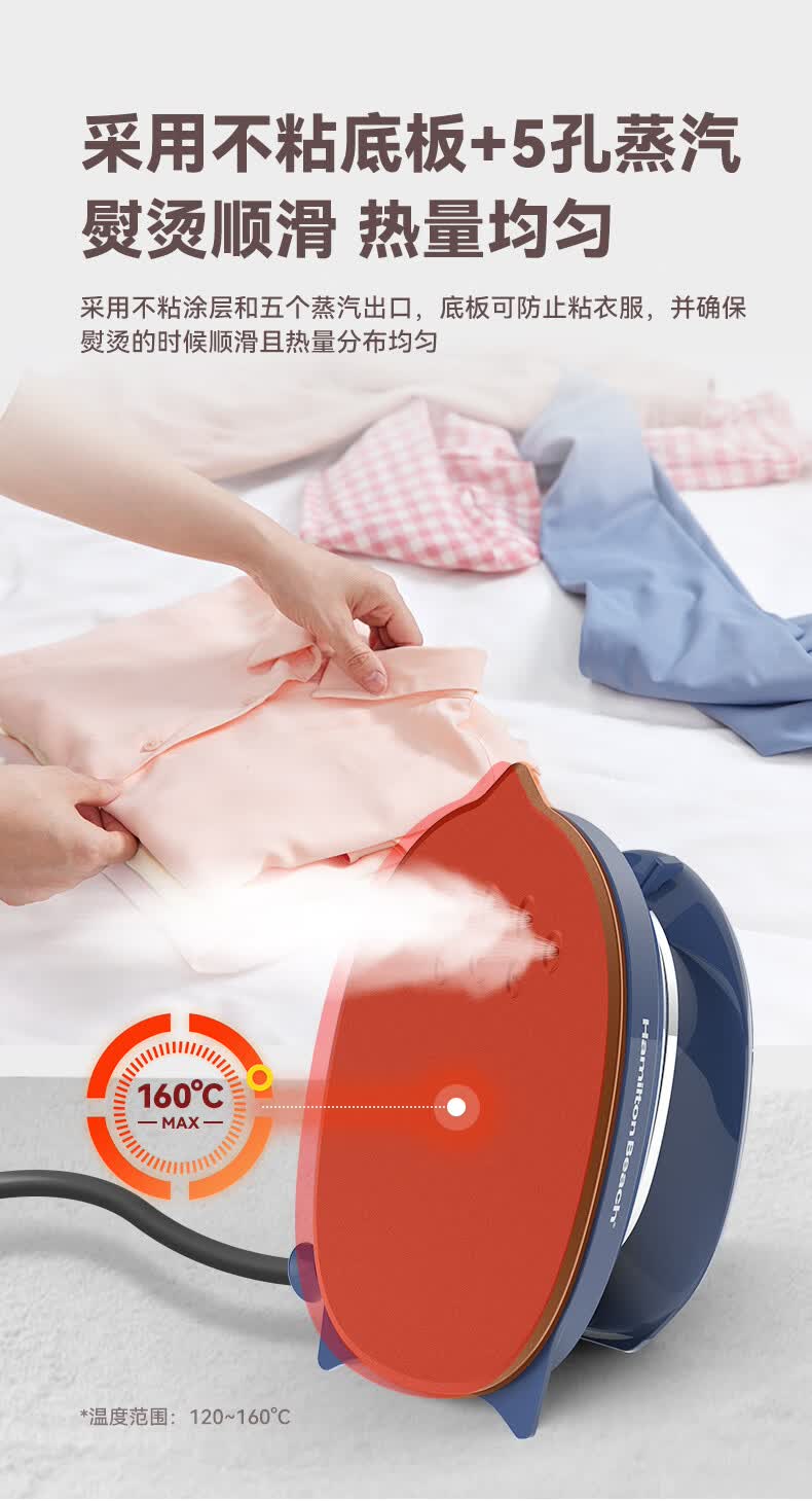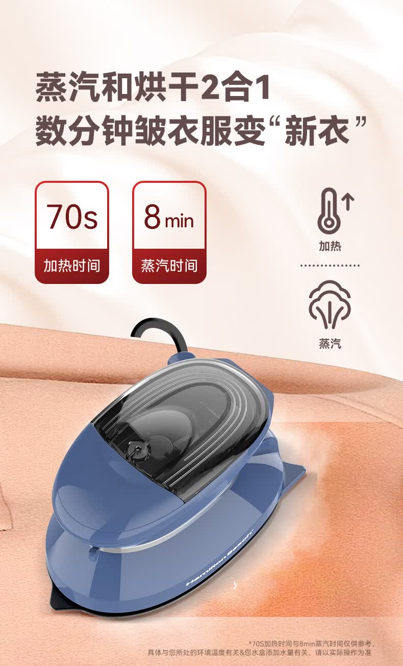 100-240V电压选择,全球多国适用;蒸汽和烘干2合一,数分钟皱衣服变平直“新衣”;约70秒加热时间,约8分钟蒸汽续航时间;不粘底板+5孔蒸汽,熨烫顺滑,热量均匀