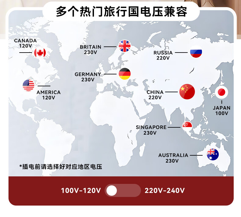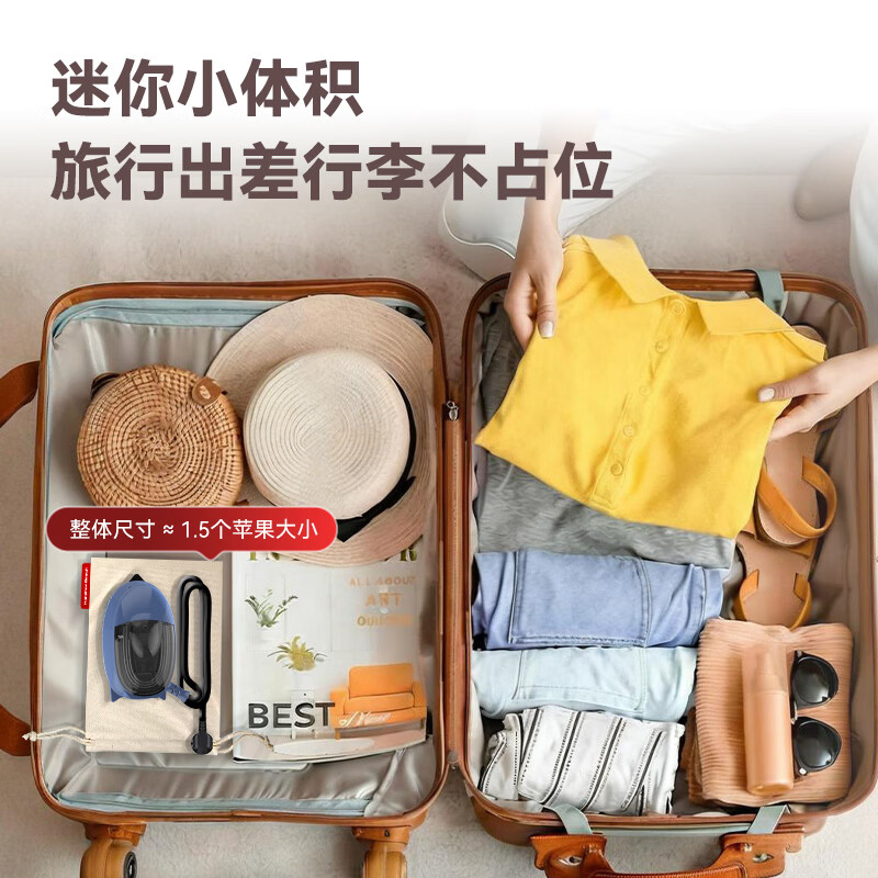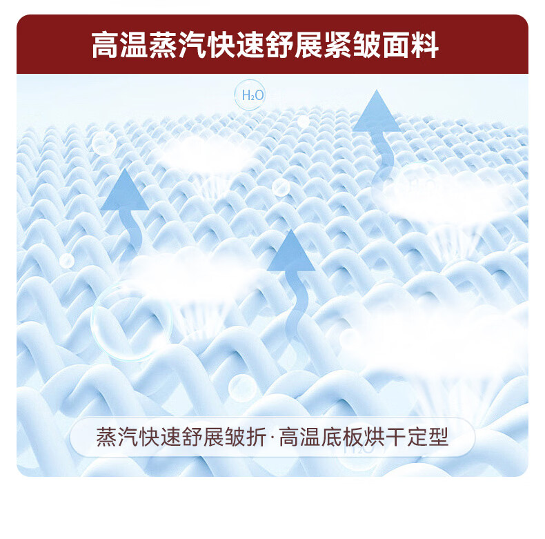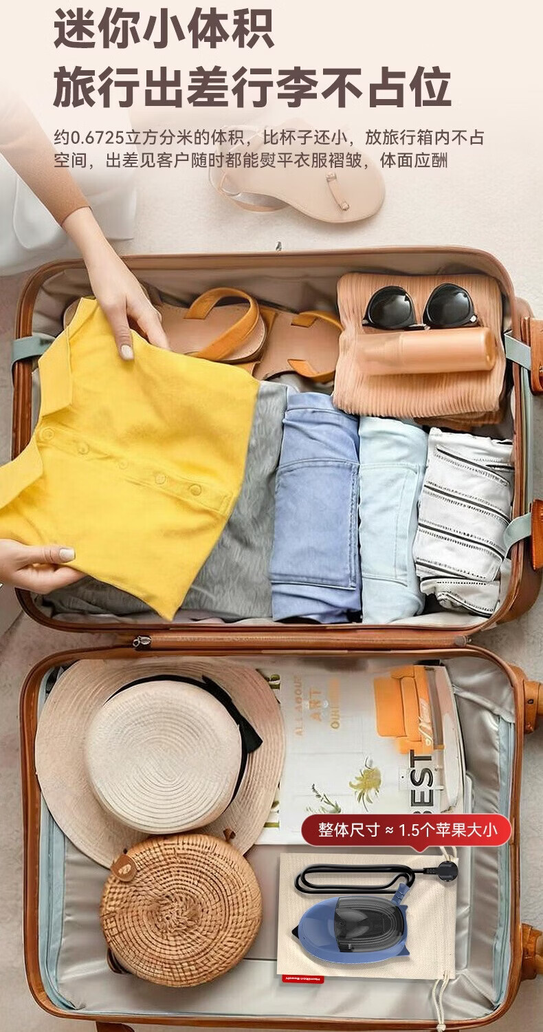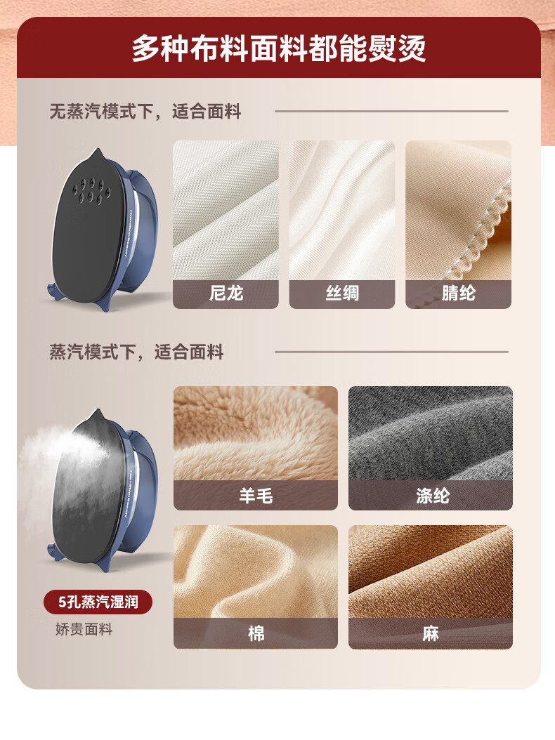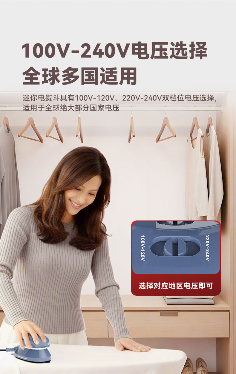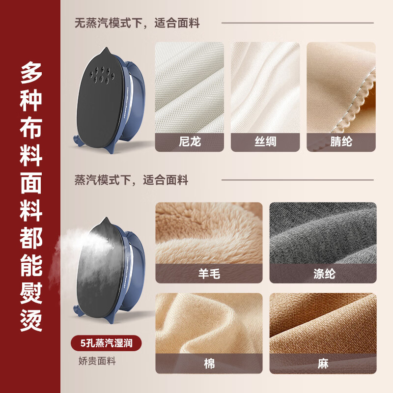 100-240V电压选择,全球多国适用;蒸汽和烘干2合一,数分钟皱衣服变平直“新衣”;约70秒加热时间,约8分钟蒸汽续航时间;不粘底板+5孔蒸汽,熨烫顺滑,热量均匀