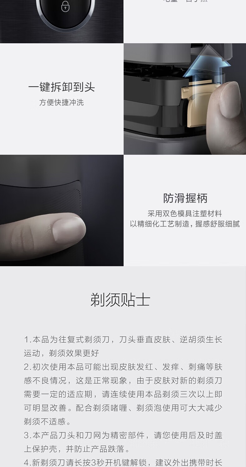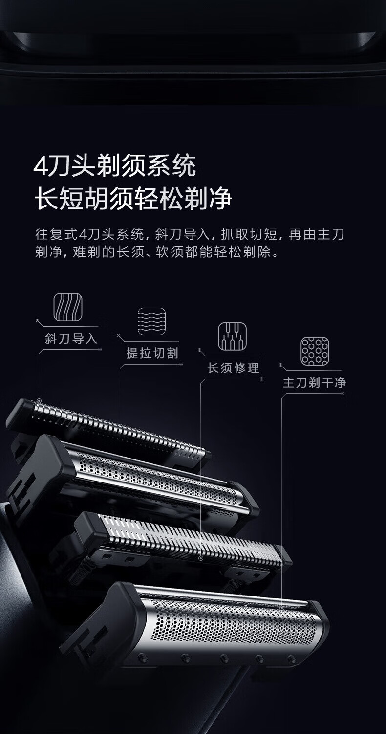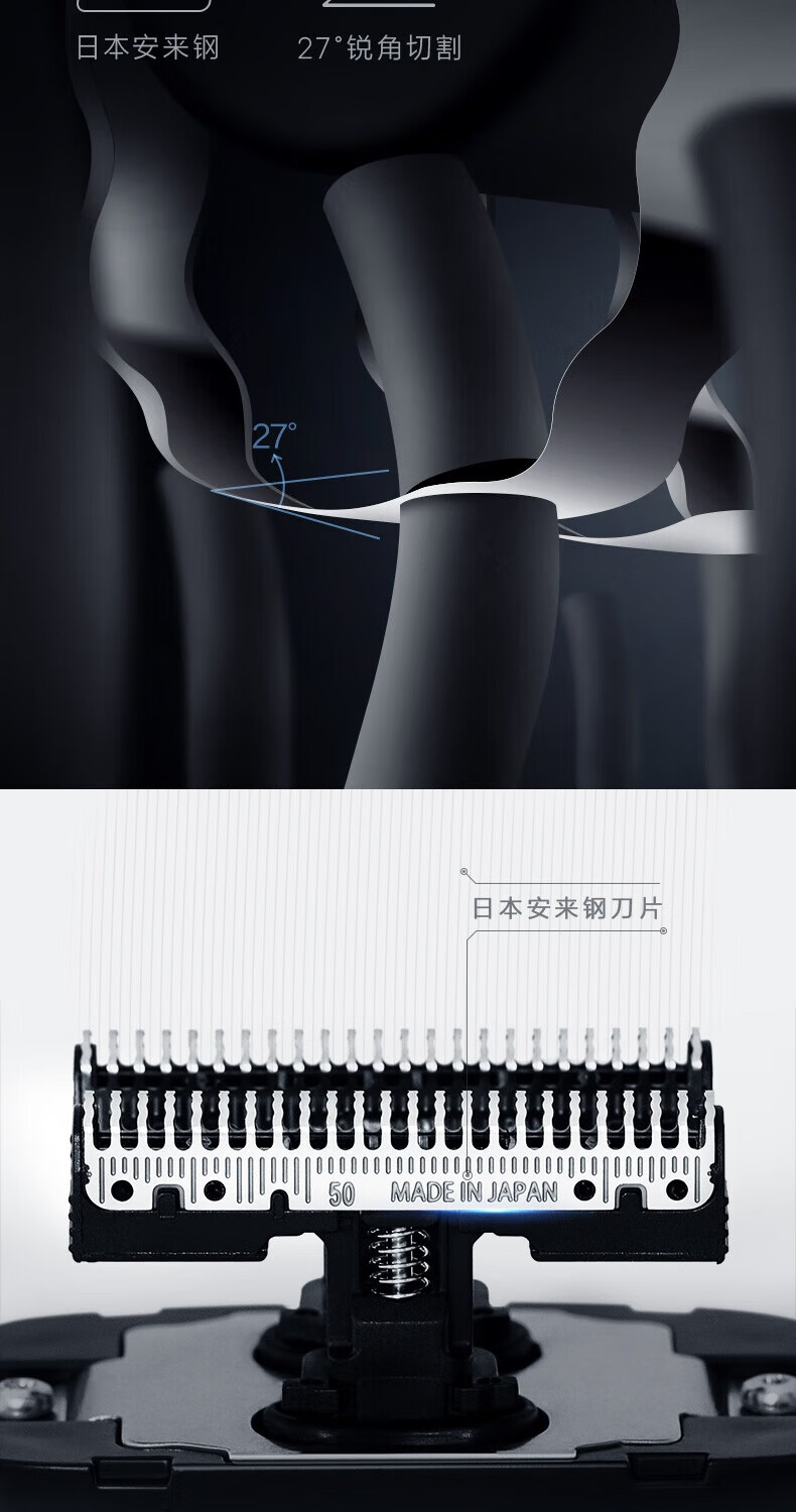 不锈钢27°锐角刀头;精准切剃4刀,全面能力不挑胡须;高速声波清洗,一如新刀