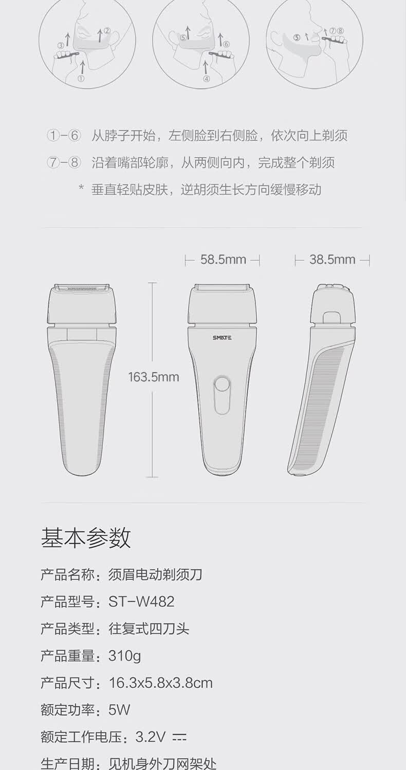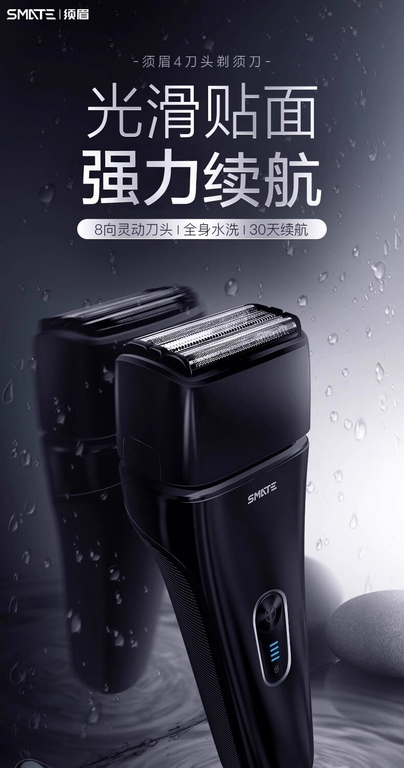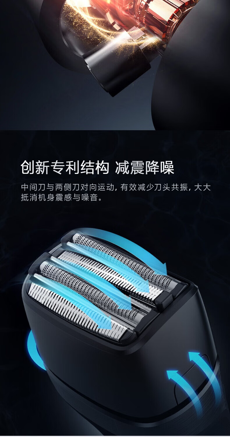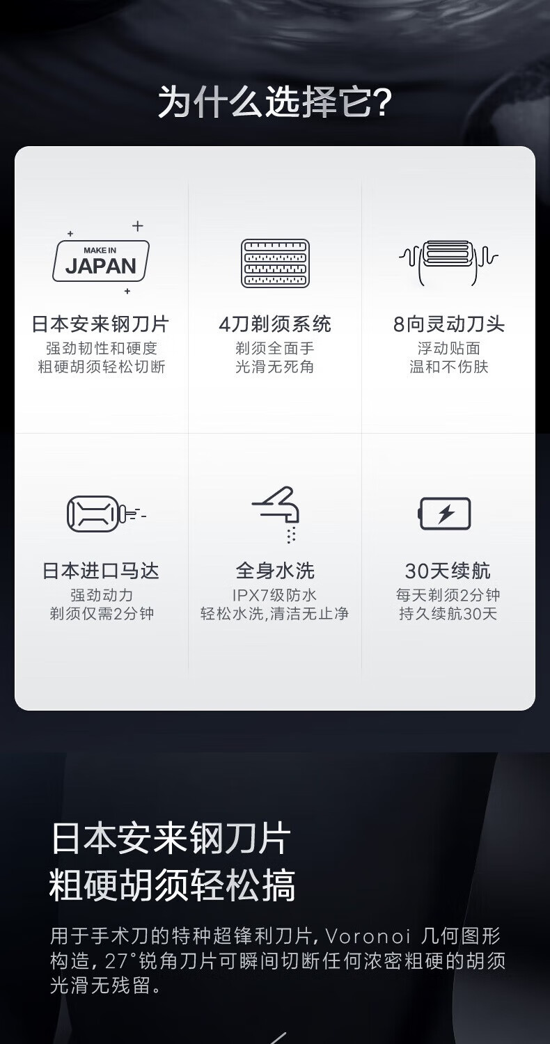 不锈钢27°锐角刀头;精准切剃4刀,全面能力不挑胡须;高速声波清洗,一如新刀