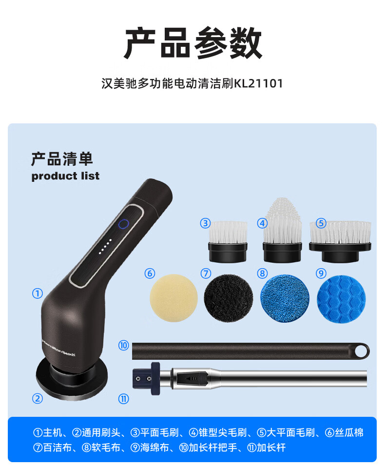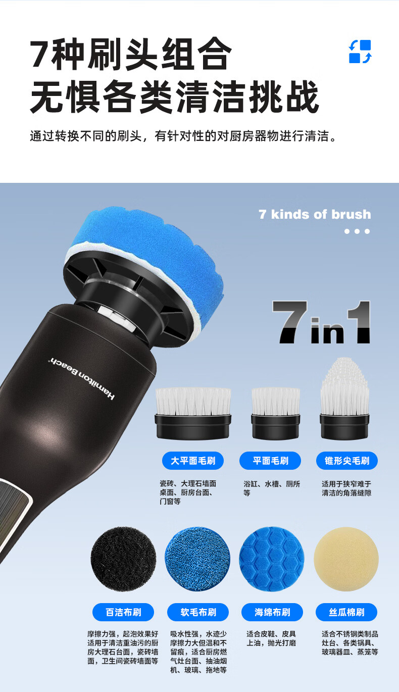 90分钟长续航,TYPE-C充电口;7种刷头可选,更有针对性的清洁不同场景;IPX5高等级防水,清洁更安心;配备伸缩杆,高处低处角落均可触达,不弯腰清洁;快慢两档清洁模式选择,400rpm强扭力电机