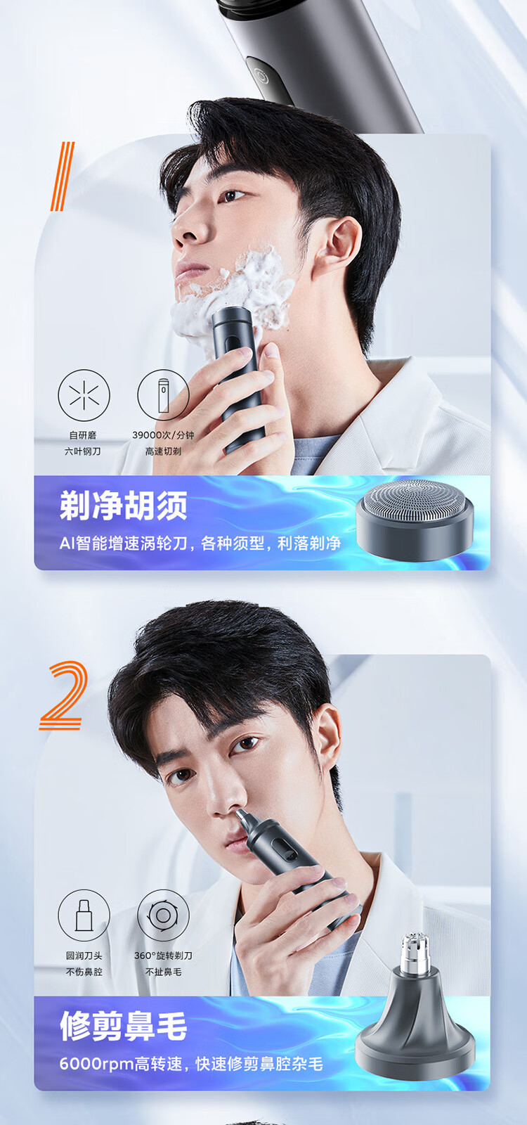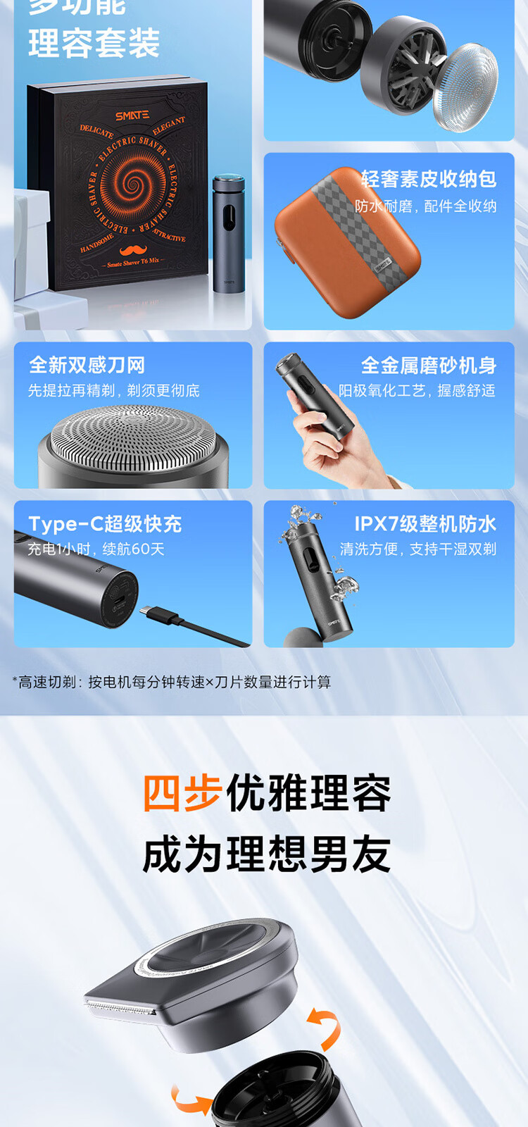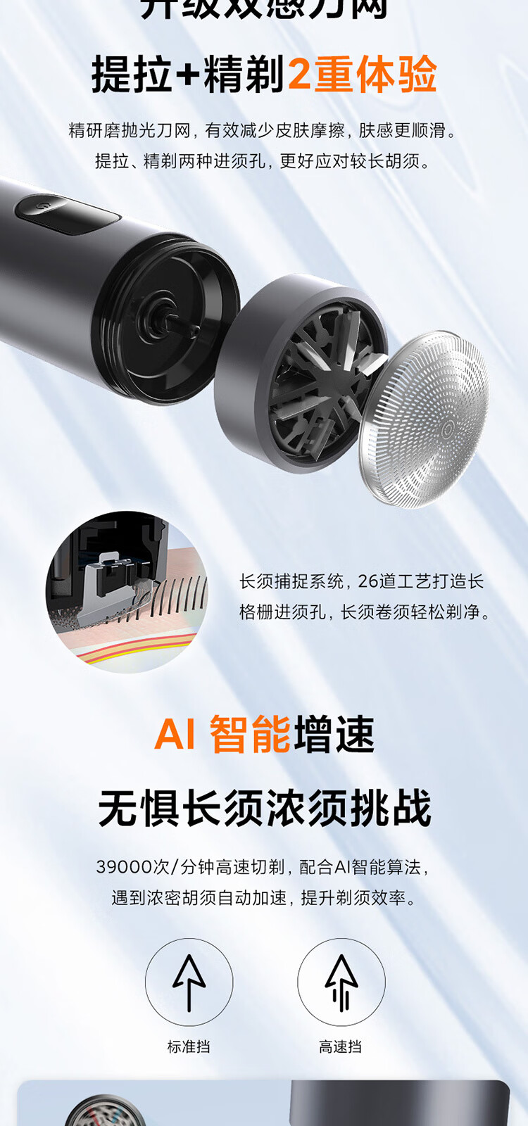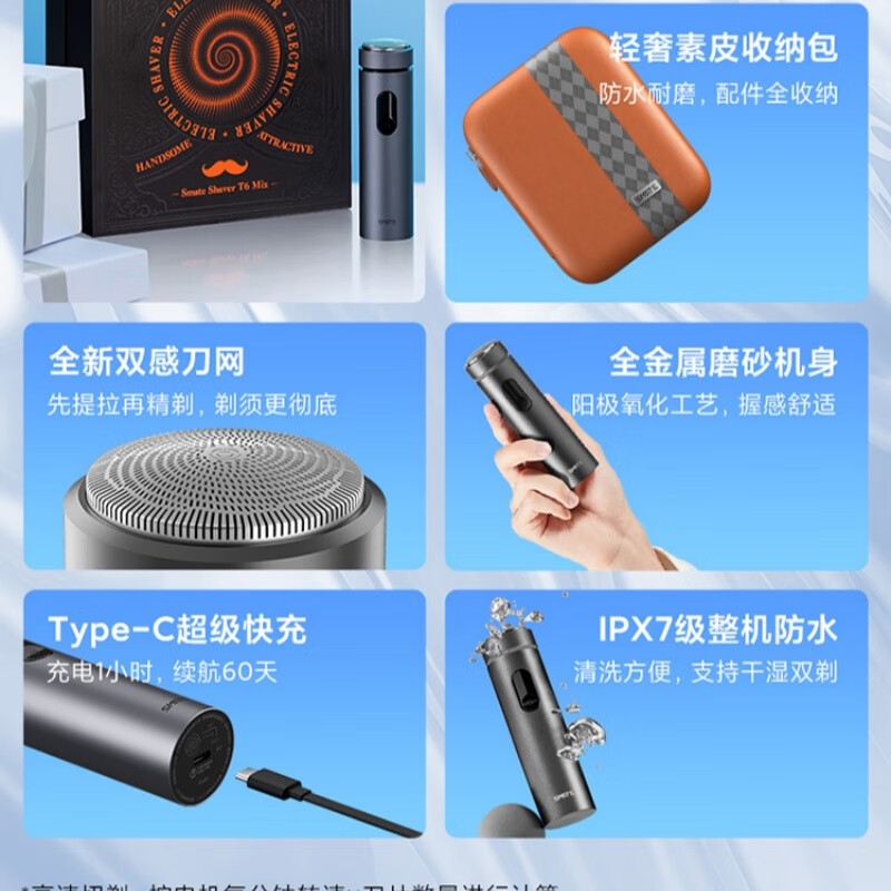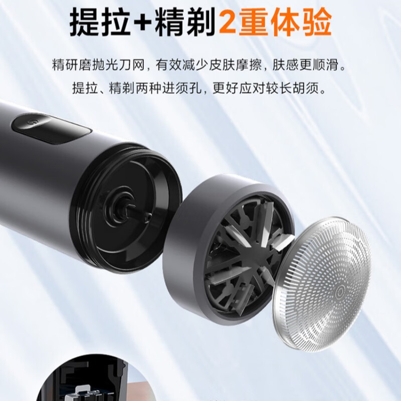 升级环保舒适双感刀网;创新ECM精密加工六叶刀片;磨砂哑光质感铝合金机身