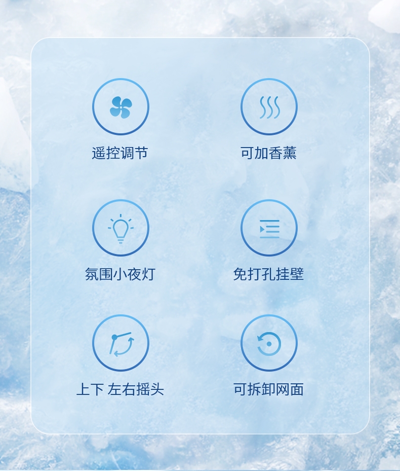 六档风速调节智能风一键随心控,高效空气循环带走热气;远程遥控夏日更加舒心,随手调节日常简单便携随心所欲;内置可拆换香薰片香气弥漫扑鼻,调节情绪舒缓夏日焦躁;免打孔壁挂安装方便,桌面挂壁两用,轻松应对各种场景;贴心小夜灯设计,一键自动左右摇头,上下可调广角送风