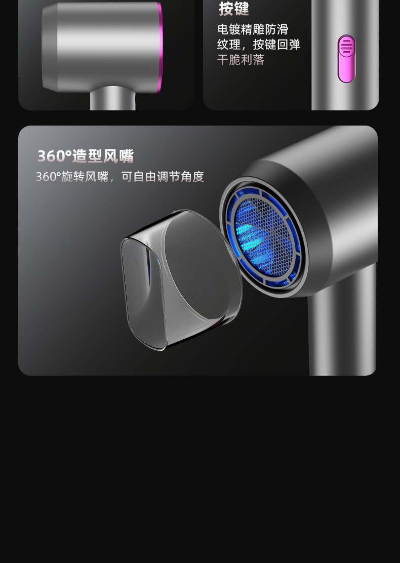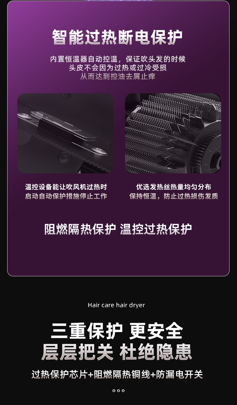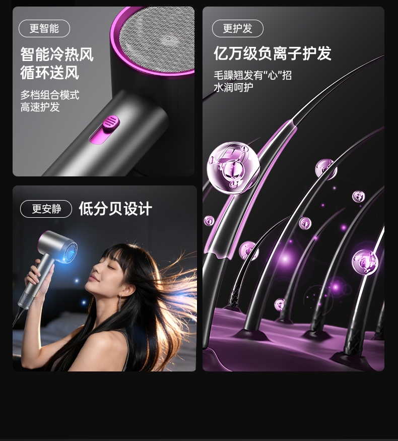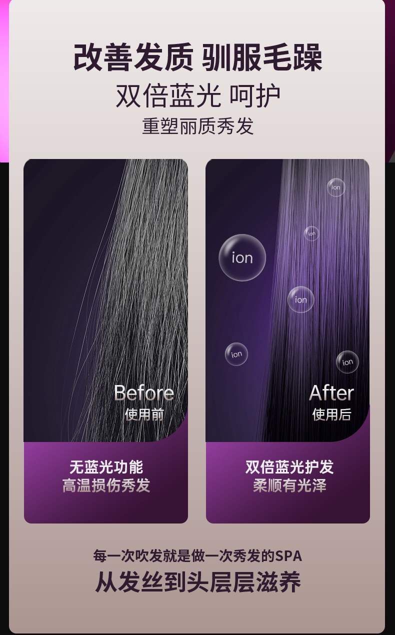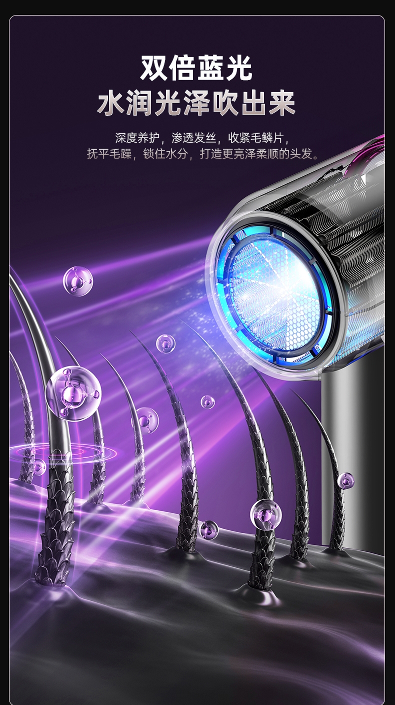 双杯蓝光千亿负离子护发;大风力轻音;智能温控电子元件保护更安全