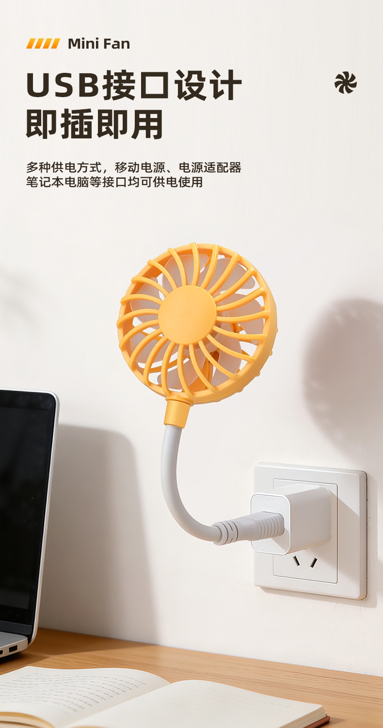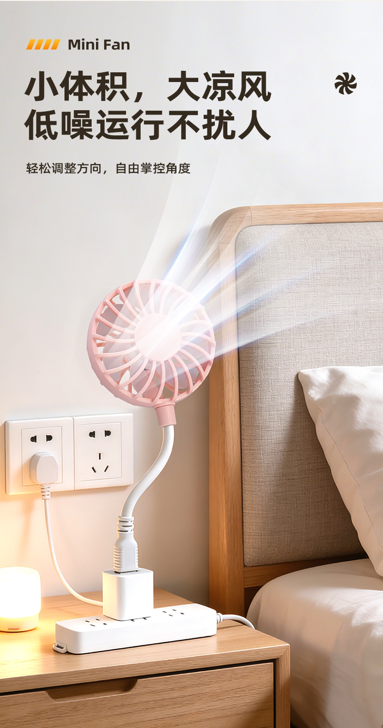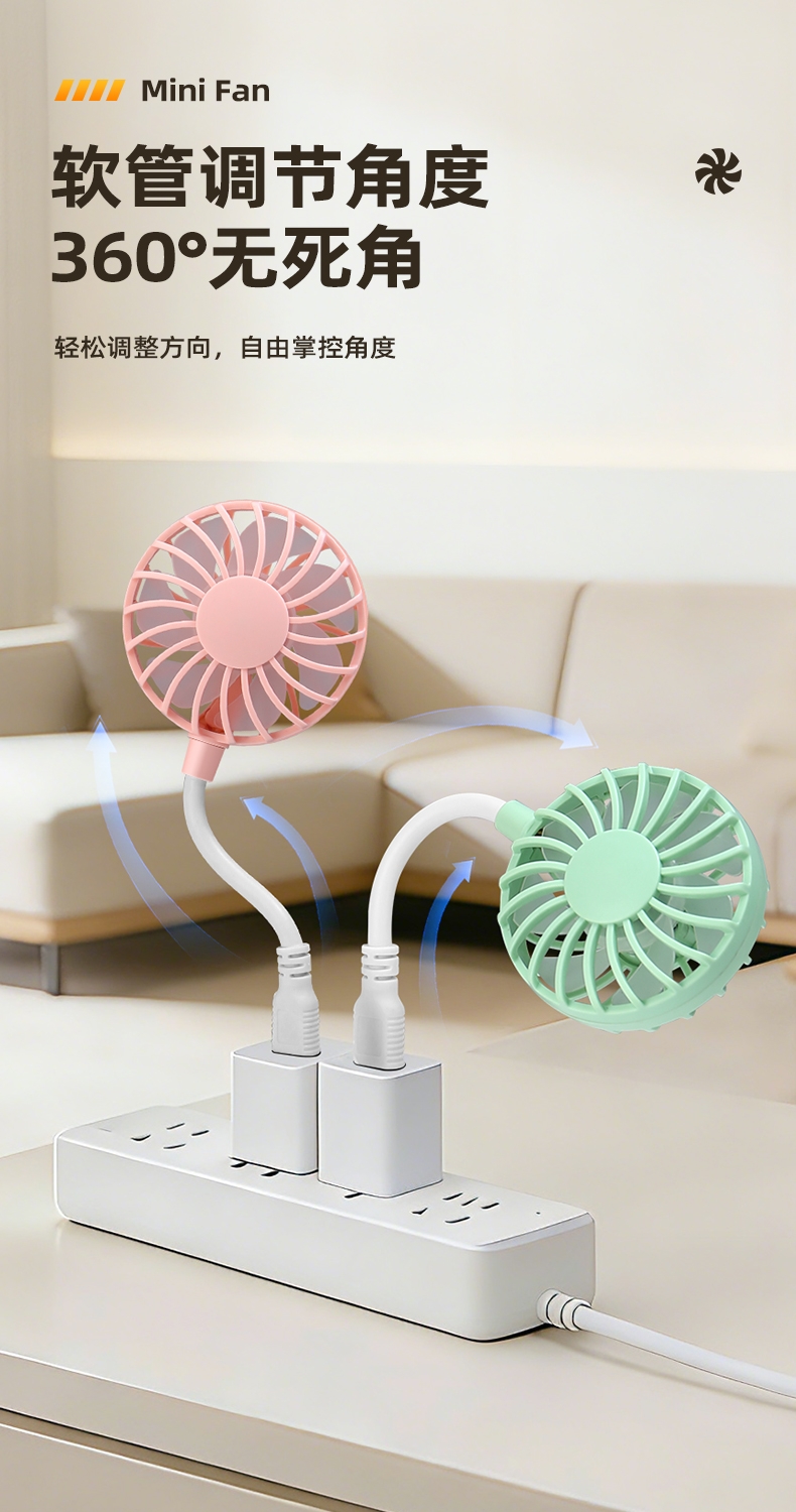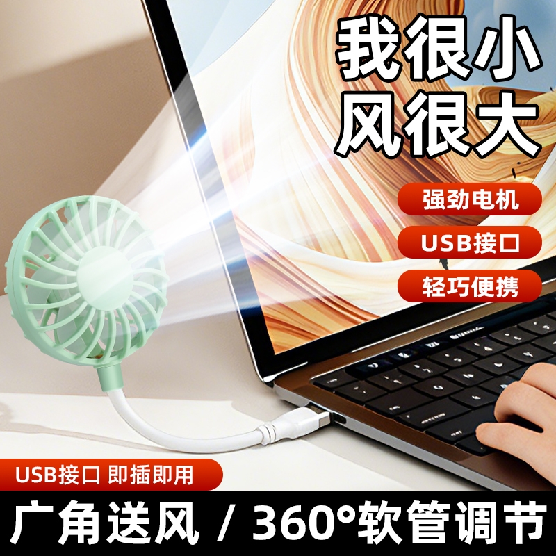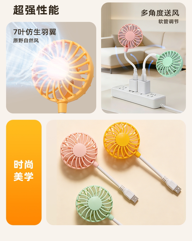 七扇叶大风力USB便携小风扇;强劲电机风速高风量大;360°软管可调节
