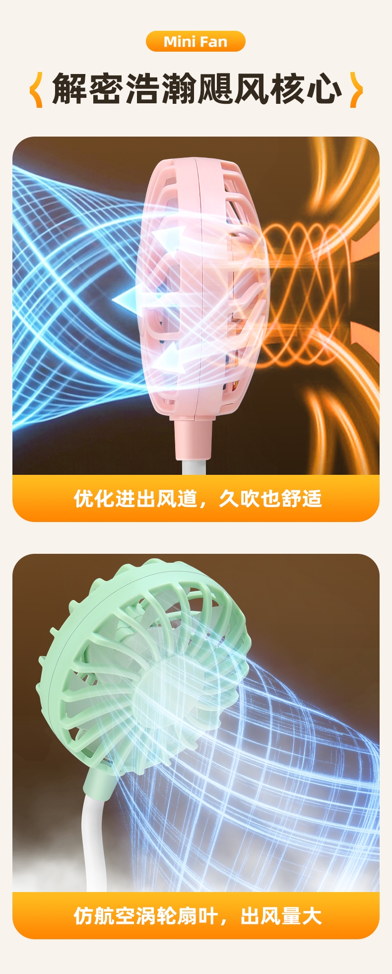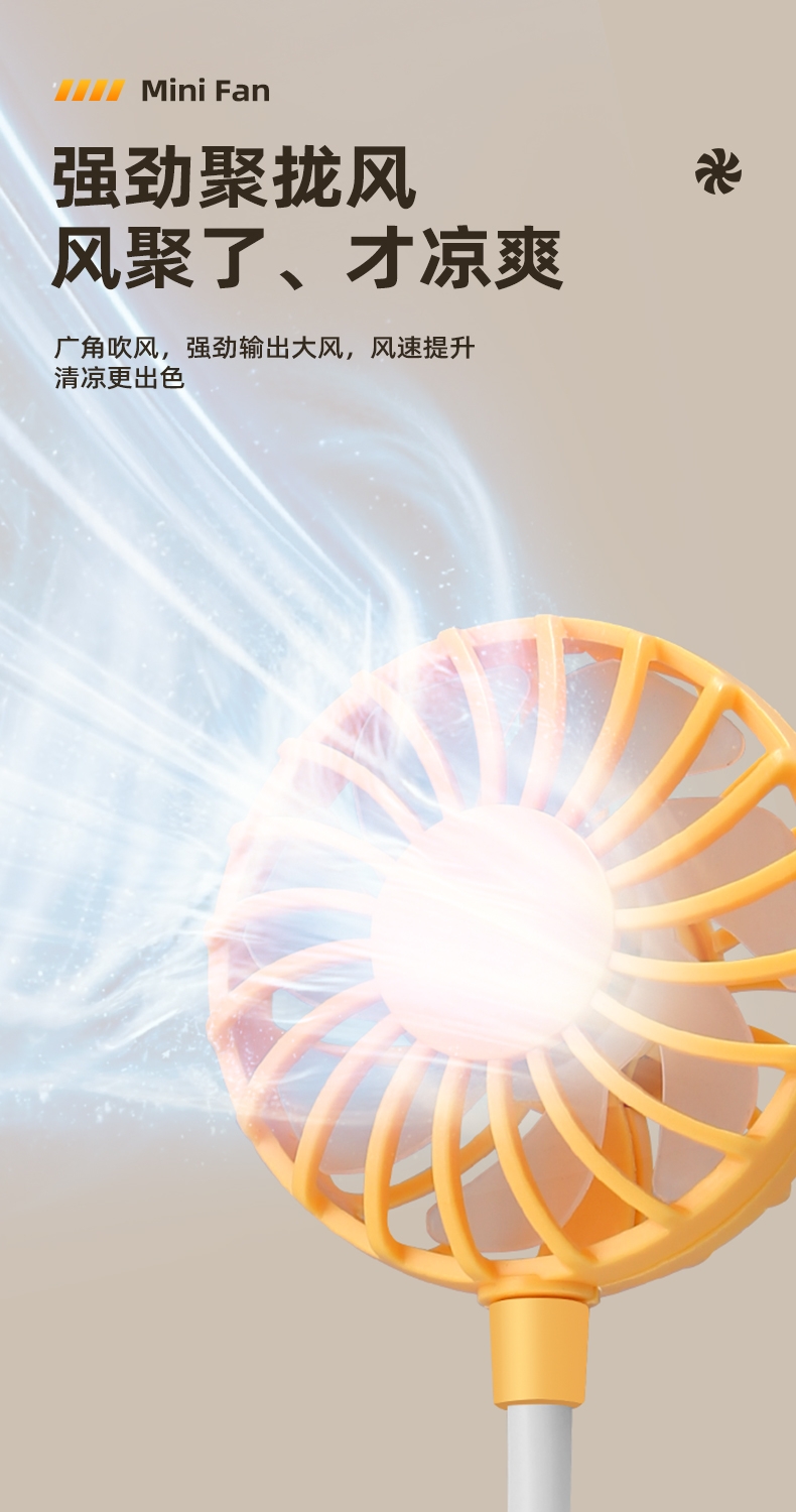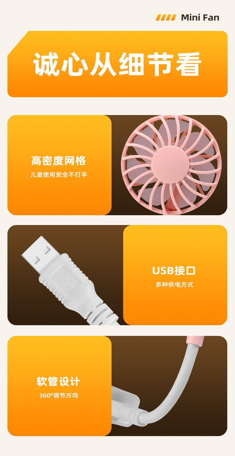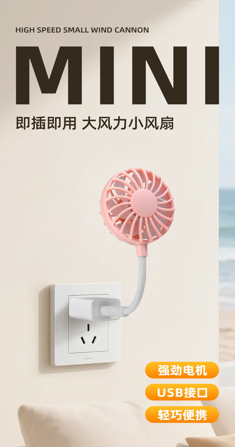 七扇叶大风力USB便携小风扇;强劲电机风速高风量大;360°软管可调节