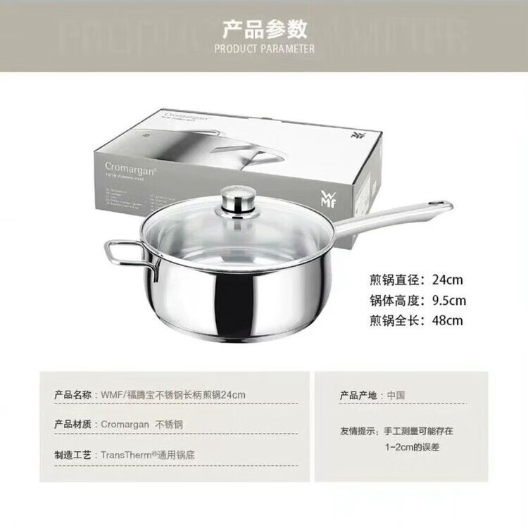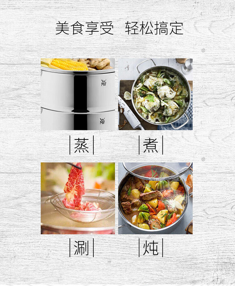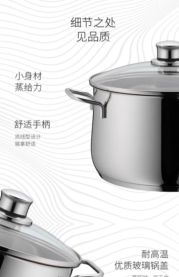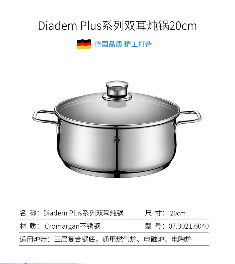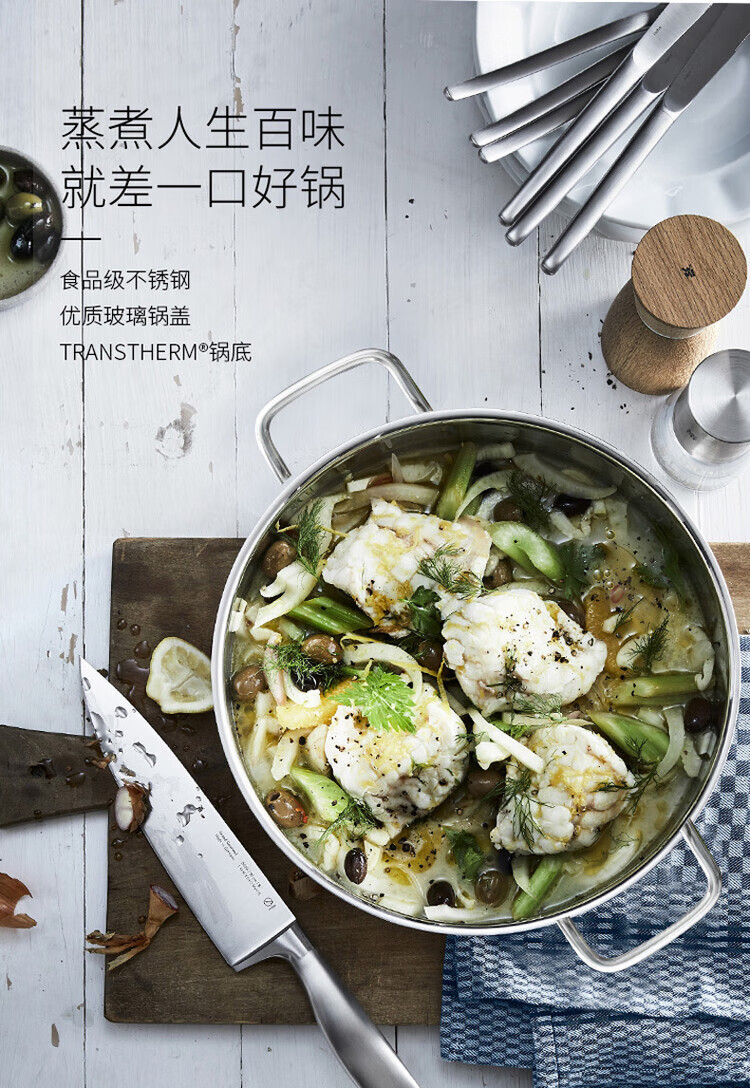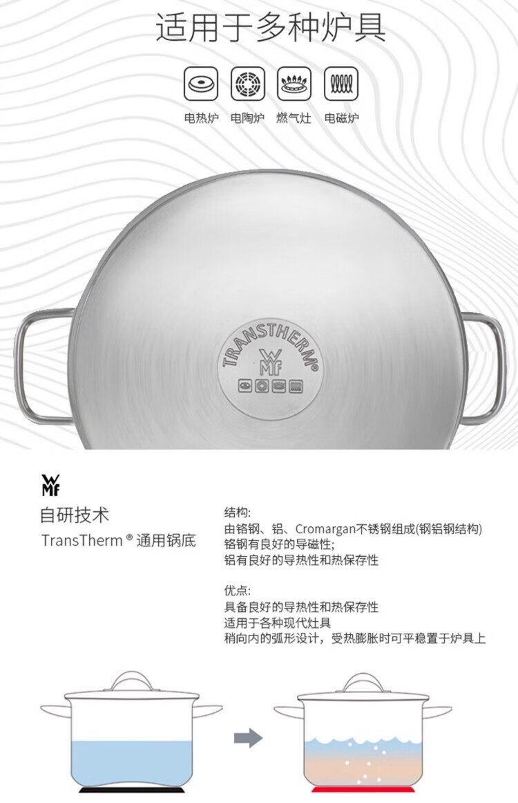 锅身使用Cromargan18/10不锈钢材质;采用耐高温材质的玻璃盖锅体,内壁使用圆弧角设计 ;采用TransTherm®通用锅底材质,快速导热;适用于煤气灶、电磁炉、红外线炉等多种灶具