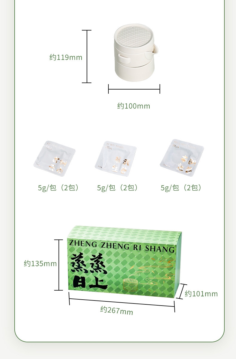 配置:蒸笼茶具*1 5g古树云白*2 5g易武生普*2 5g布朗熟普*2