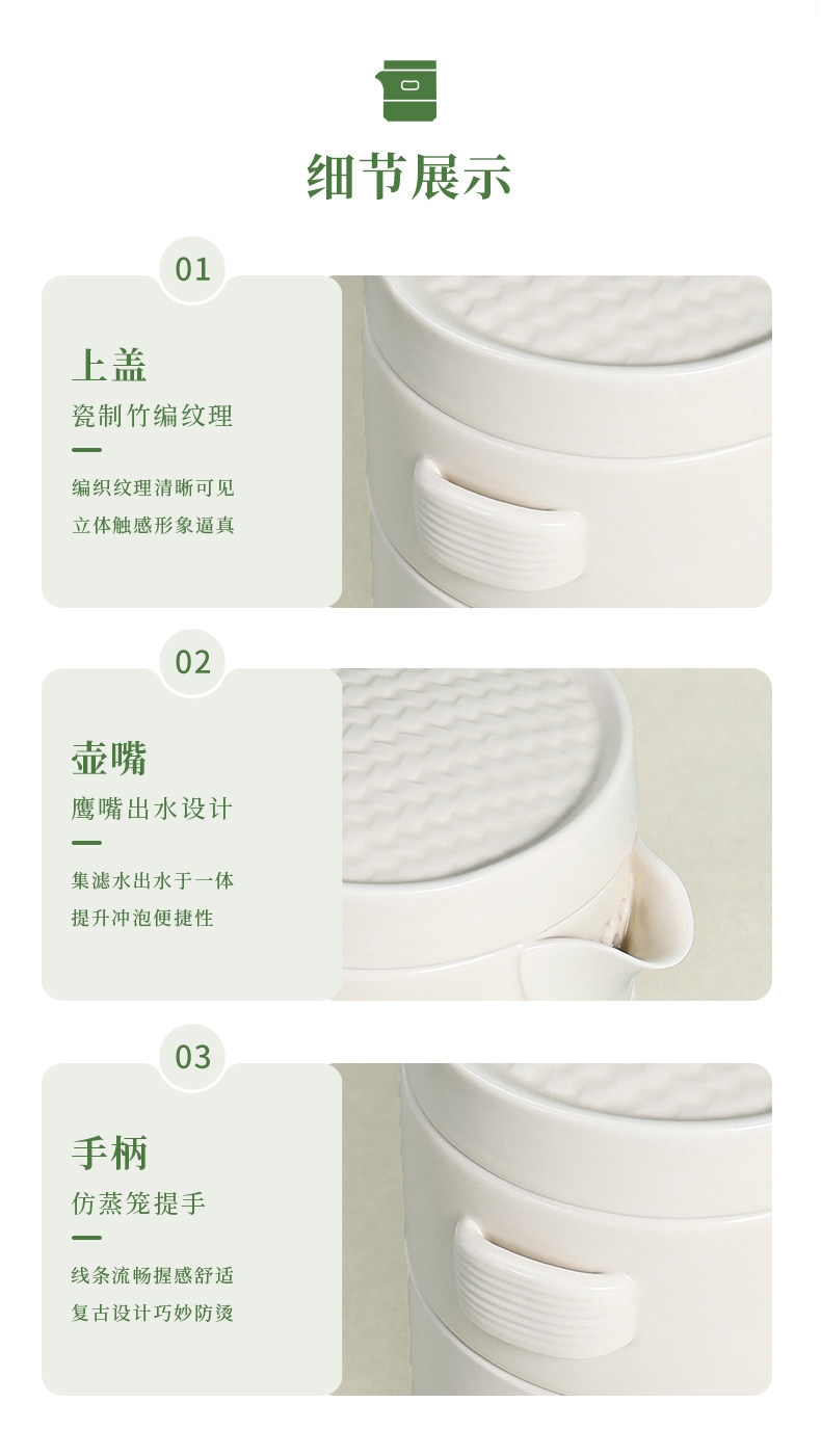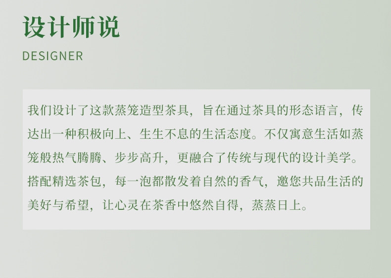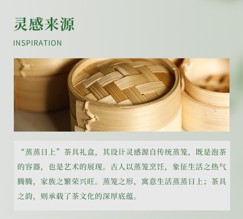 蒸笼之形,寓蒸蒸日上;茶具之韵,承深厚底蕴;蒸笼茶具,古韵今风。于茶香中悠然自得,蒸蒸日上