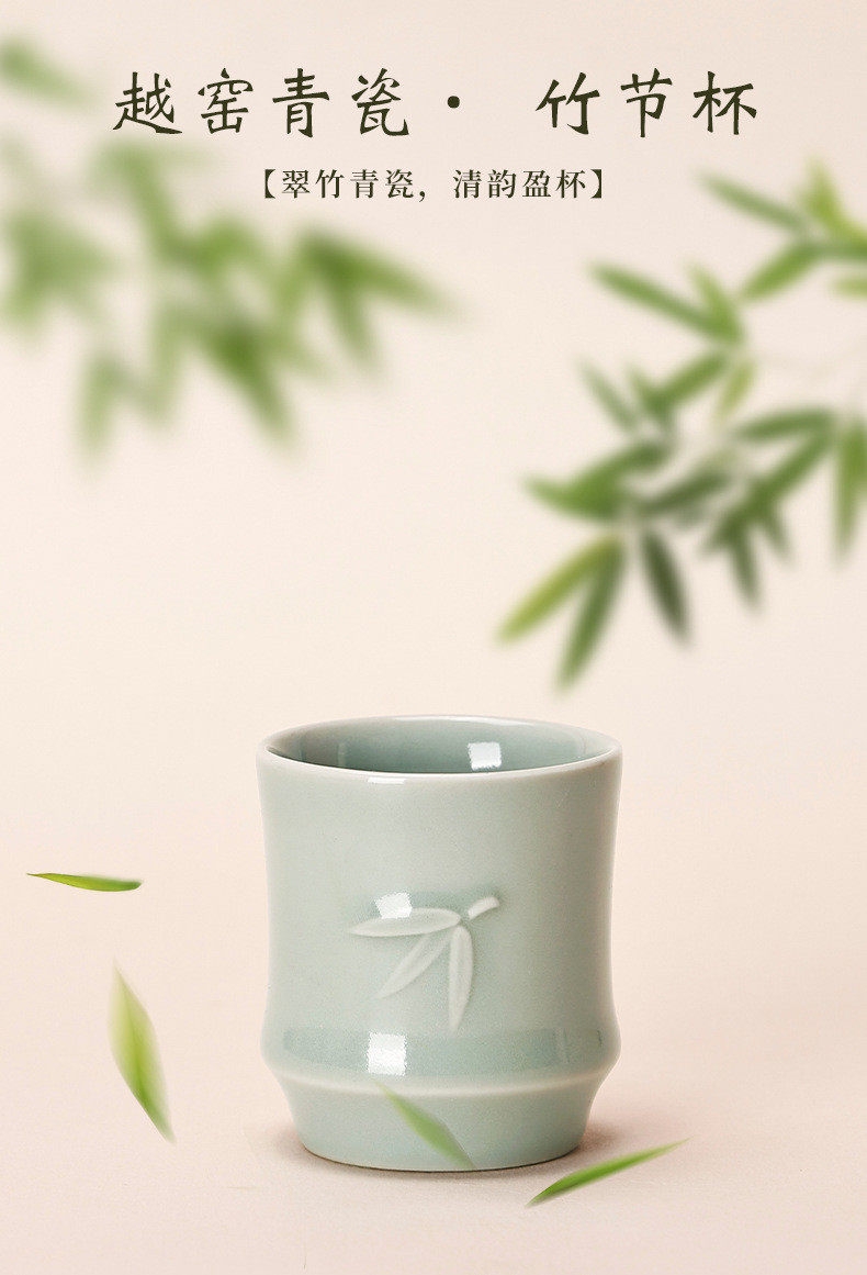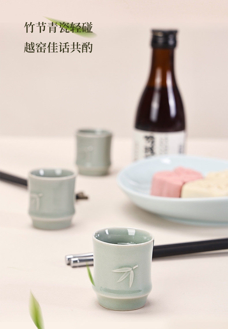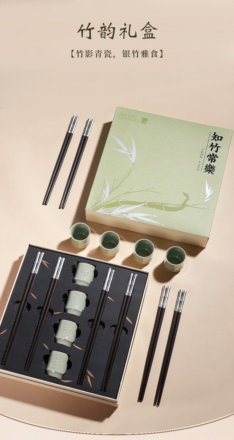 青瓷温润如玉,竹节线条流畅;紫光檀木筷,银竹雅饰,箸间风华;越窑青瓷竹节杯,翠竹青瓷,清韵盈杯