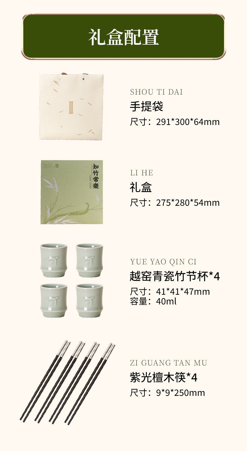 配置:竹节杯*4 紫光檀木筷*4