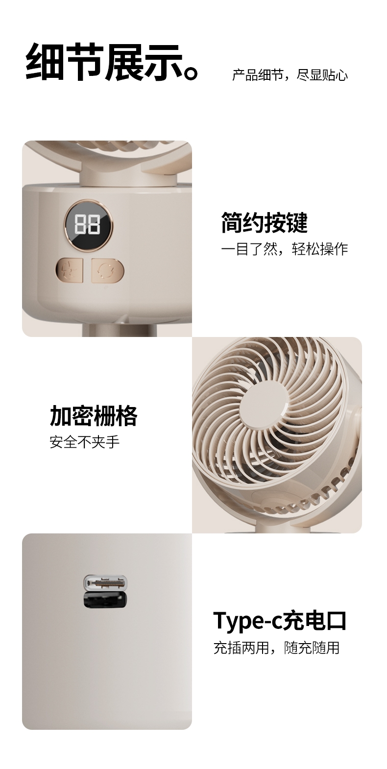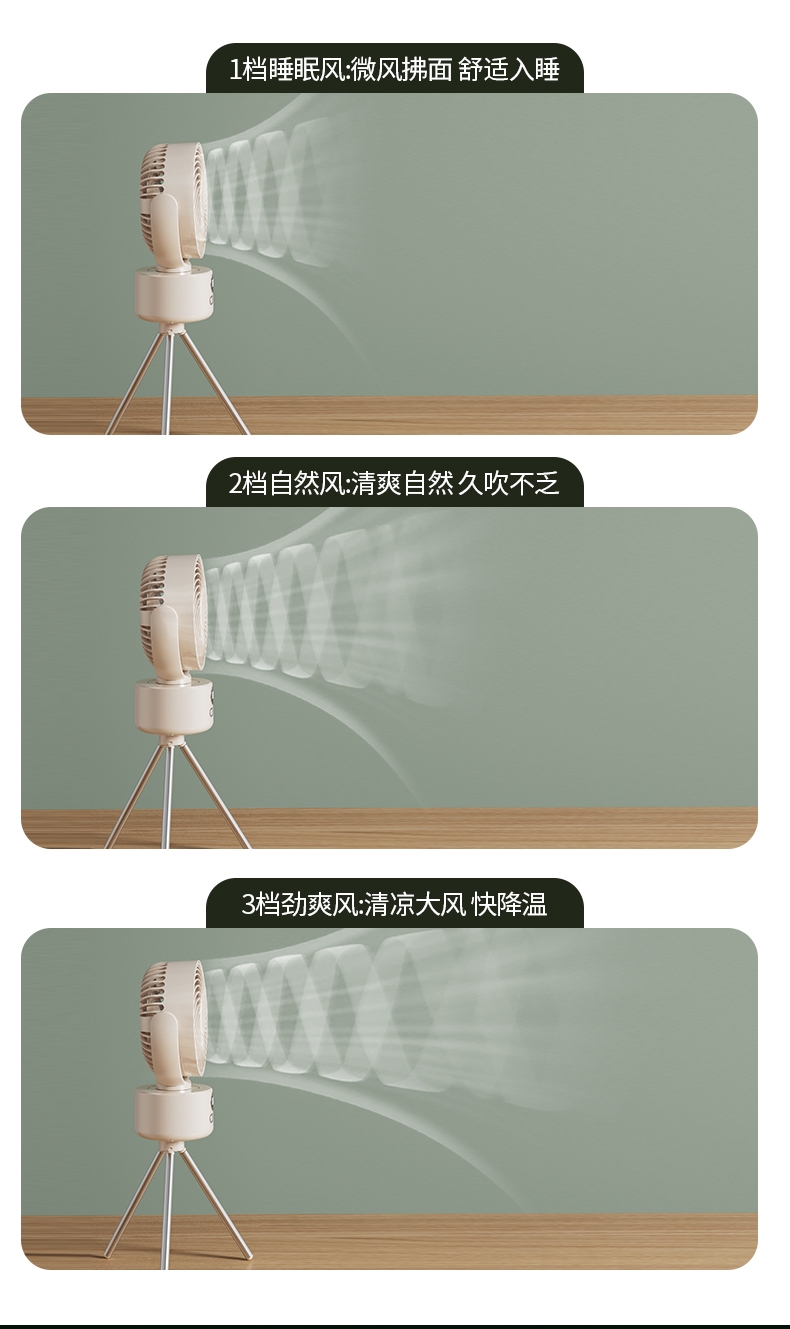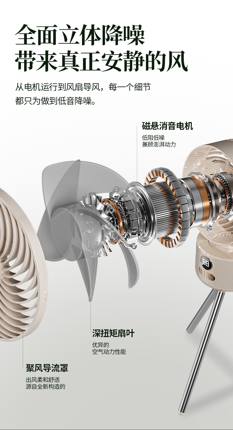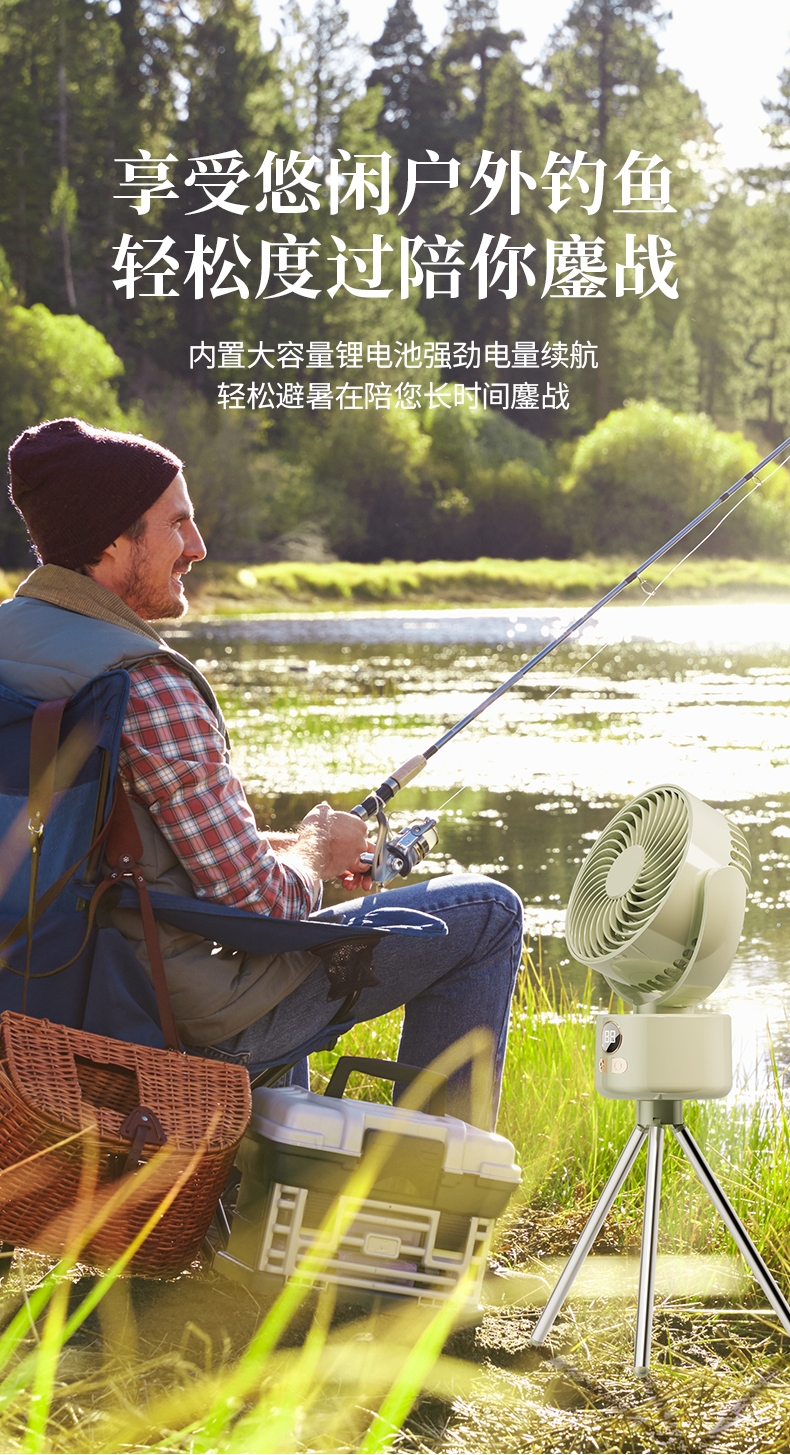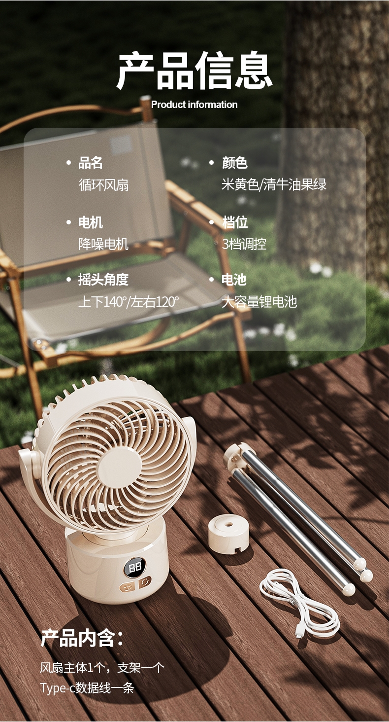 多方位角度自由风向调节上下左右送风多种角度随意切换;内置大容量锂电池强劲电量长效续航,专业户外露营风扇;轻量化可拆卸式设计,户外出行方便收纳,露营轻装上阵;降噪风道工艺降低噪音风柔音轻不扰心,低噪音安静入眠;三档风力调控带动室内空气循环,瞬间赶走燥热悠然一夏